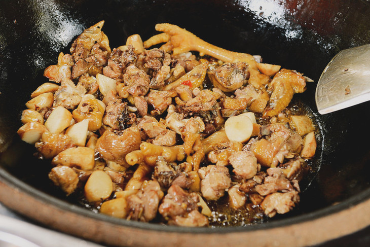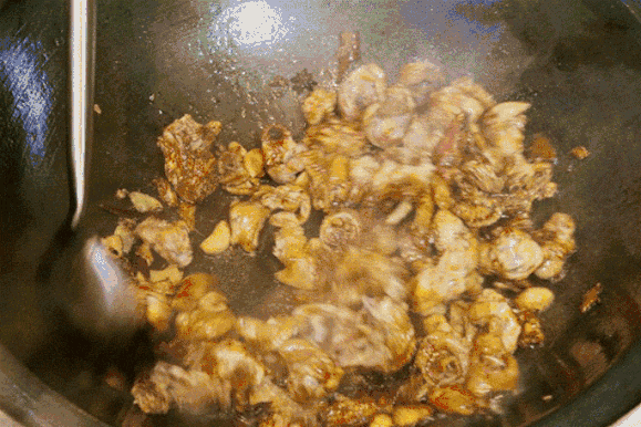 大铁锅炒土鸡的烹饪方法,使炒鸡过程中自然出油,大火均匀加热,鸡肉反渗油香,越嚼越有味。