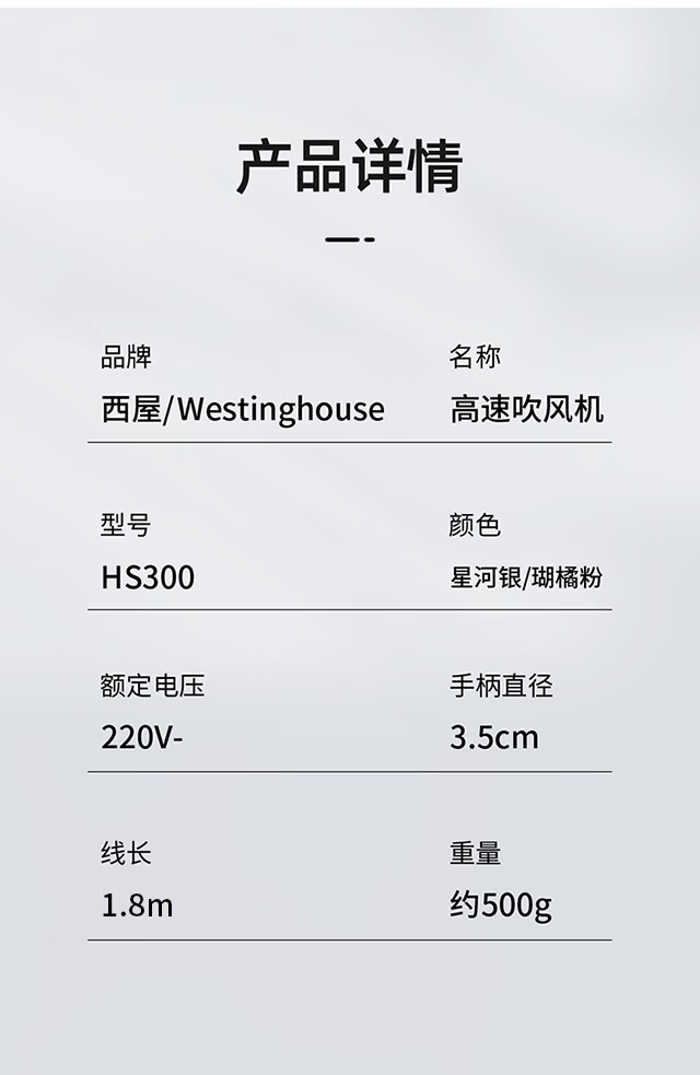 西屋(Westinghouse)网红款宿舍家用负离子大功率便携式电吹风HS300珊瑚粉/星河银