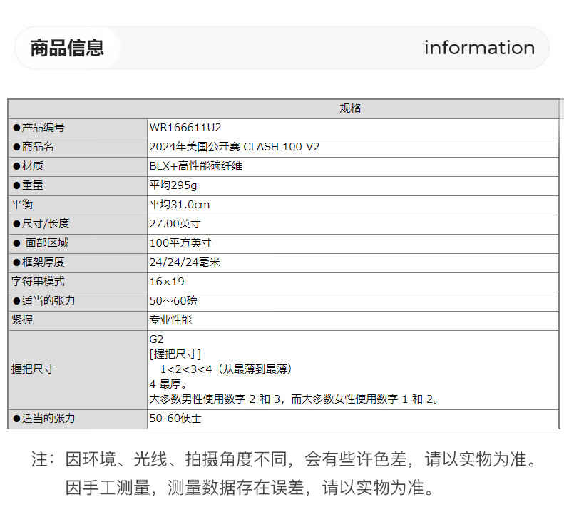 威尔胜(Wilson)网球拍碳纤维2024美网公开赛Clash 100 V2 WR166611U2专业拍