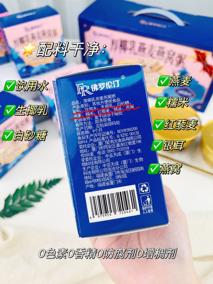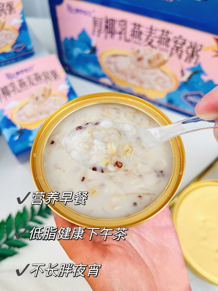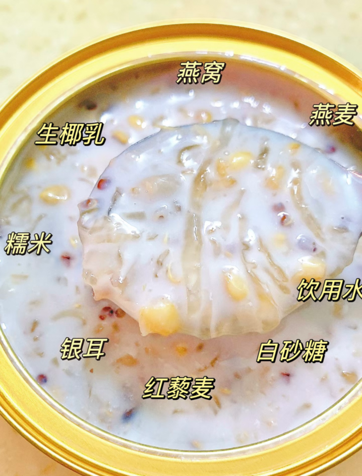 【配料】:饮用水、生椰乳、白砂糖、燕麦、糯米、红藜麦、银耳、燕窝(每碗含量:380毫克)