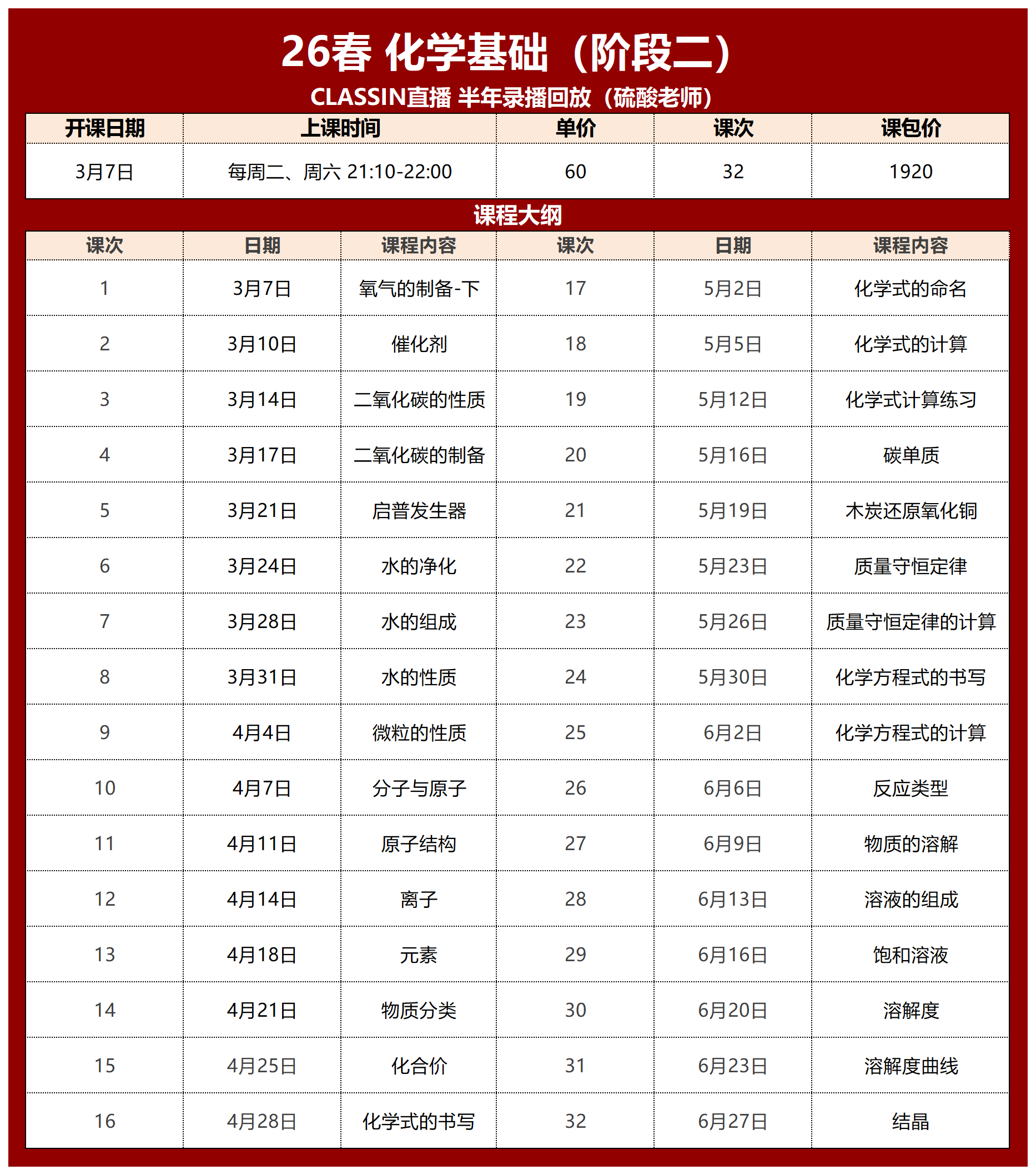 此课程共10个月四期,学完整个校内初中化学基础内容,跟校内知识点完全匹配,可作为校内化学的提前预习