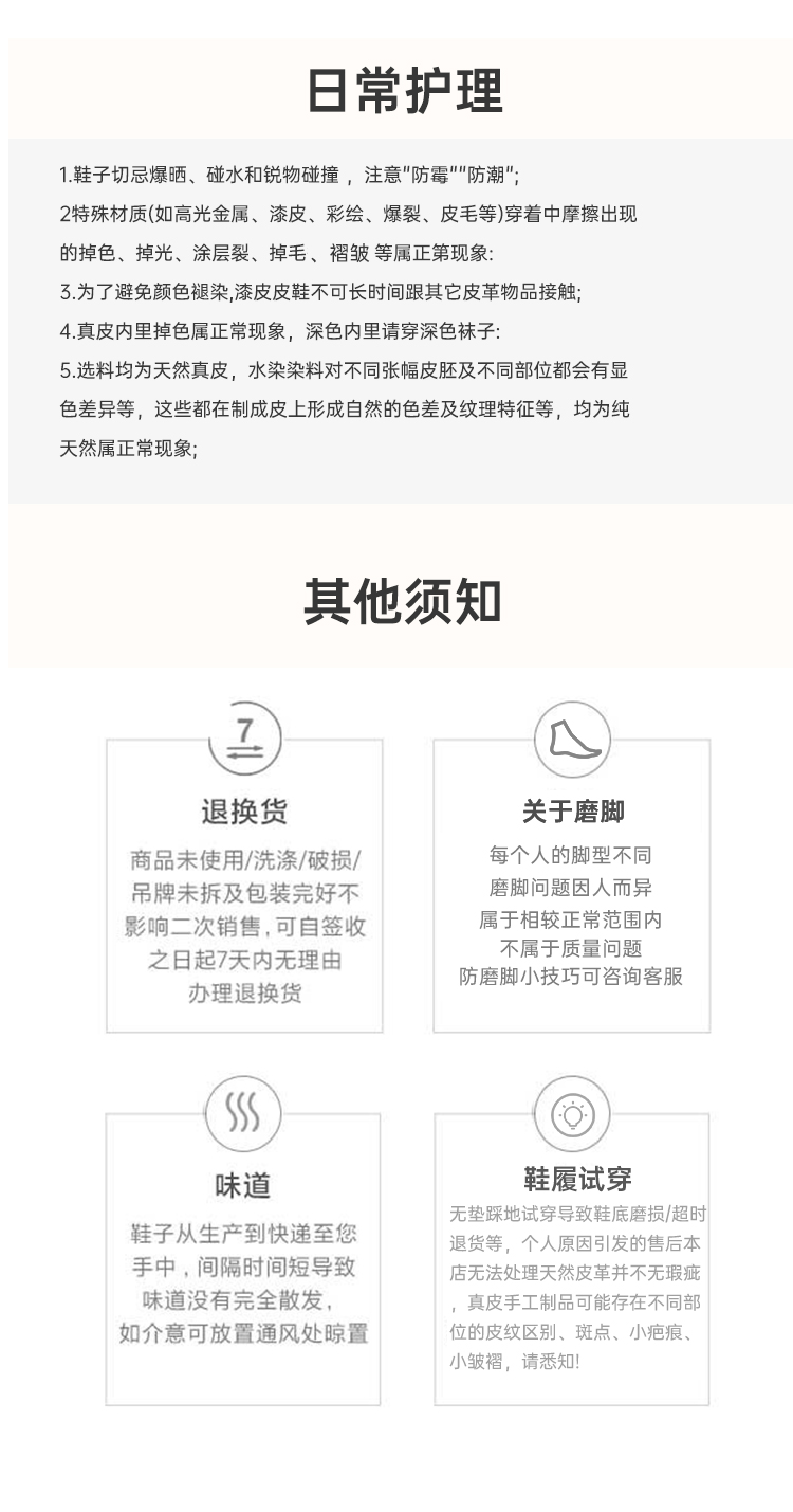 【特别提醒】试穿请用垫子垫好鞋底,在干净的地面上试穿,避免鞋底留下印子影响二次销售。鞋子都是真皮材质,不能水洗,用湿纸巾擦拭即可