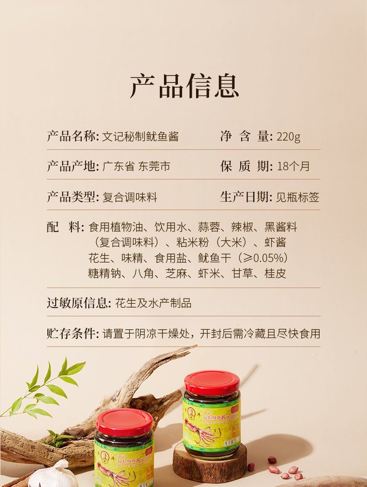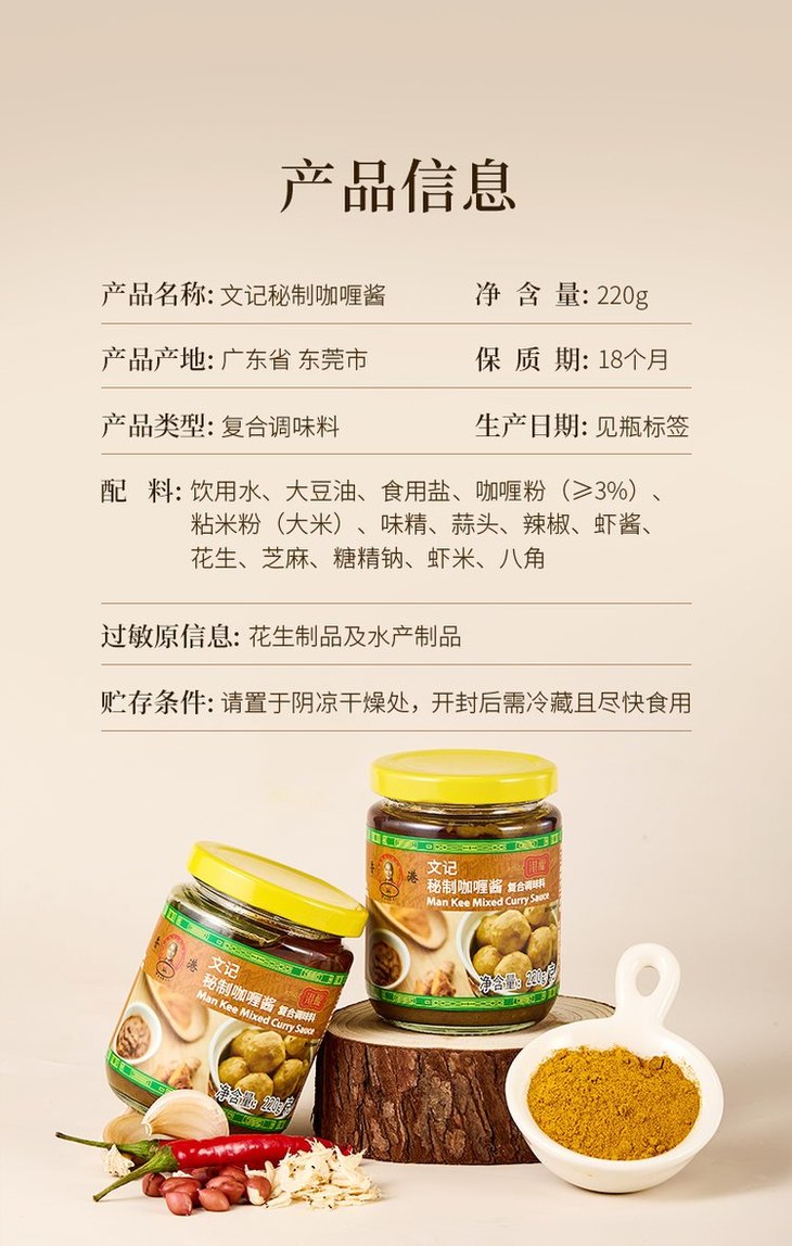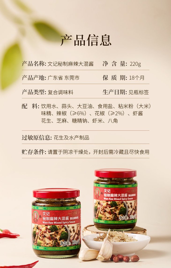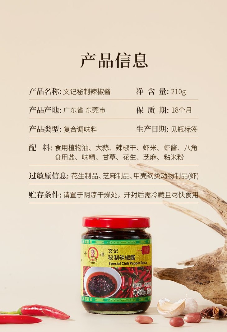 【品牌】:文记 【品名】 :香港文记秘制酱料 【规格】: 1、秘制辣椒酱210g 2、秘制麻辣大混酱料220g 3、秘制咖喱酱220g 4、秘制鱿鱼酱220g 5、秘制辣椒酱*1+秘制咖喱酱*1 6、秘制麻辣大混酱*1+秘制鱿鱼酱*1 7、辣椒酱*1+麻辣大混酱料*1+咖喱酱*1+鱿鱼酱*1 【产地】:广东东莞 【生产日期】:2025.10.27 【保质期】:18个月 【发货地】:广东东莞 【发货时效】:72小时 【发货快递】:中通快递 【不发货地区】:新疆 西藏 海南 【售后规则】: 1.请当面验收快递,如发现快递严重破损,请勿签收;若不影响食用,可签收后24小时内拍照(运单号、内容物)反馈客服赔付相应损失 2.出单号并揽收发货后不支持拦截、撤单、拒收 3.如因个人原因造成的延误,损坏、变质等问题,不在售后范围,个人口味喜好问题,不在售后范围 4.团购特价产品,非产品质量问题不支持7天无理由退换