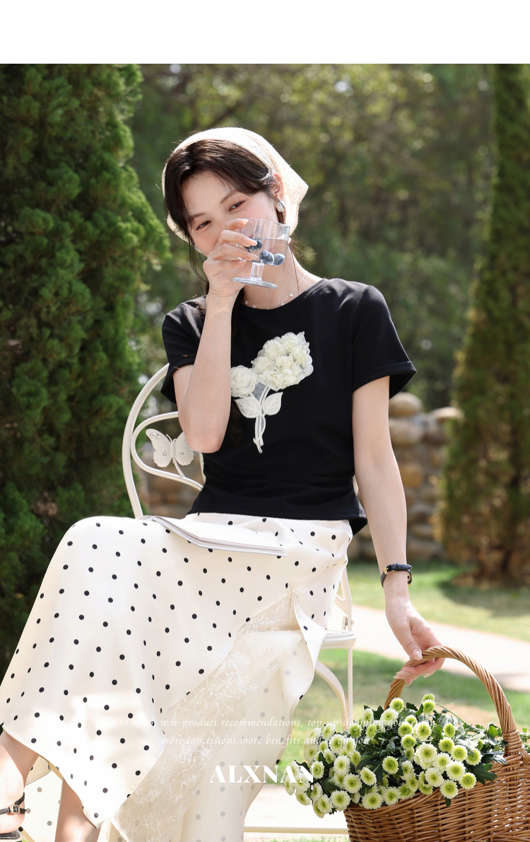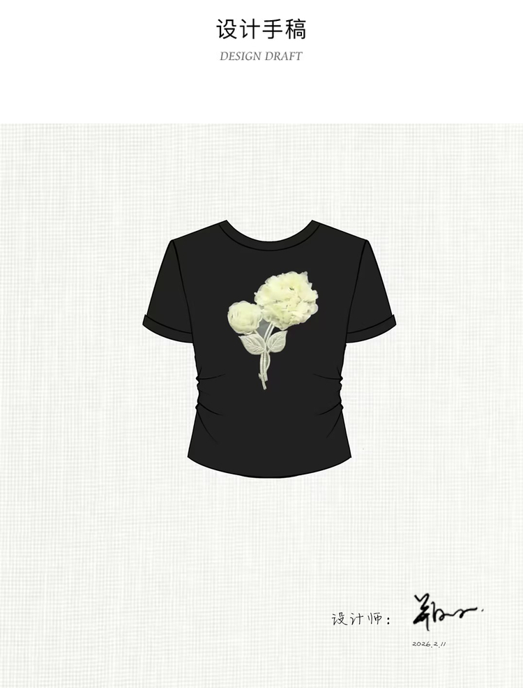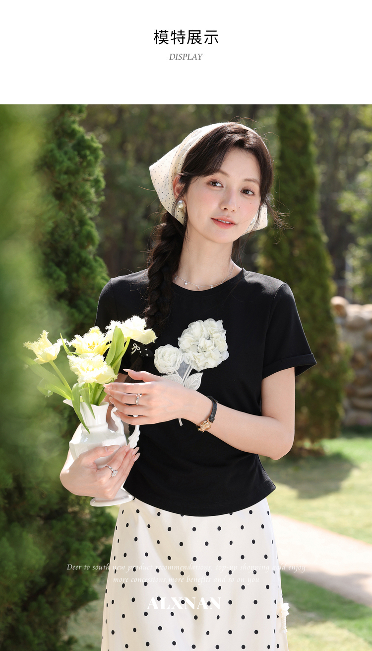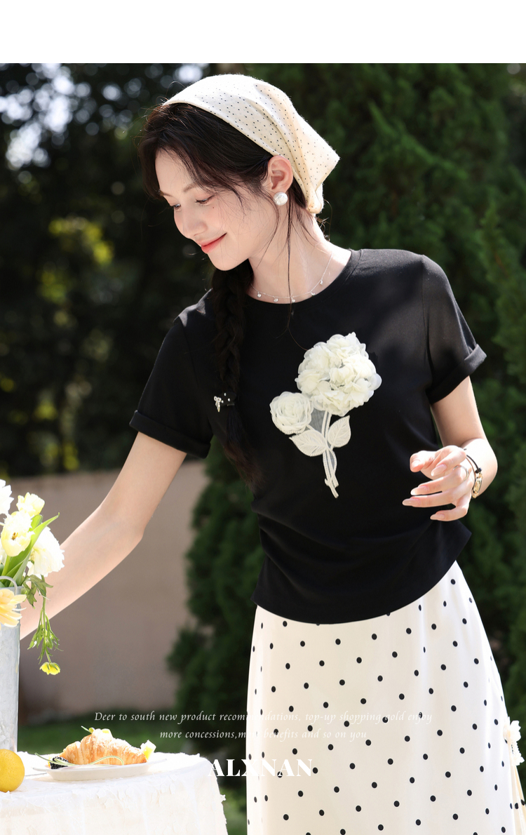 鹿向南「夏日花束」立体花朵黑色短袖T恤女2夏季新款温柔显瘦上衣