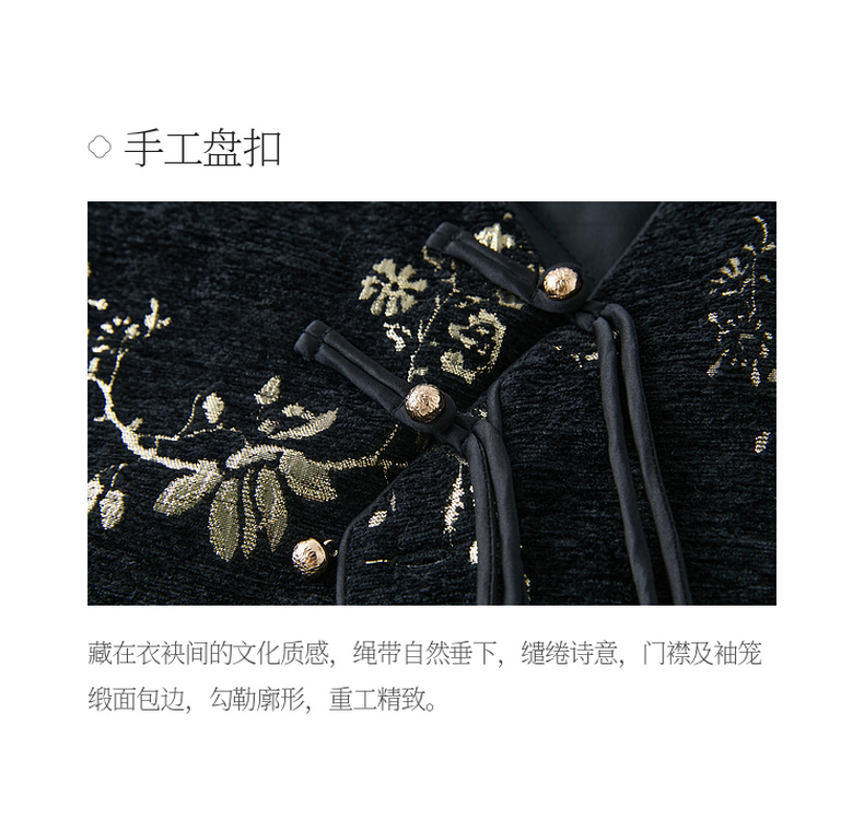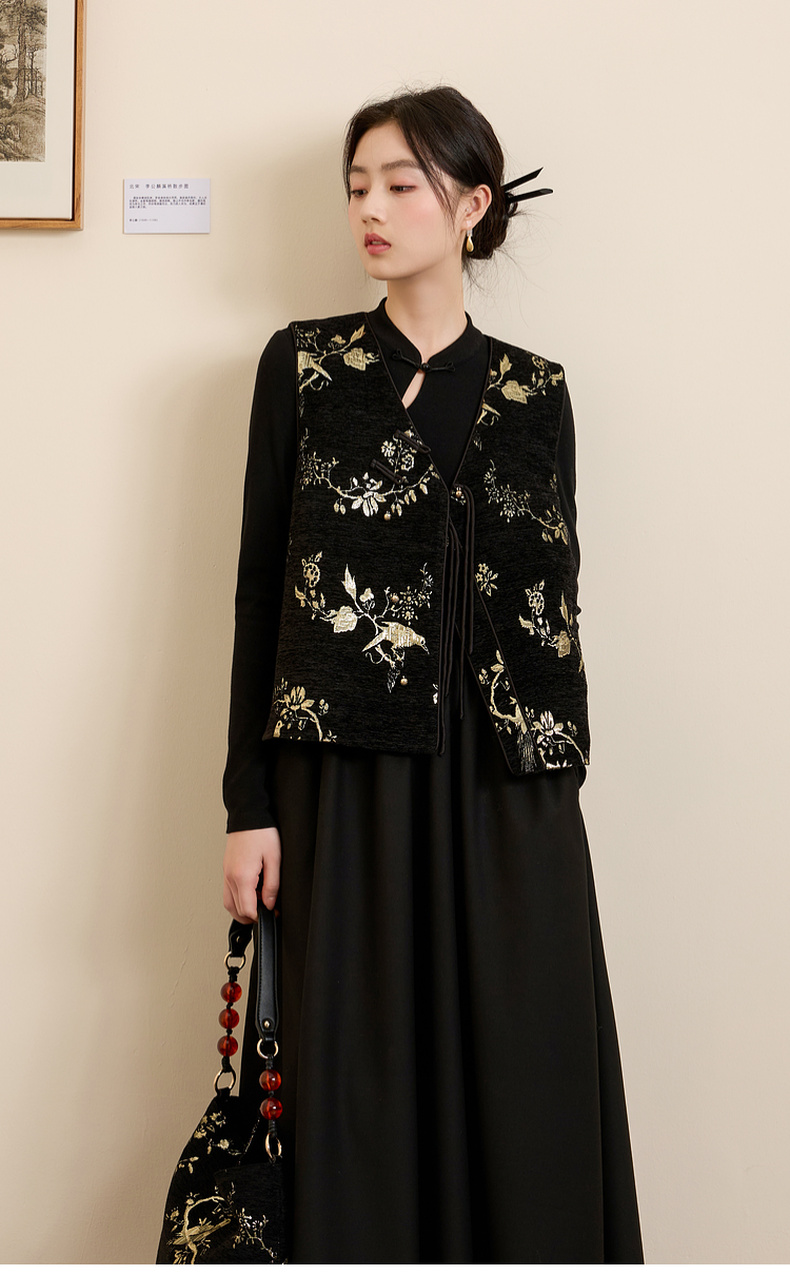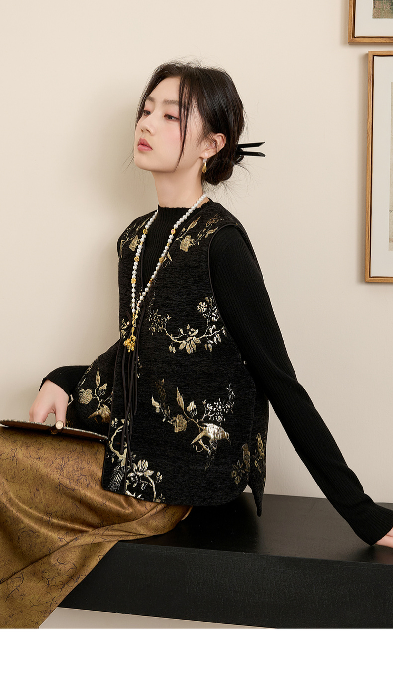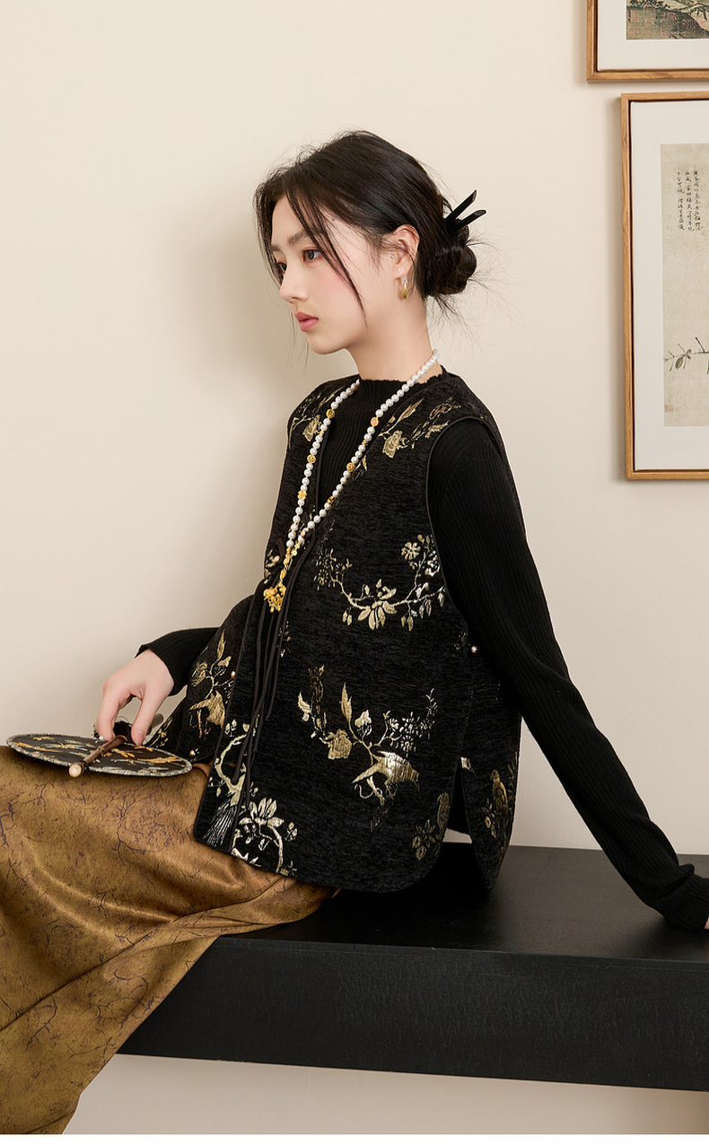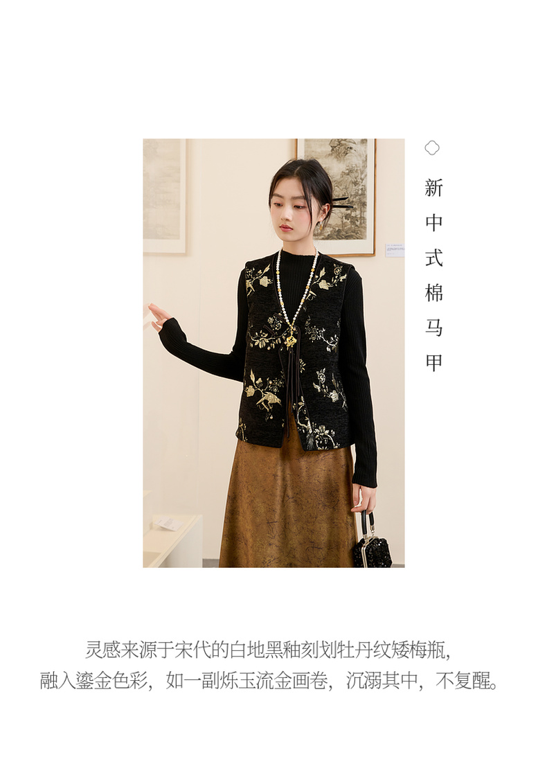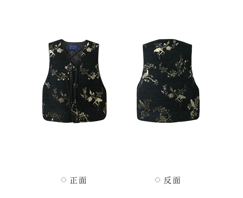 三彩【鎏金浮梦】2026春季新款新中式马甲V领盘扣提花无袖棉服女