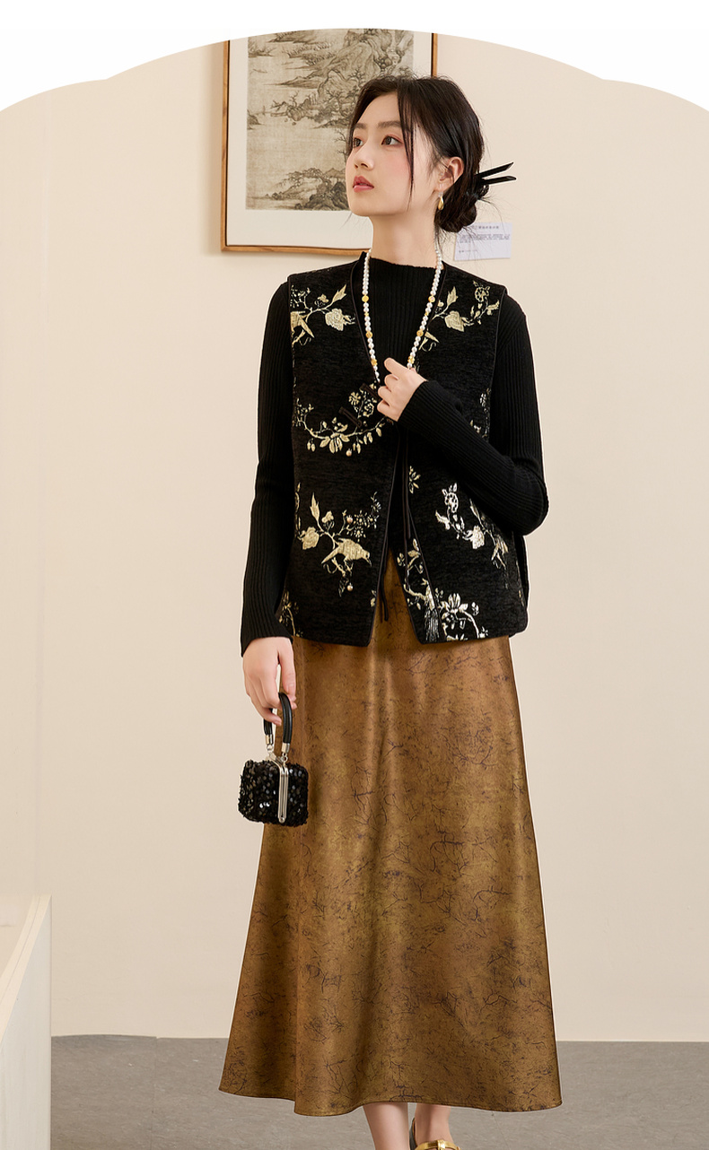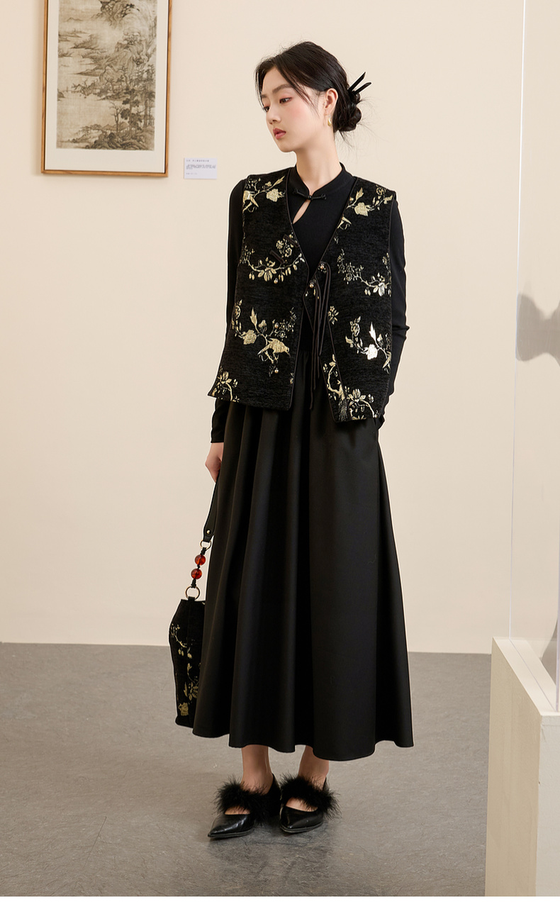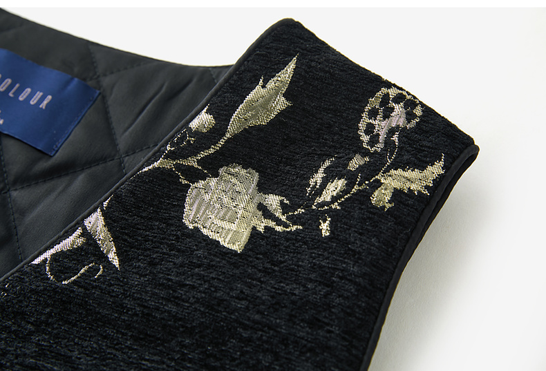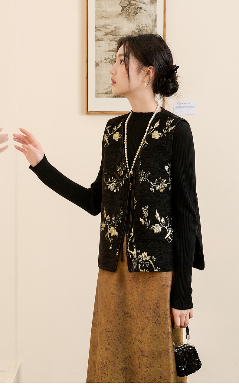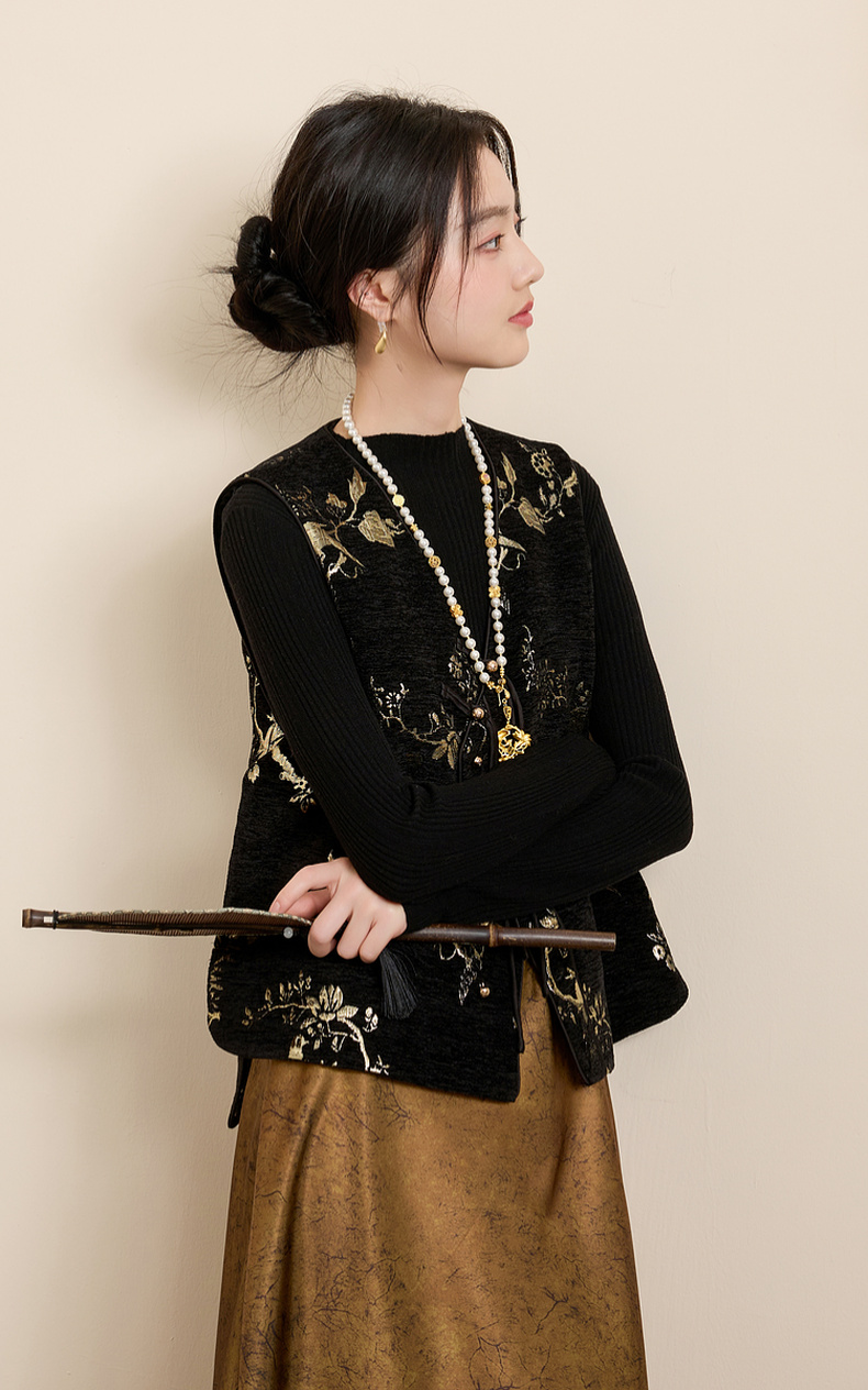 三彩【鎏金浮梦】2026春季新款新中式马甲V领盘扣提花无袖棉服女