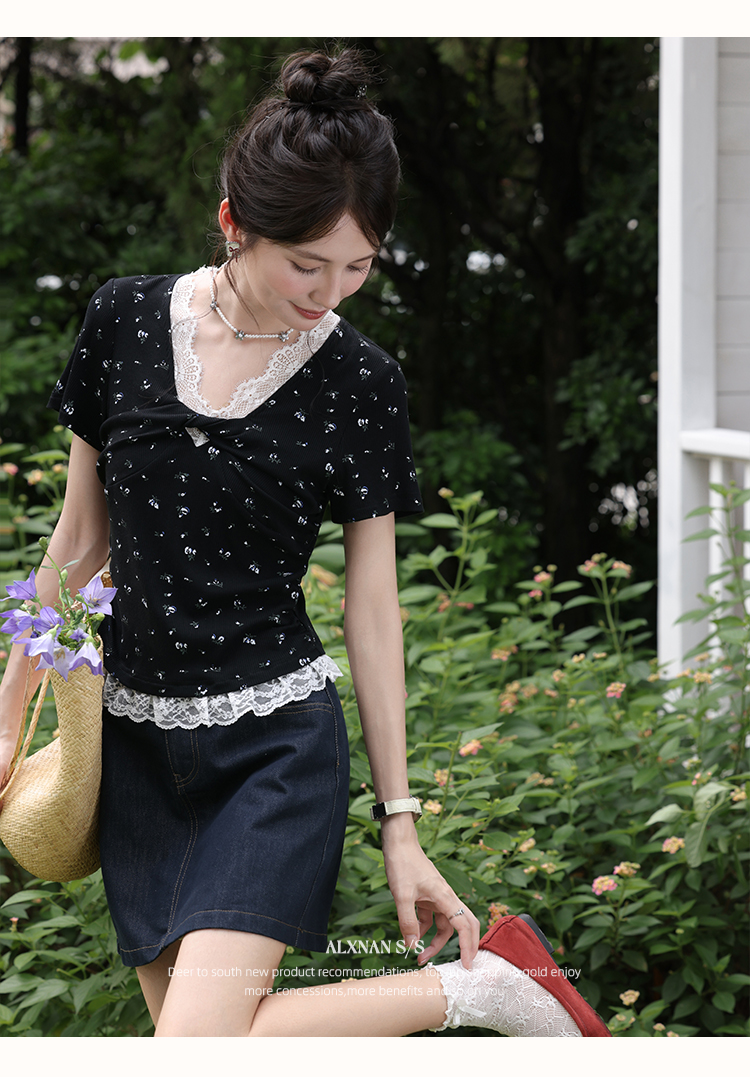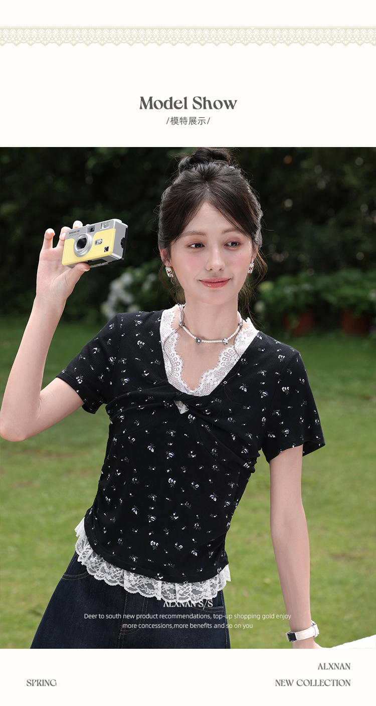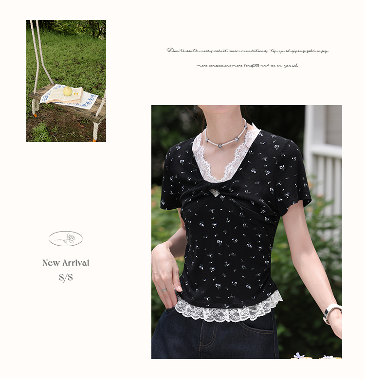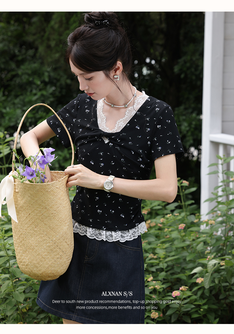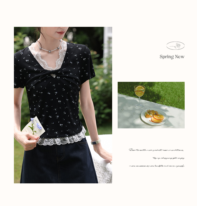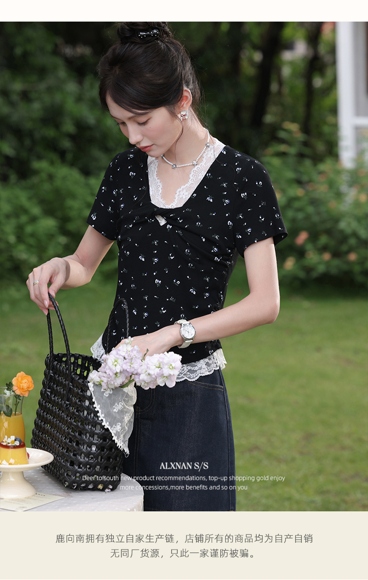 【65折秒杀】鹿向南「黑巧花园」正肩蕾丝边碎花短袖t恤夏季修身女上衣L558119