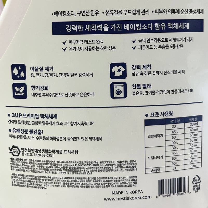 hestia深清洁苏打洗衣液4L헤스티아 딥클린 프로워시 세탁세제