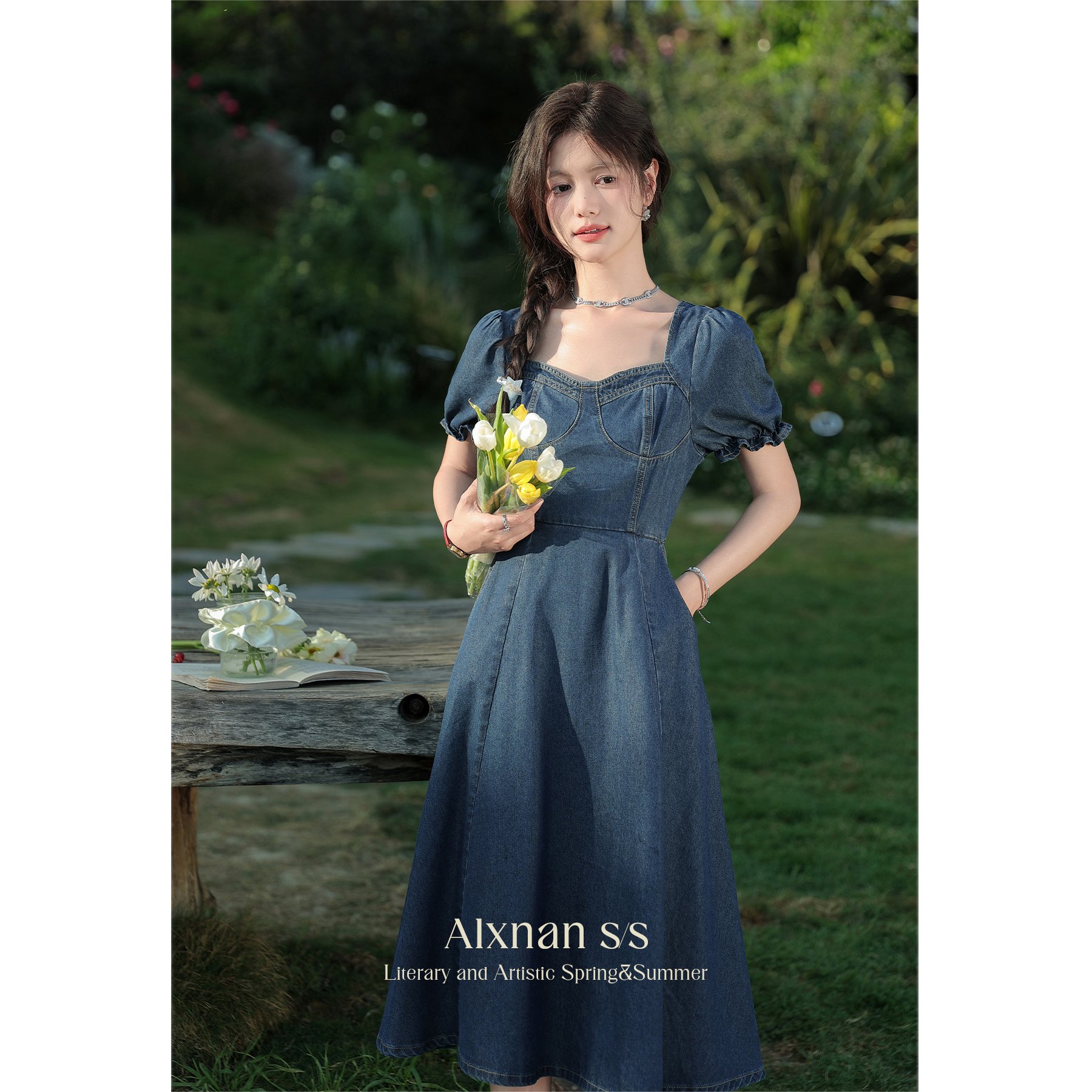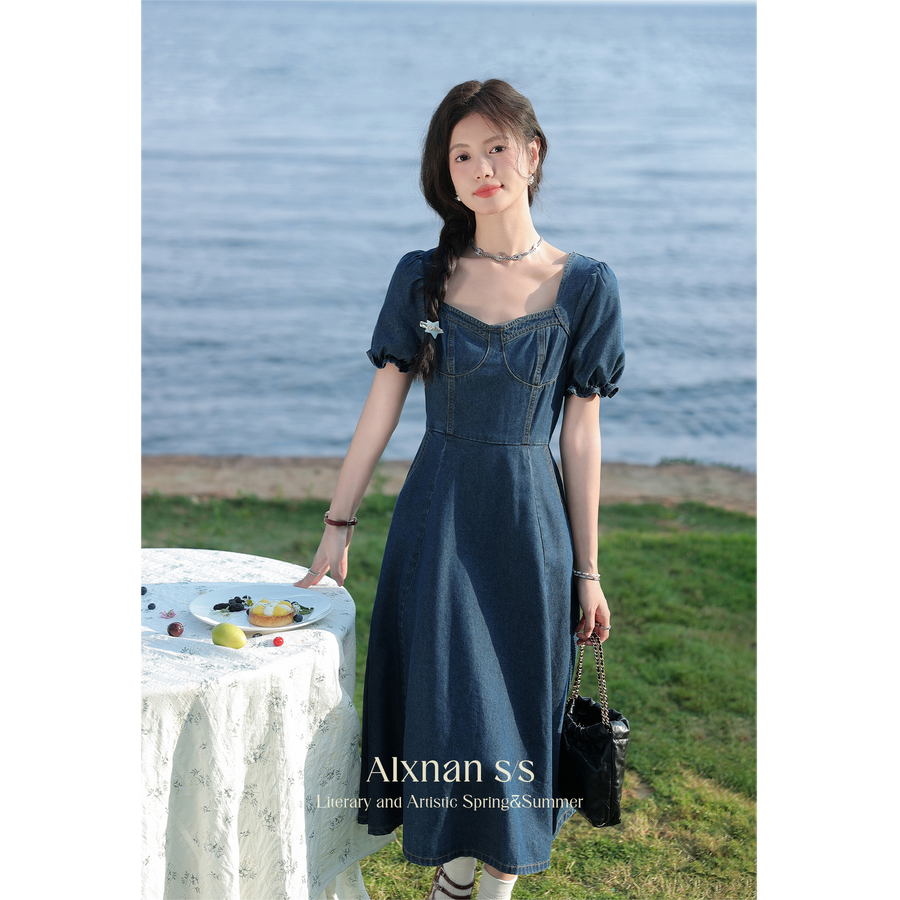 鹿向南「海盐白沙」法式v领牛仔连衣裙女夏季新款复古中长裙L36626