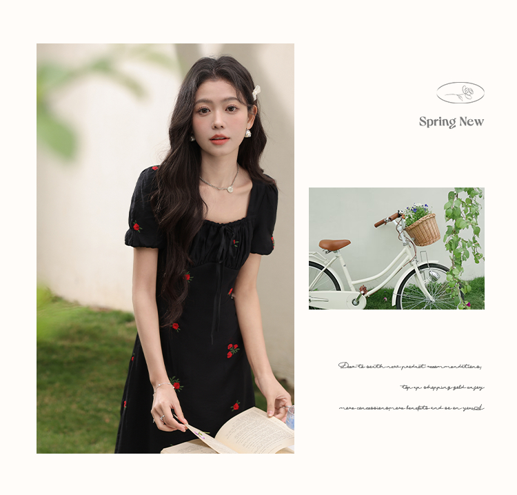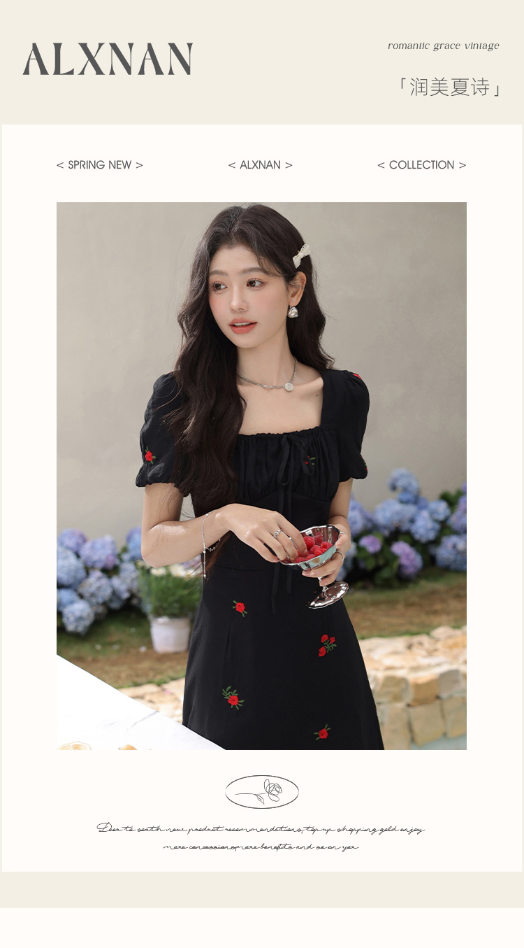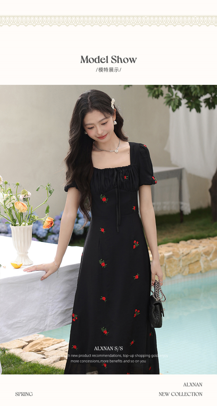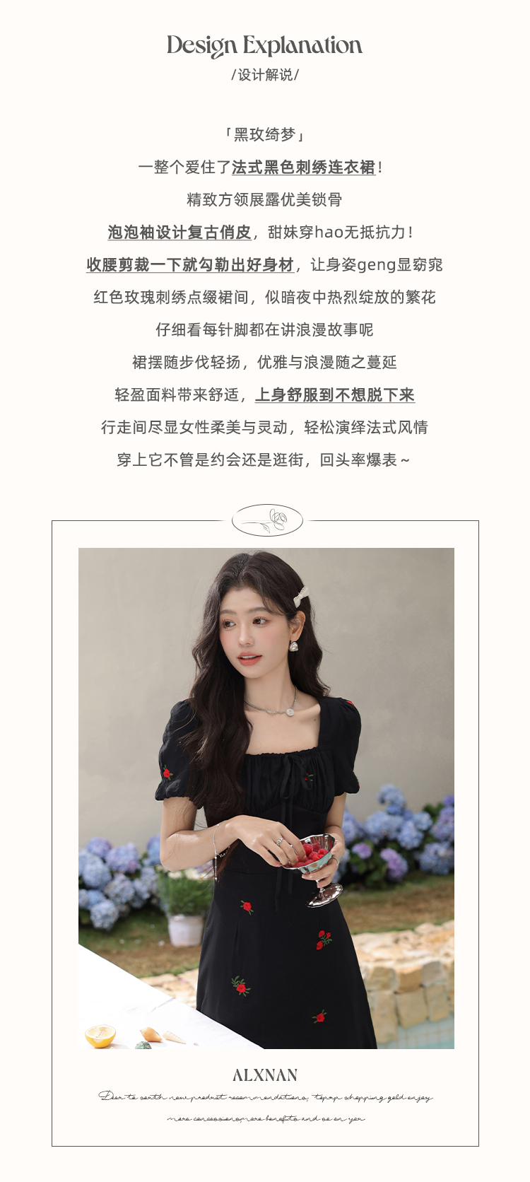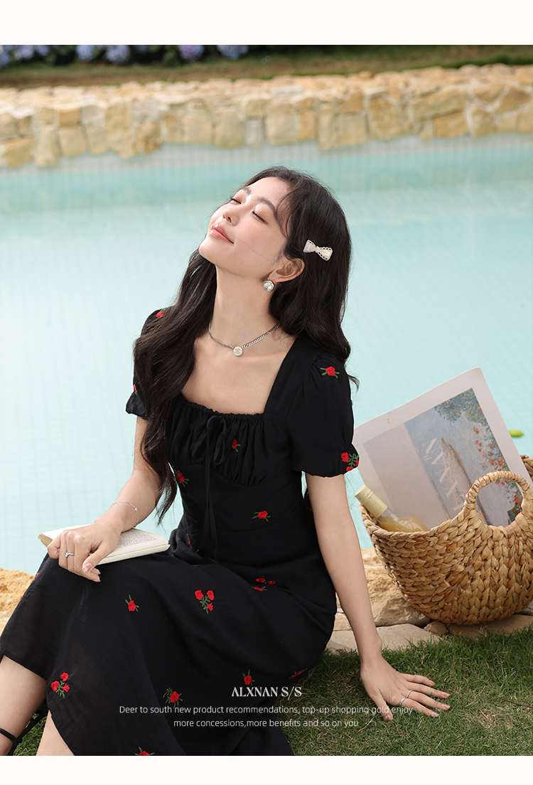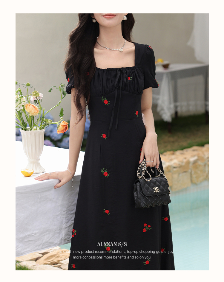 【6折秒杀】鹿向南「润美夏诗」黑色法式方领连衣裙女夏收腰显瘦长裙a字裙子L53932