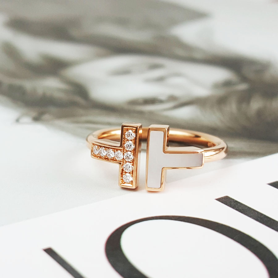 【95新】Tiffany & Co.蒂芙尼Tiffany T 系列18K玫瑰金镶钻+白贝母双T开口戒指53号女士现售价:7700!240425NJS02