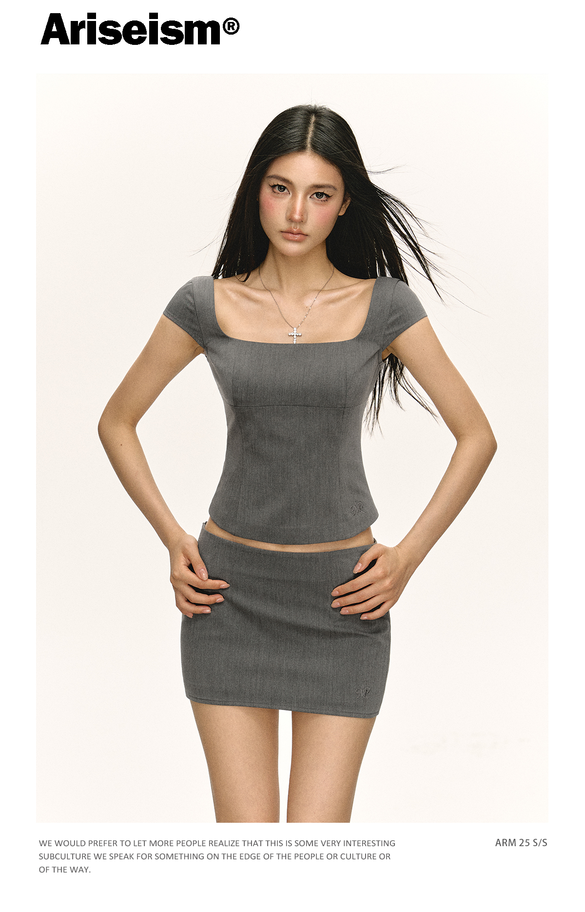 Ariseism 美式复古灰色修身短袖t恤短裙女夏套装两件套