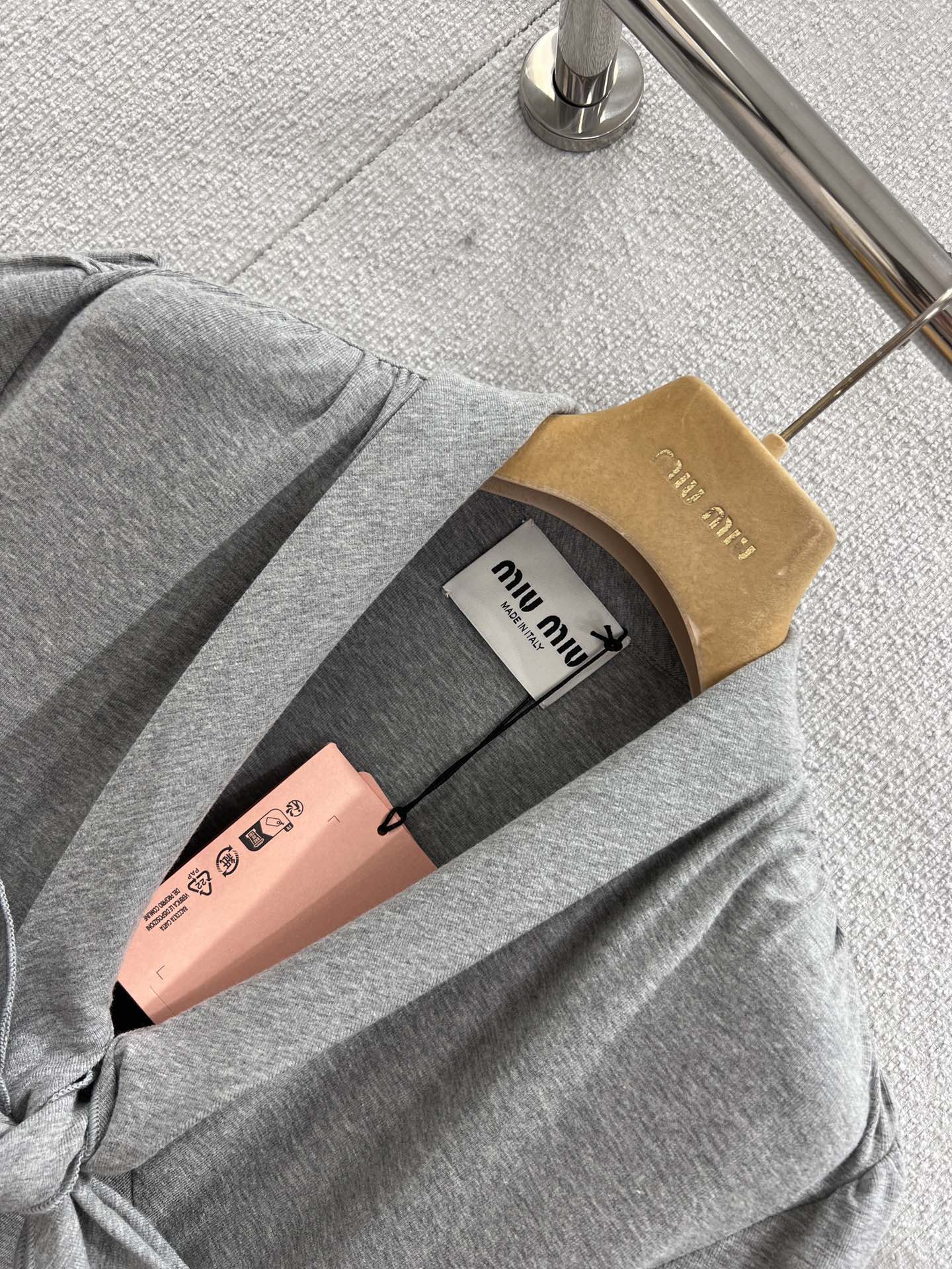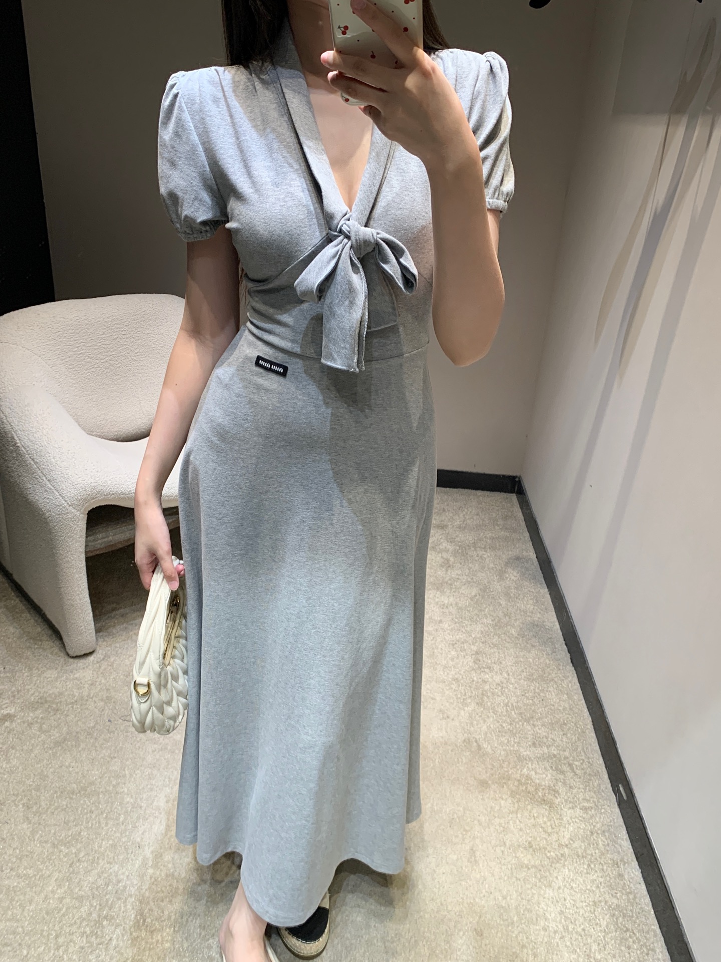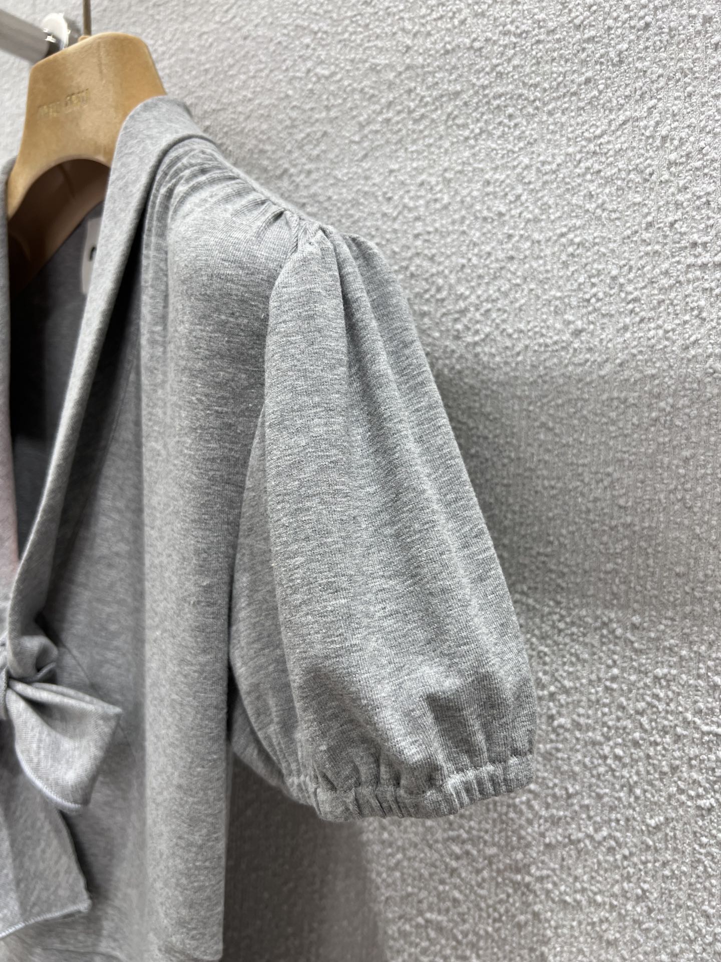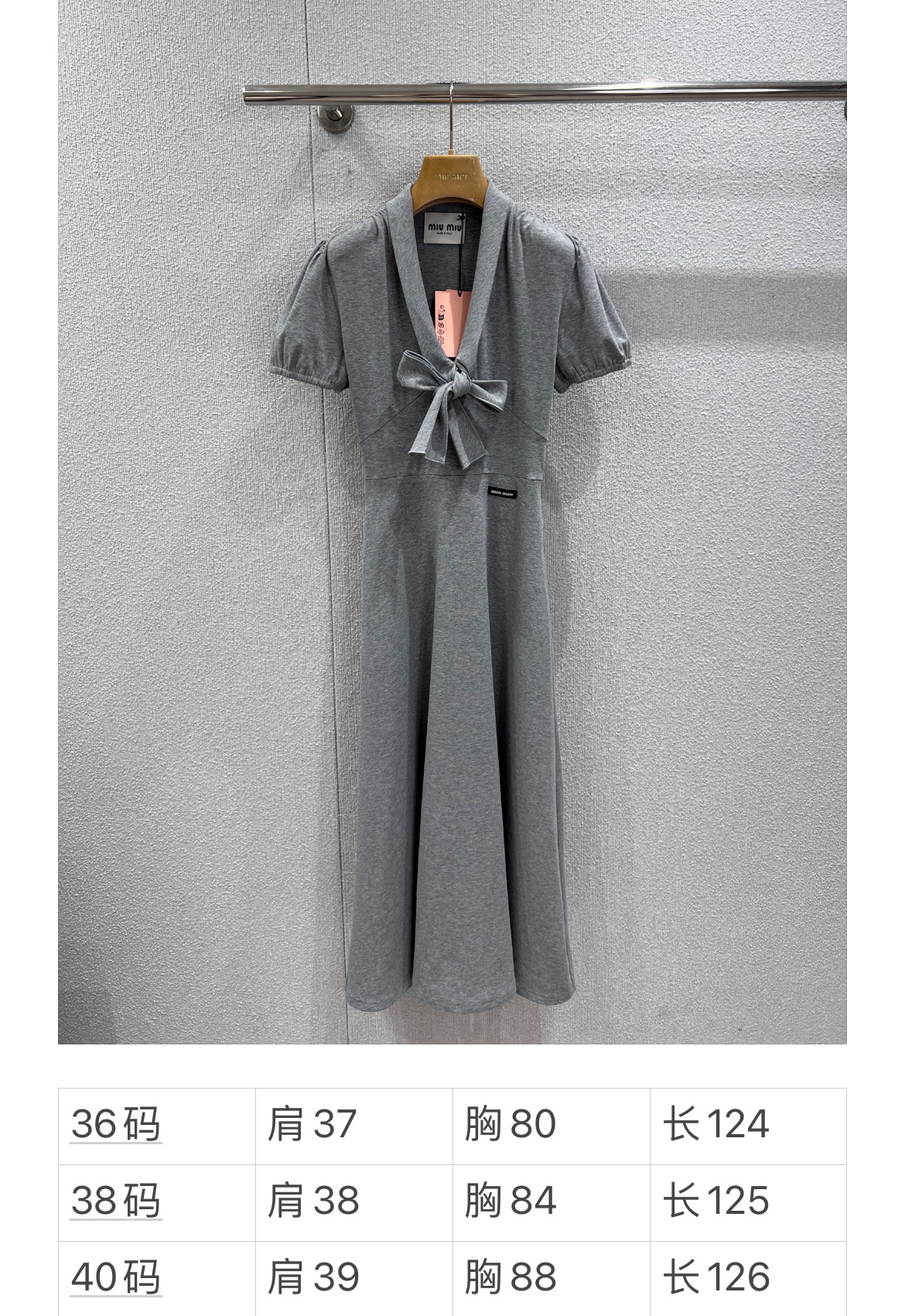 Mium*u 26Ss早春新款 绑带蝴蝶结灰色连衣裙丨⚠独家yb开发!顶级高版出品!精选高支棉混纺面料,触感软糯亲肤,垂坠的裙摆随步履轻摆,勾勒出流畅的身体曲线。领口处的绑带蝴蝶结是设计点睛之笔,可自由调节的结饰打造灵动V领,泡泡短袖弱化肩线更显娇俏,腰侧的标识织标暗藏细节巧思。从日常通勤到下午茶约会,一件即可拿捏随性又精致的Miu系风格,将早春的浪漫与温柔尽数穿在身上。现货发售S/M/L