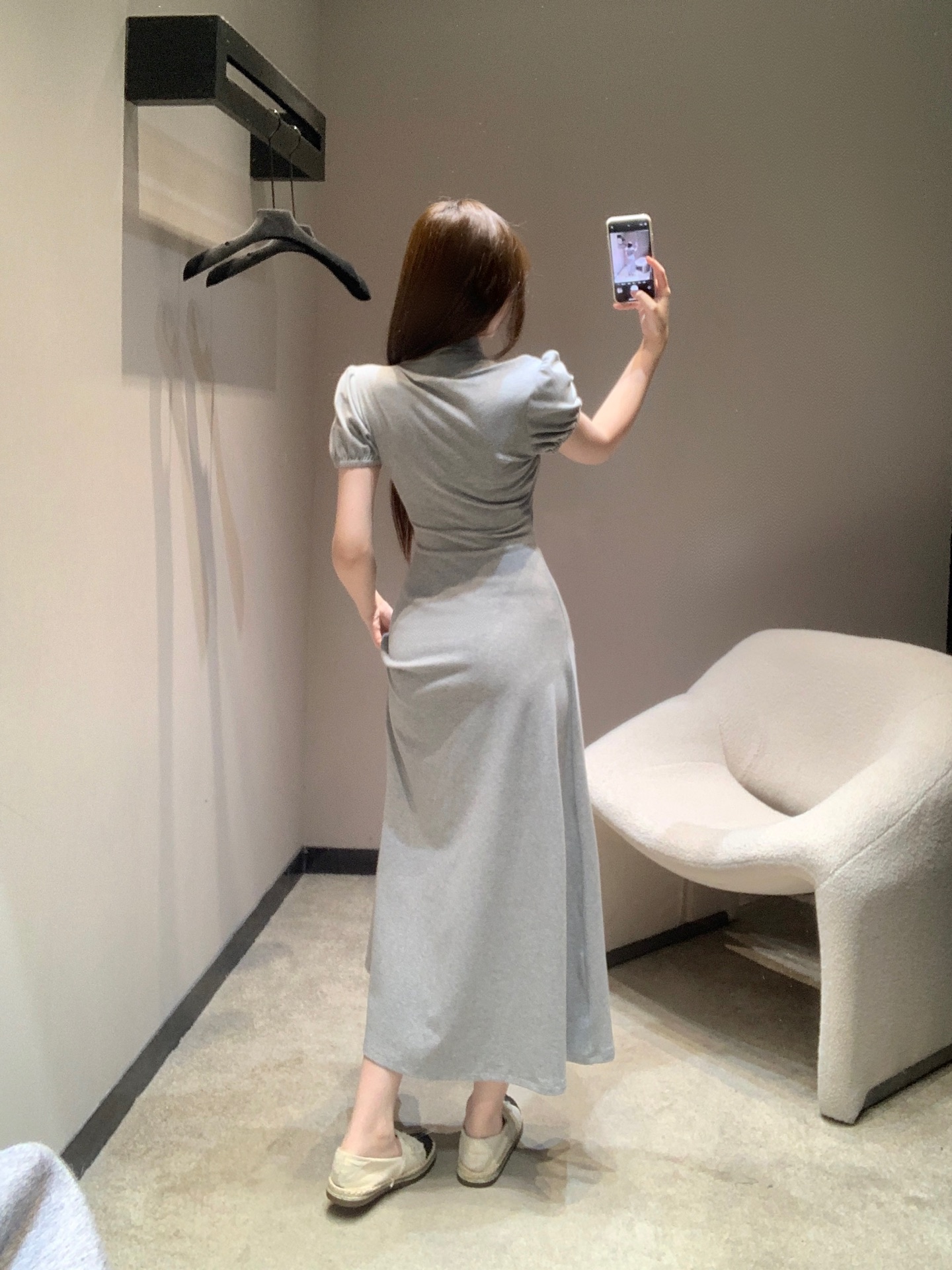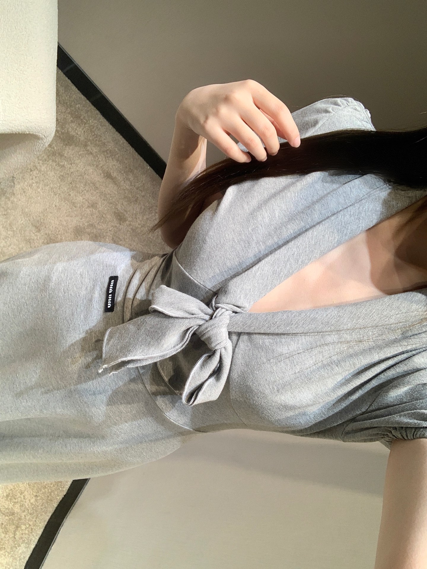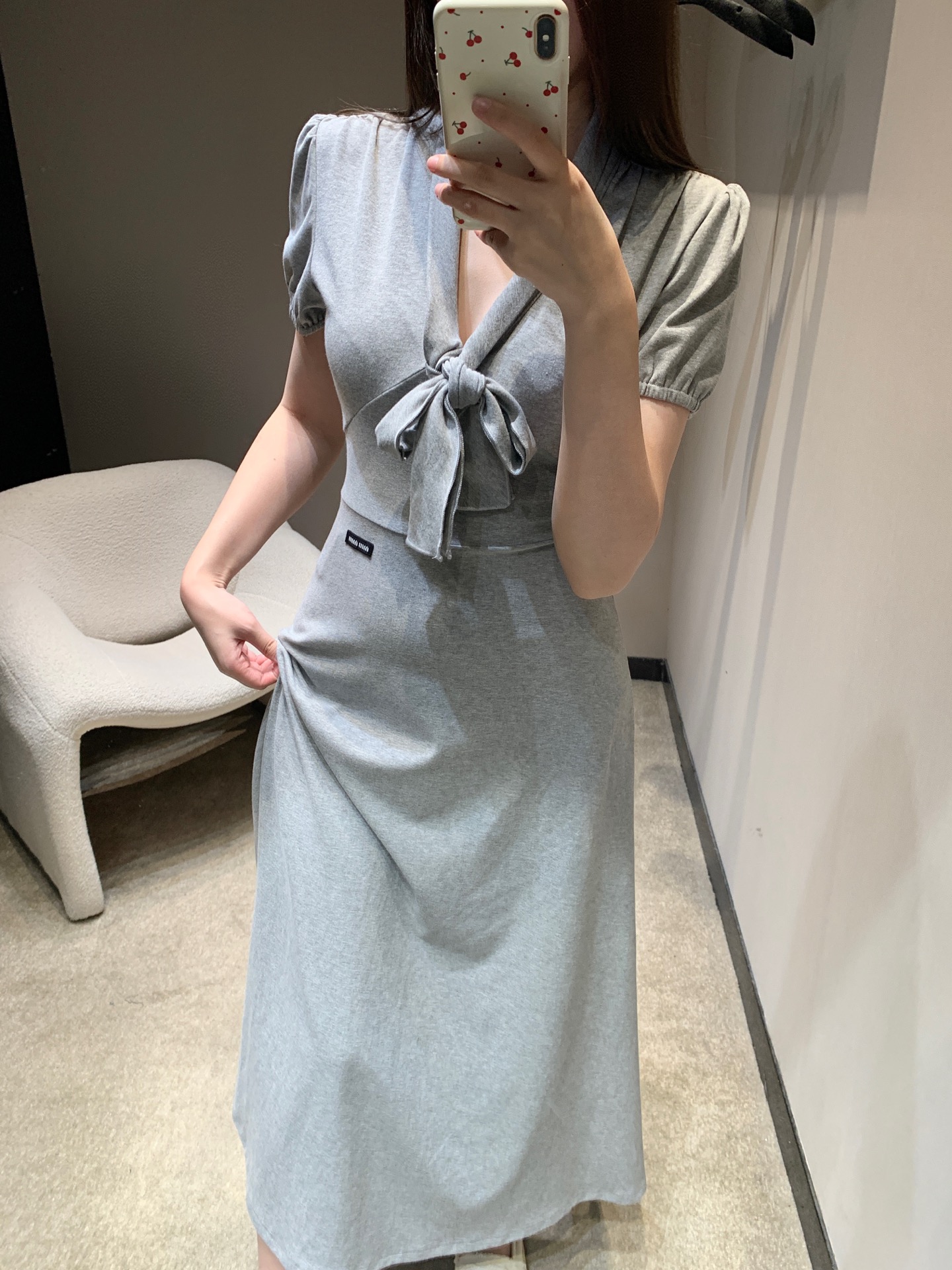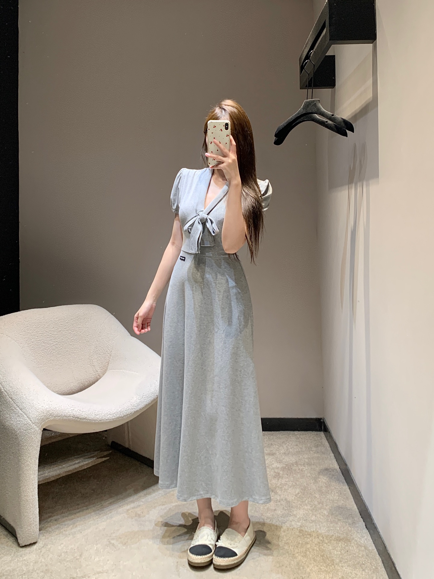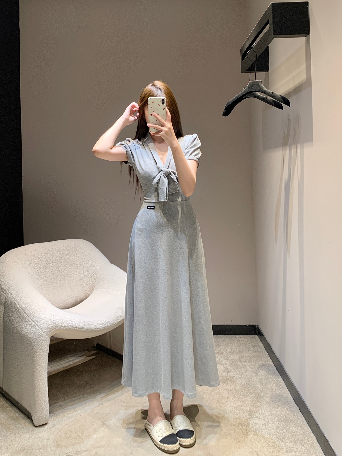 Mium*u 26Ss早春新款 绑带蝴蝶结灰色连衣裙丨⚠独家yb开发!顶级高版出品!精选高支棉混纺面料,触感软糯亲肤,垂坠的裙摆随步履轻摆,勾勒出流畅的身体曲线。领口处的绑带蝴蝶结是设计点睛之笔,可自由调节的结饰打造灵动V领,泡泡短袖弱化肩线更显娇俏,腰侧的标识织标暗藏细节巧思。从日常通勤到下午茶约会,一件即可拿捏随性又精致的Miu系风格,将早春的浪漫与温柔尽数穿在身上。现货发售S/M/L