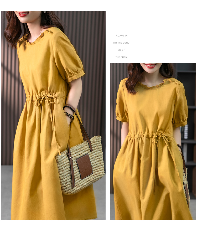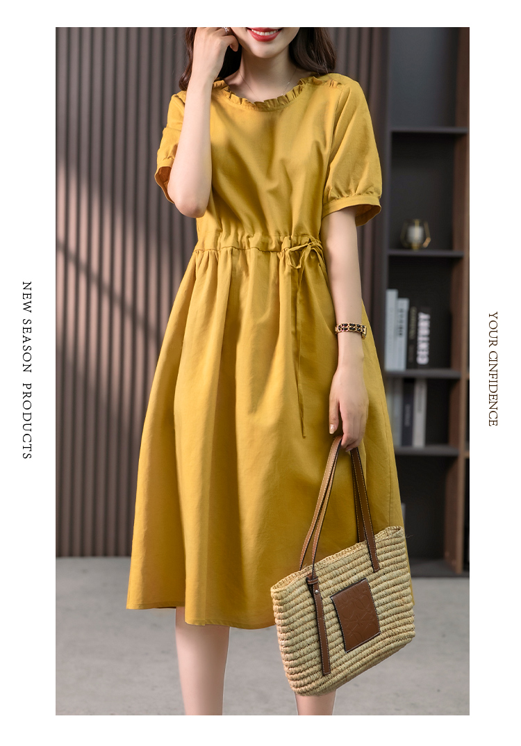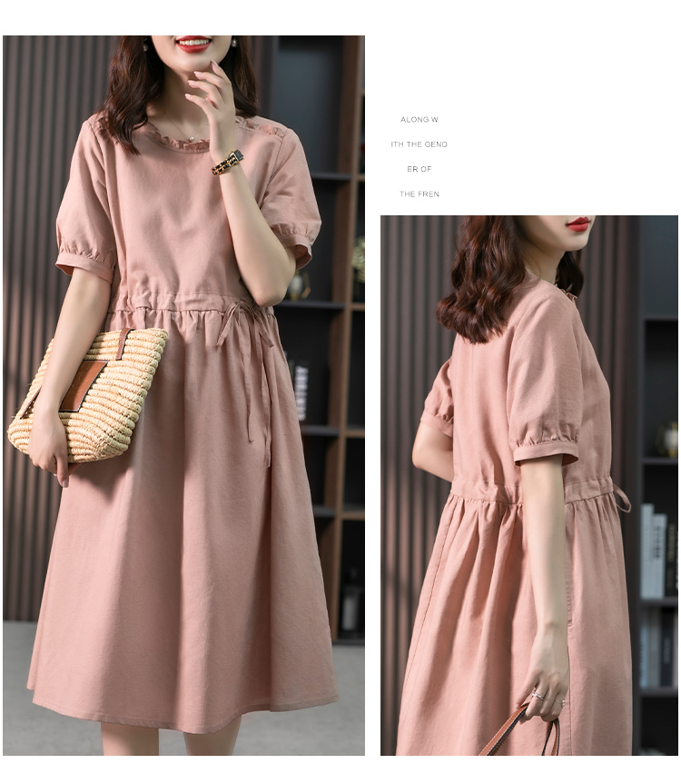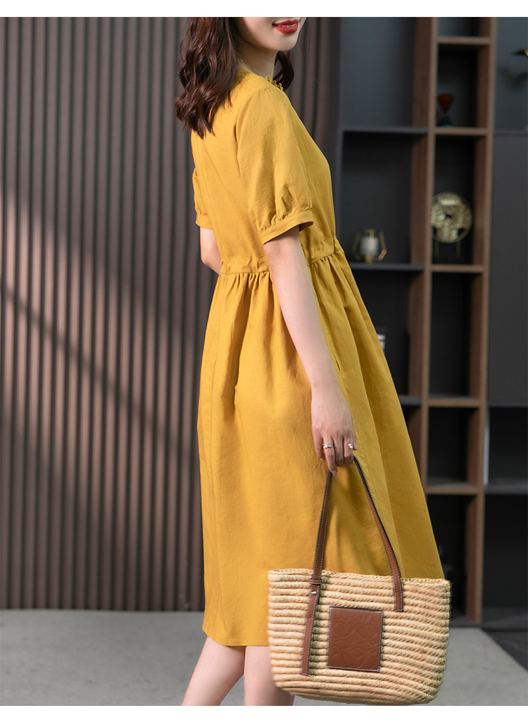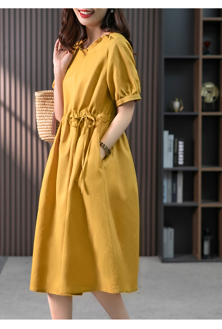 YX【现货7天】休闲减龄亚麻连衣裙女2023夏新款韩版宽松显瘦中长款a字裙子