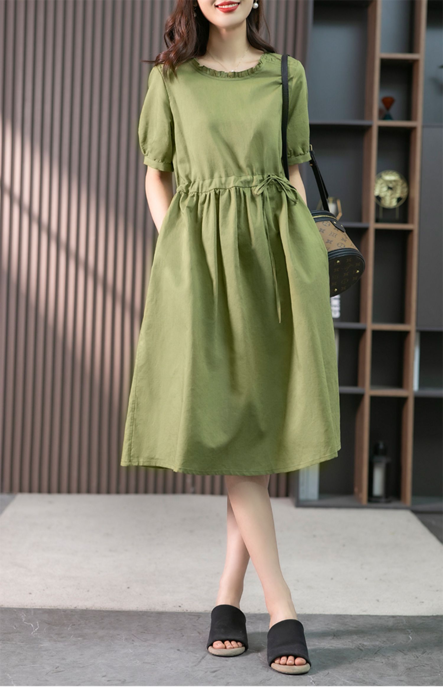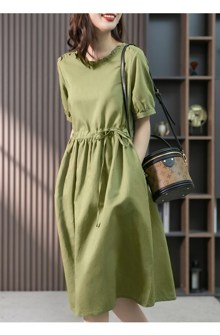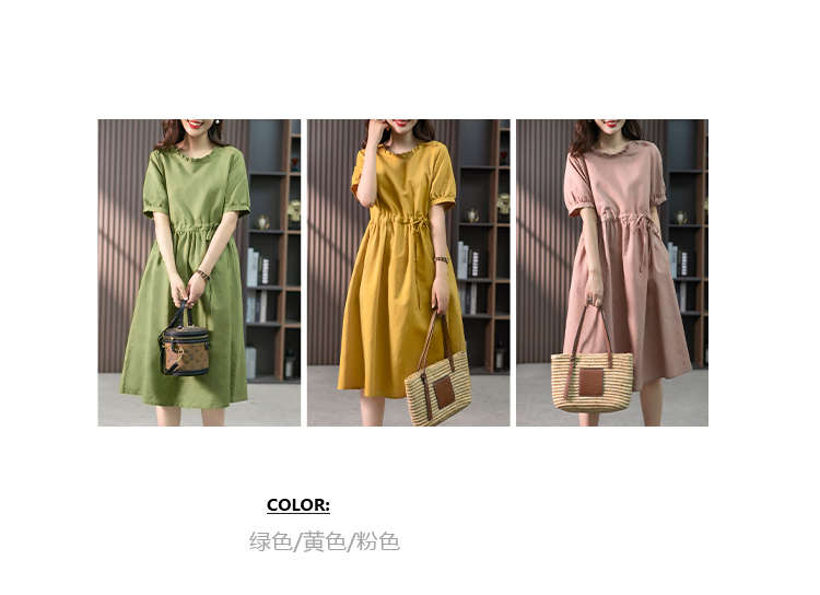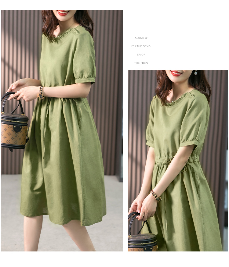 YX【现货7天】休闲减龄亚麻连衣裙女2023夏新款韩版宽松显瘦中长款a字裙子