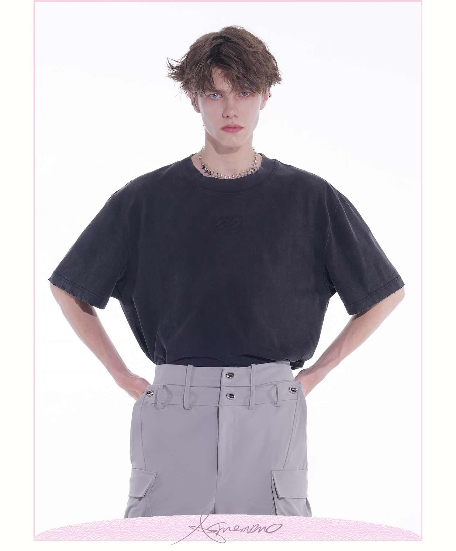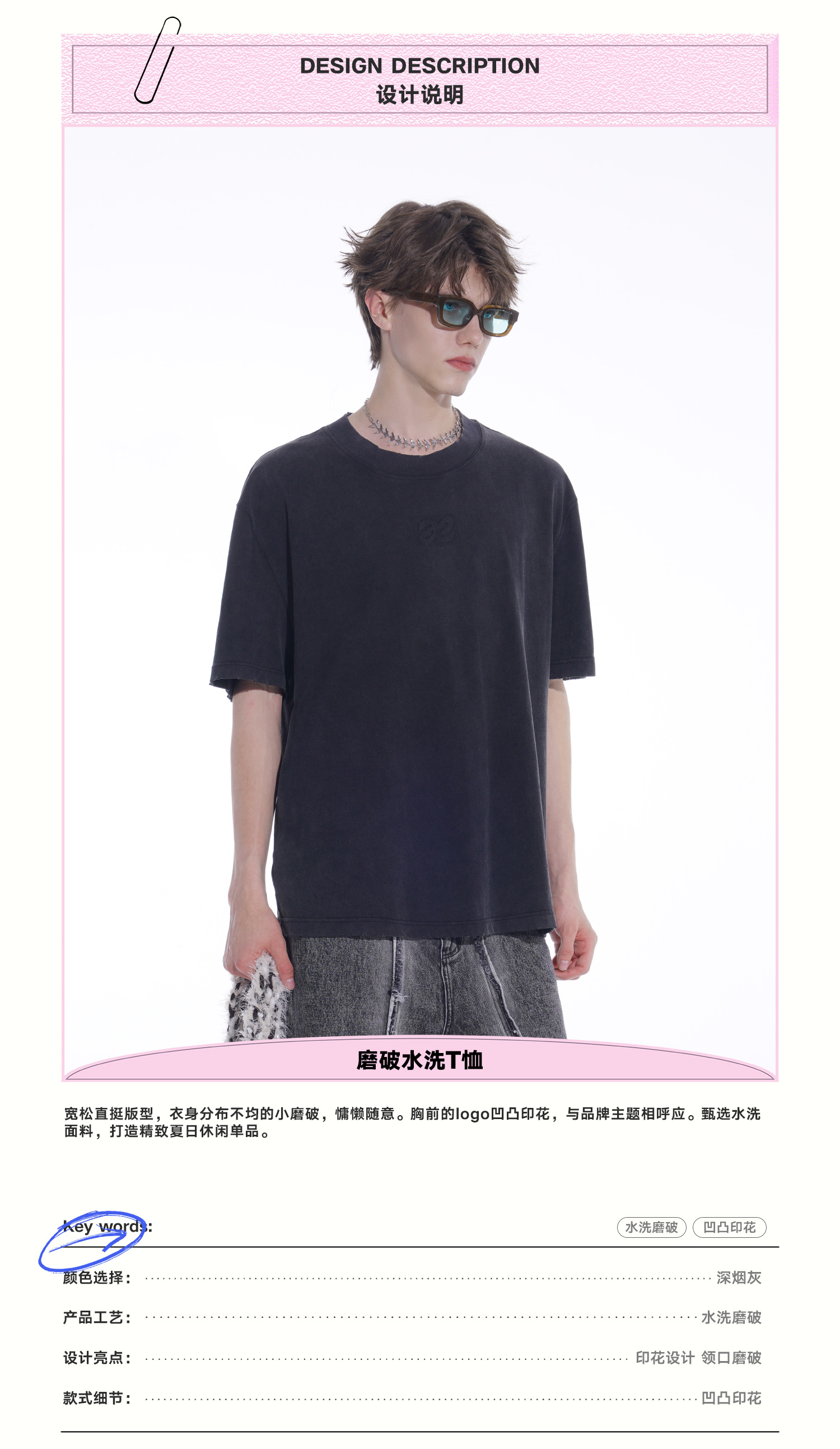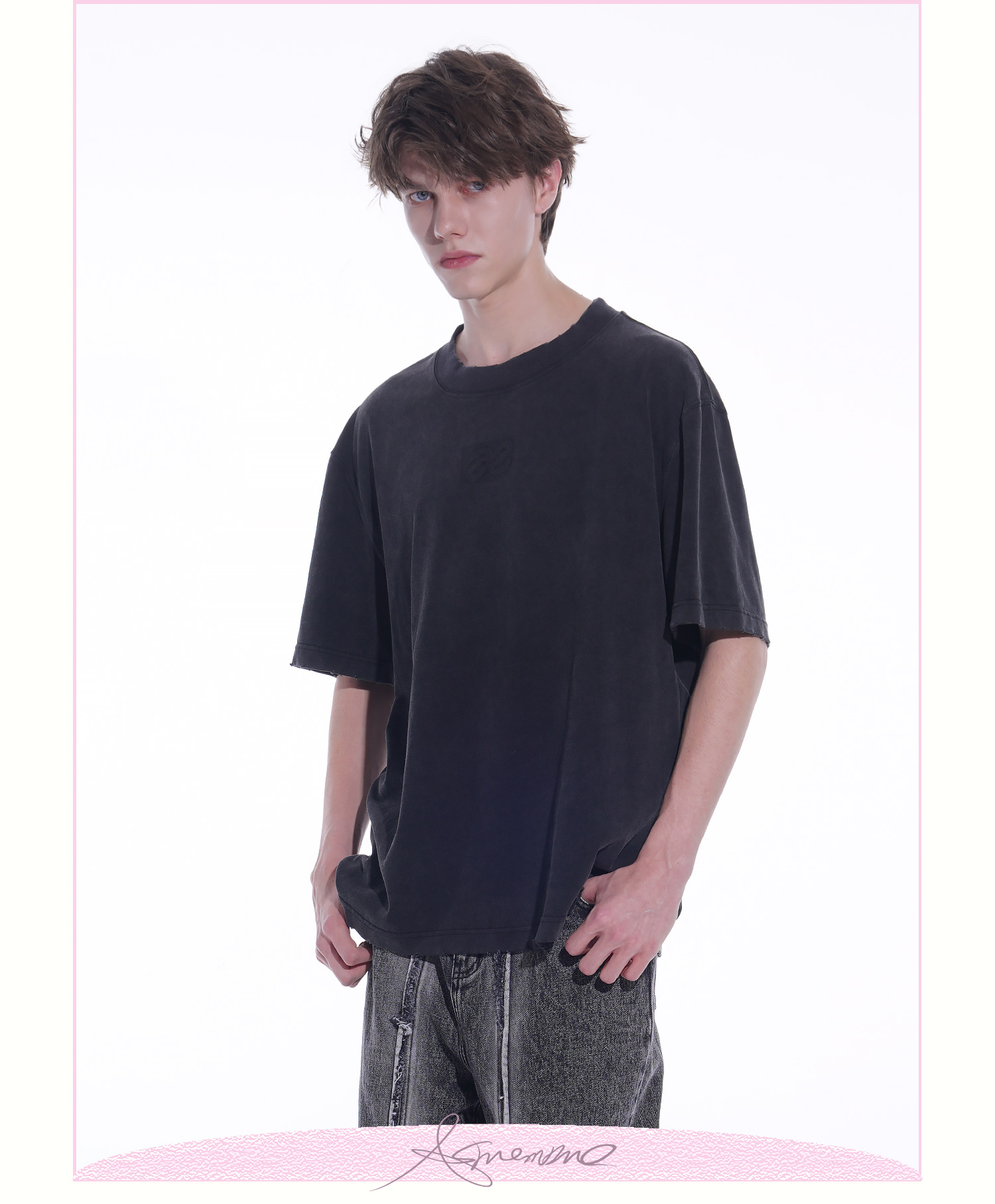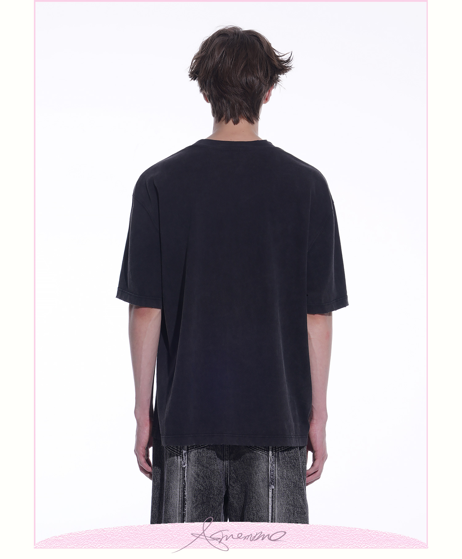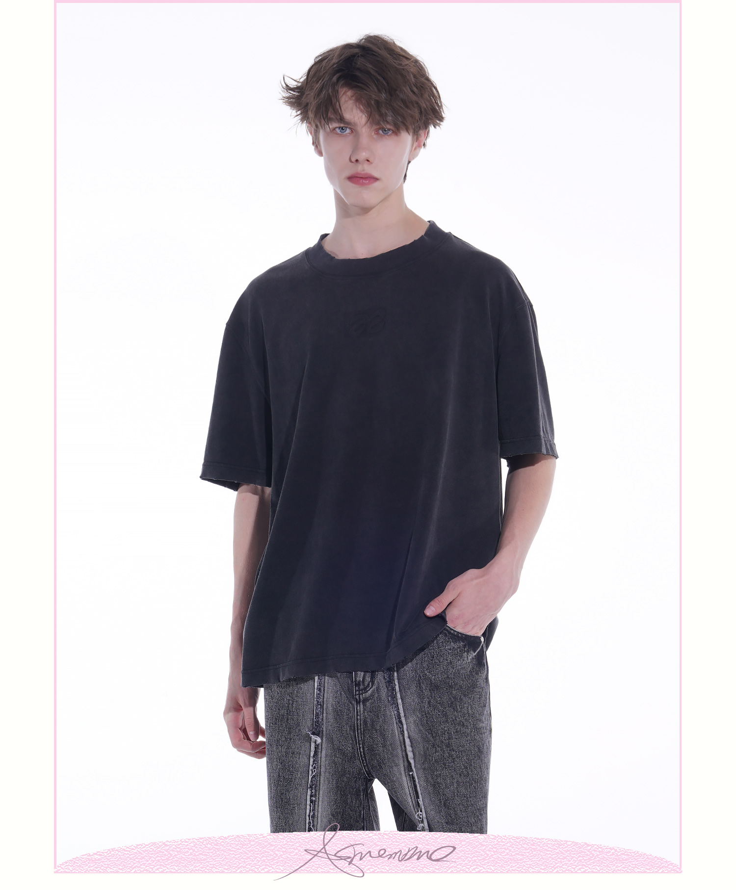 启世录TIWILLTANG“朦灰磨破”水洗黑色潮流T恤圆领打底衫夏季百搭短袖男