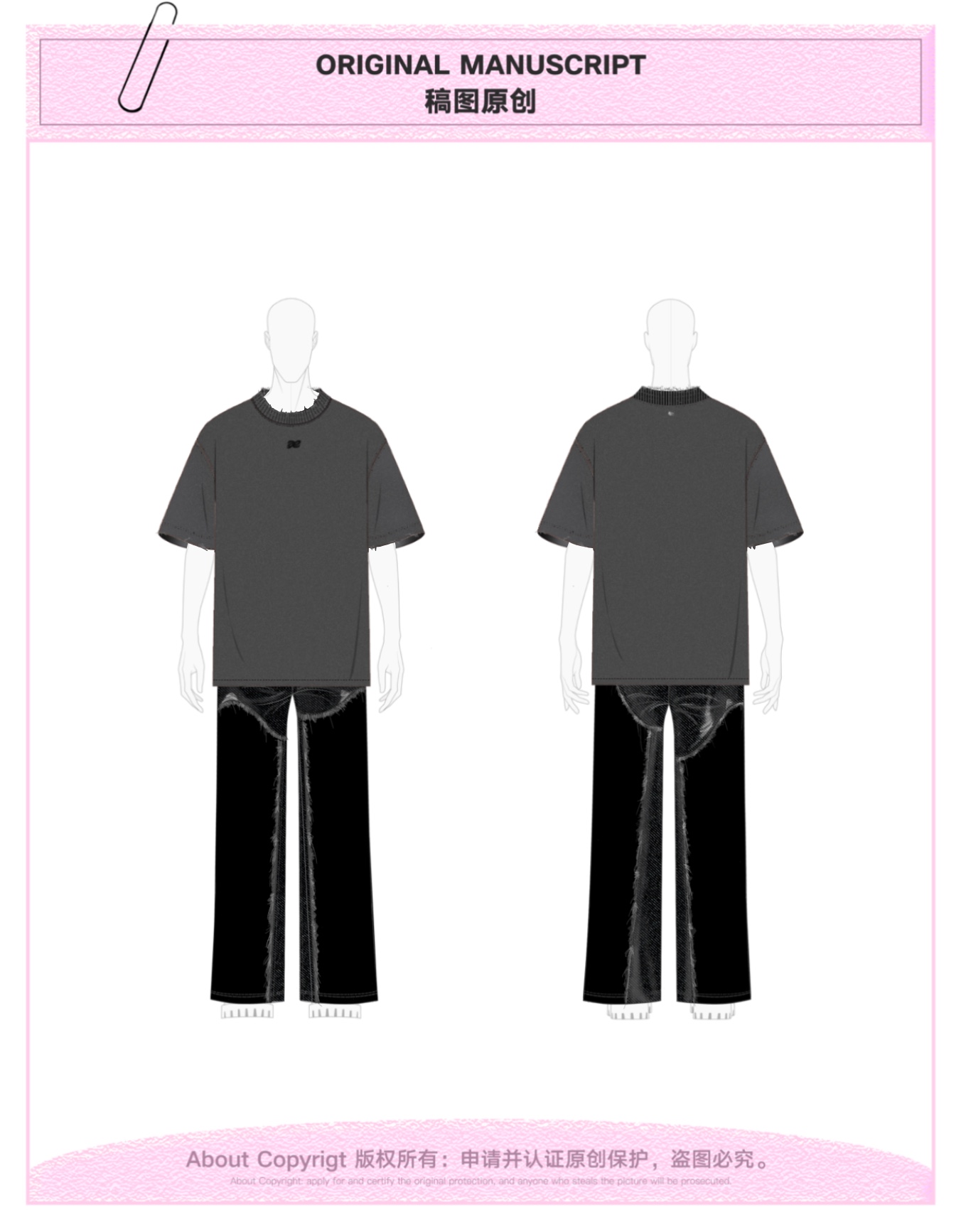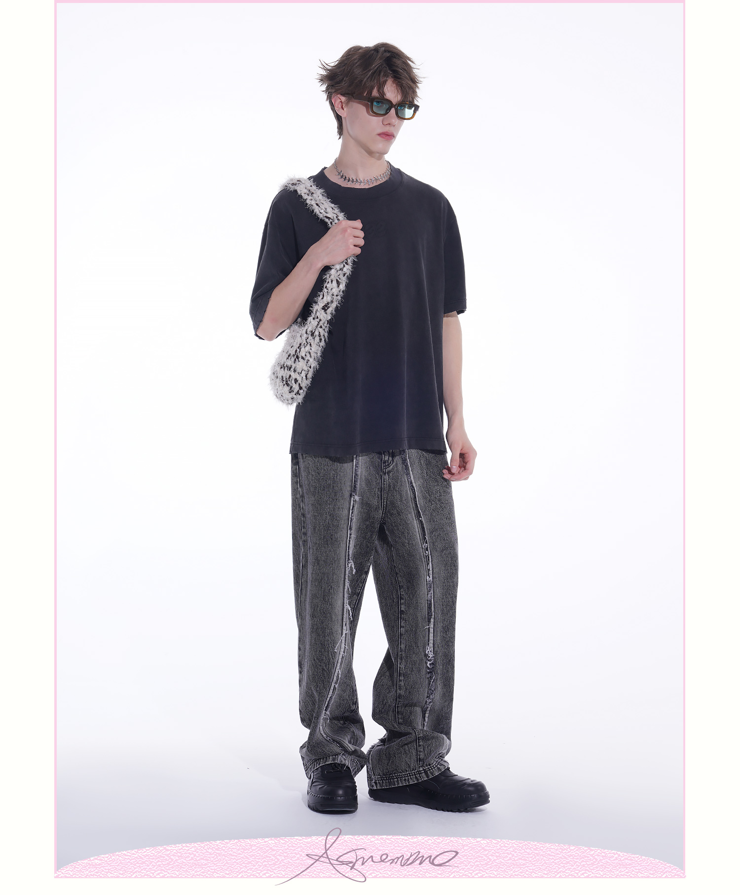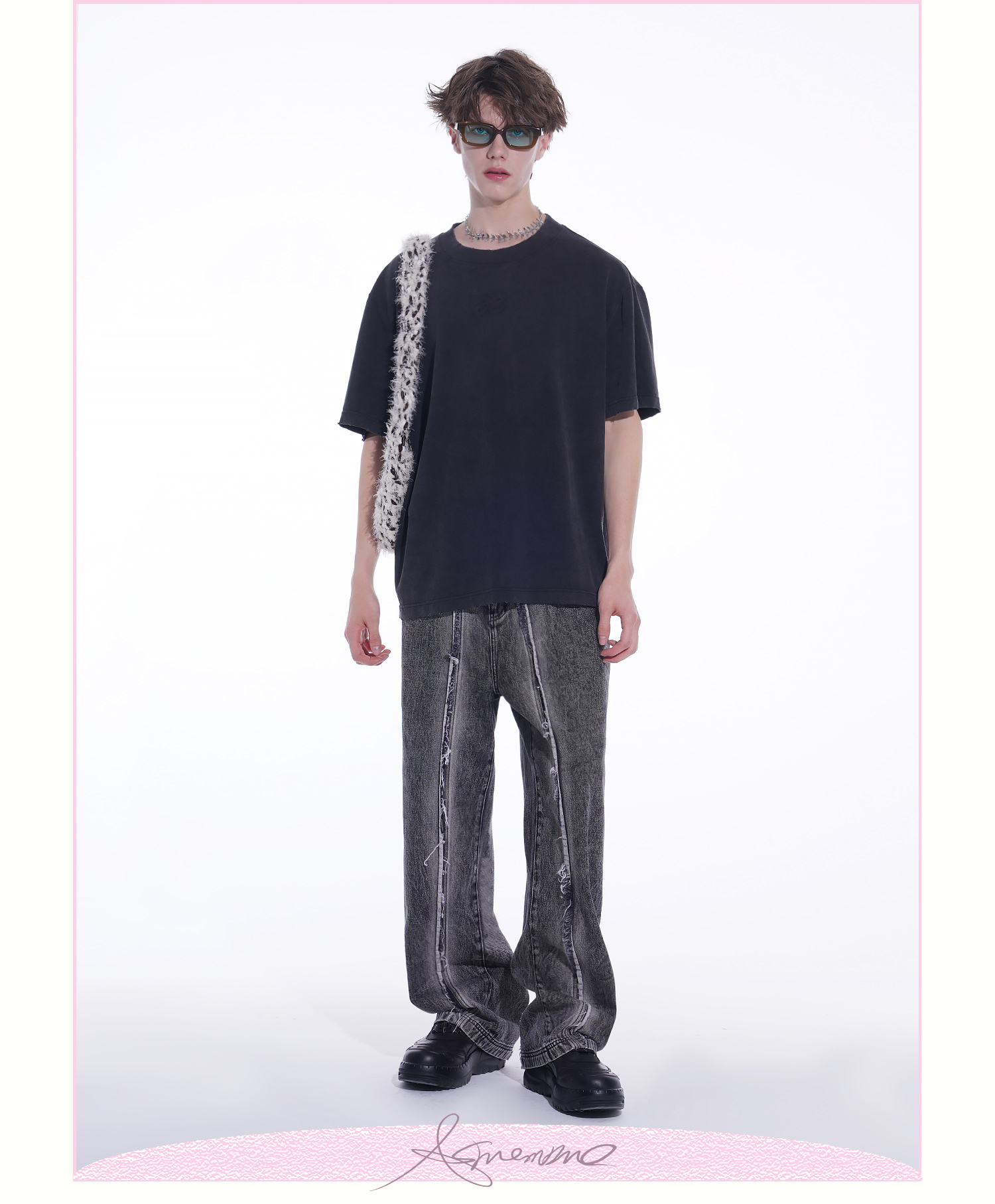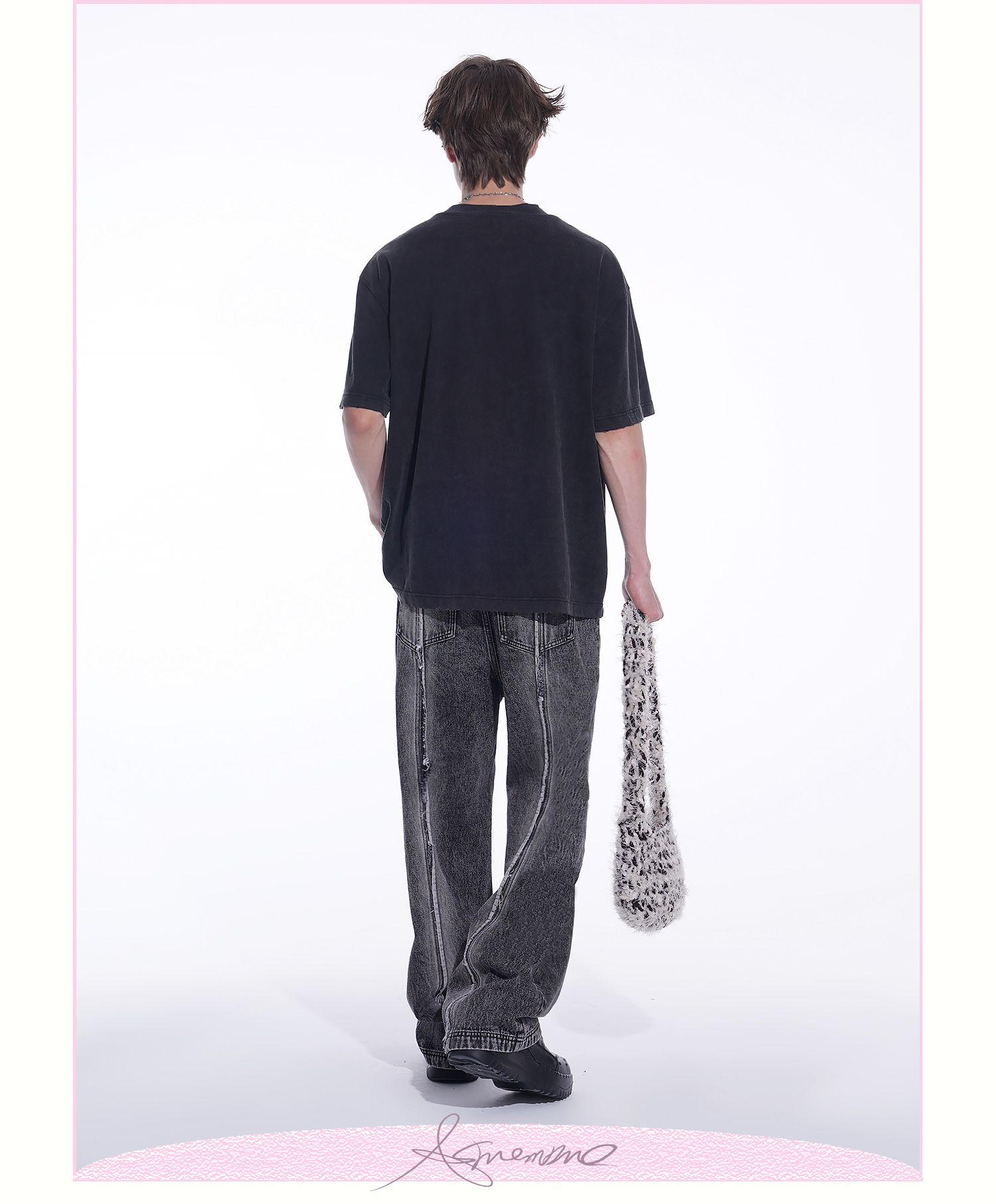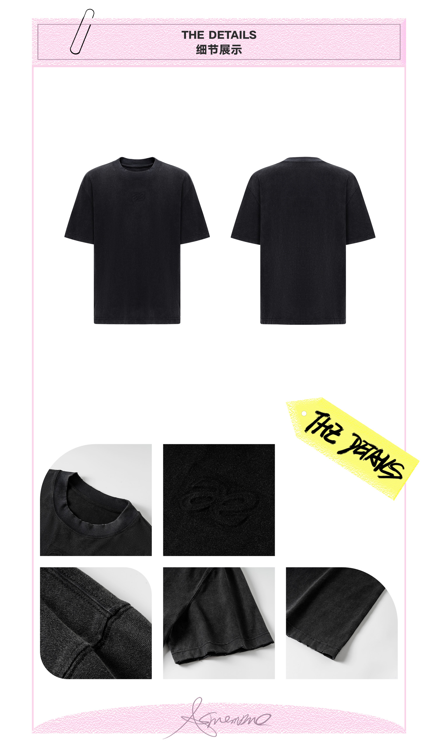 启世录TIWILLTANG“朦灰磨破”水洗黑色潮流T恤圆领打底衫夏季百搭短袖男