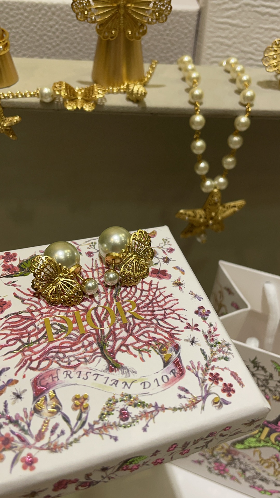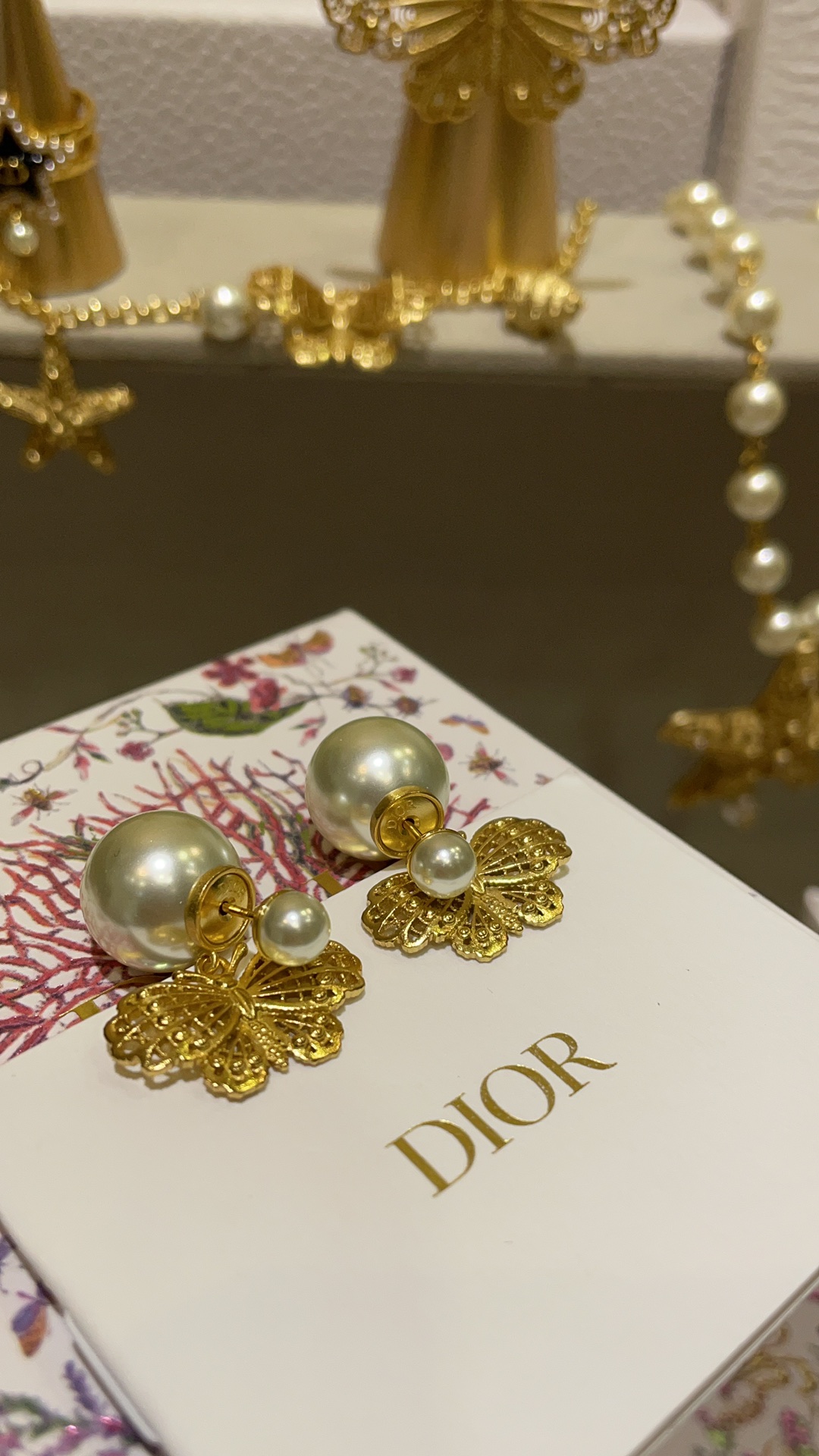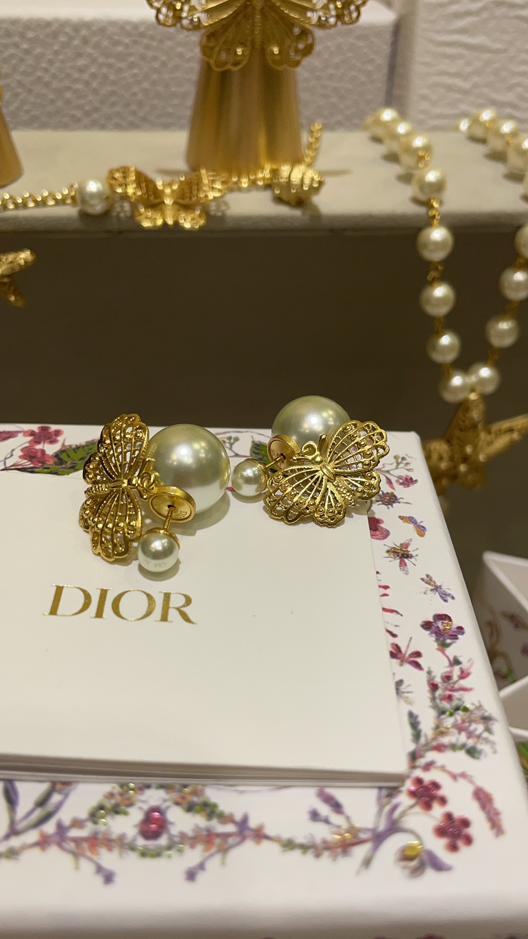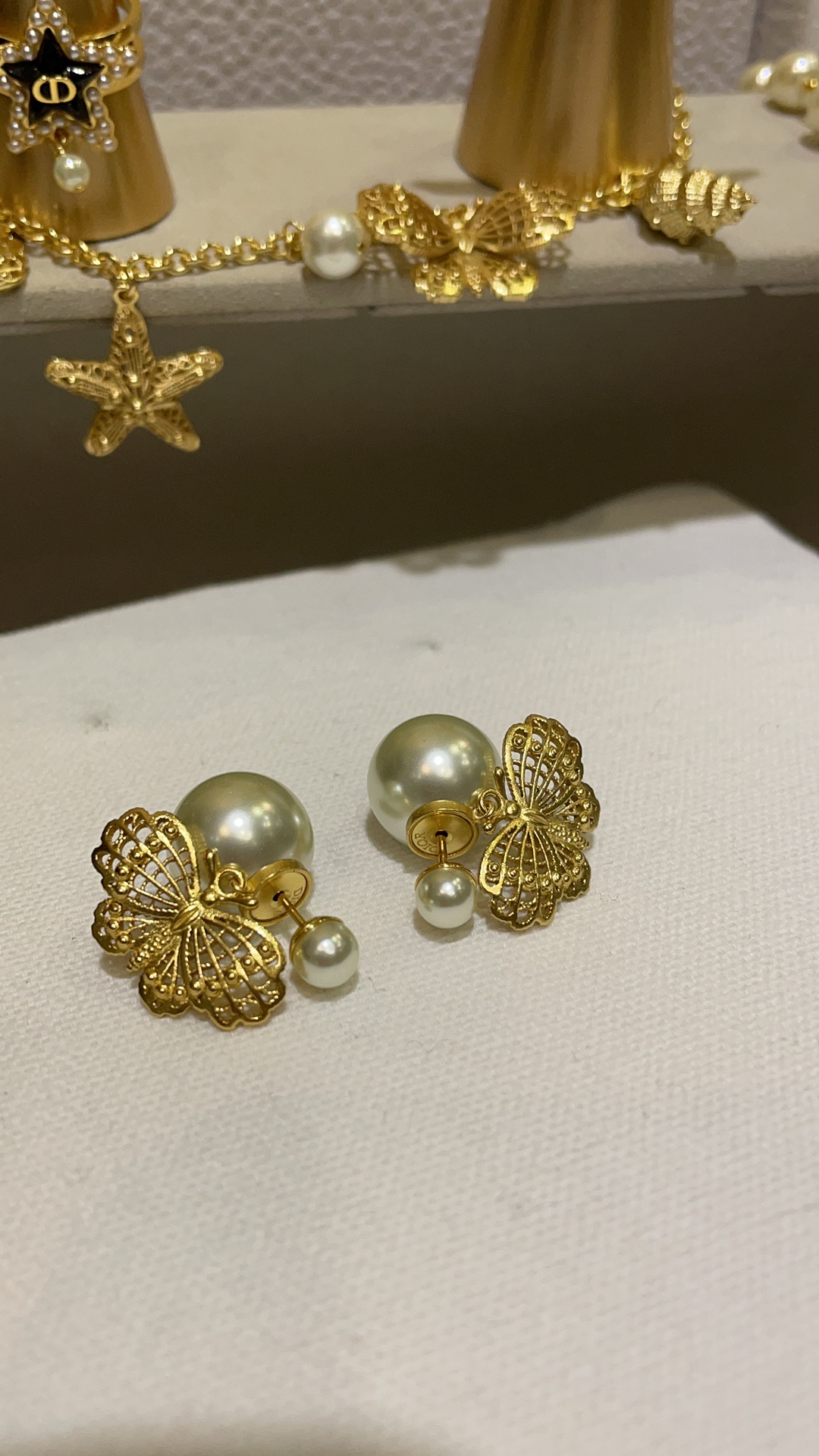 D家 25年新款鎏金蝴蝶珍珠双球耳环