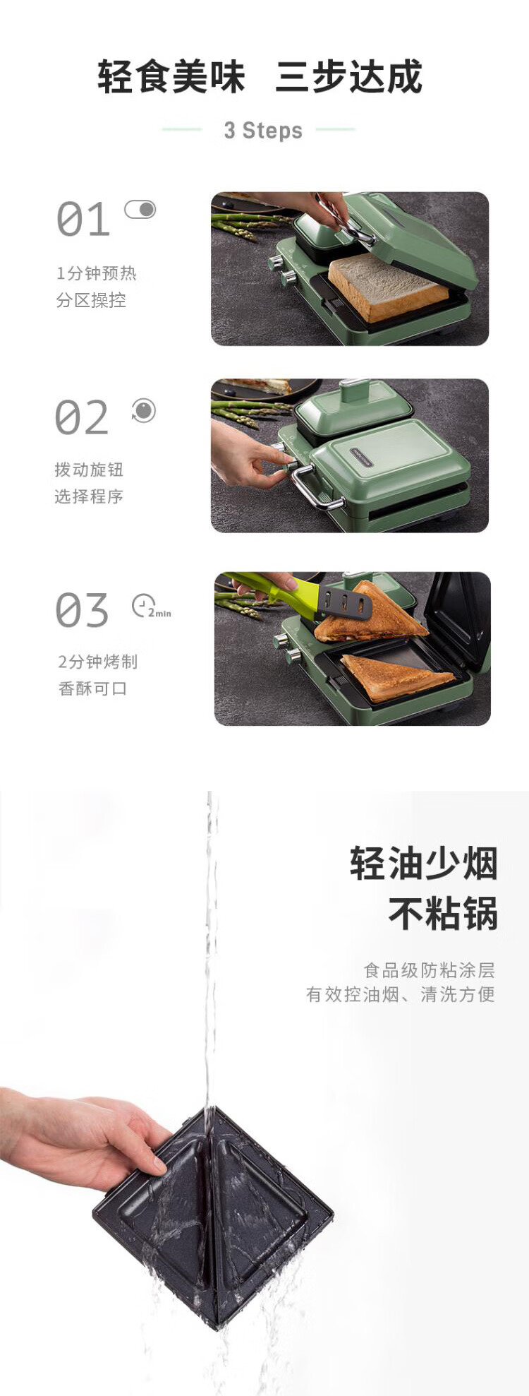 摩飞电器(Morphyrichards)早餐机 家用迷你多功能电饼铛 双区料理轻食机面包煎烤机三明治机华夫饼机 MR9086薄荷绿