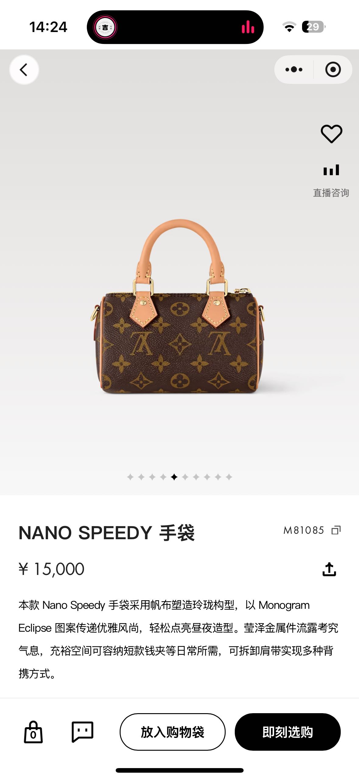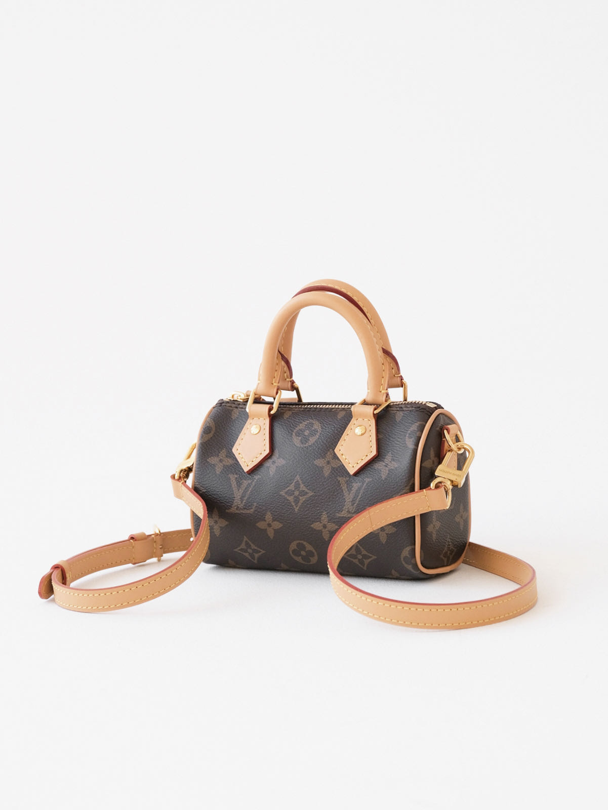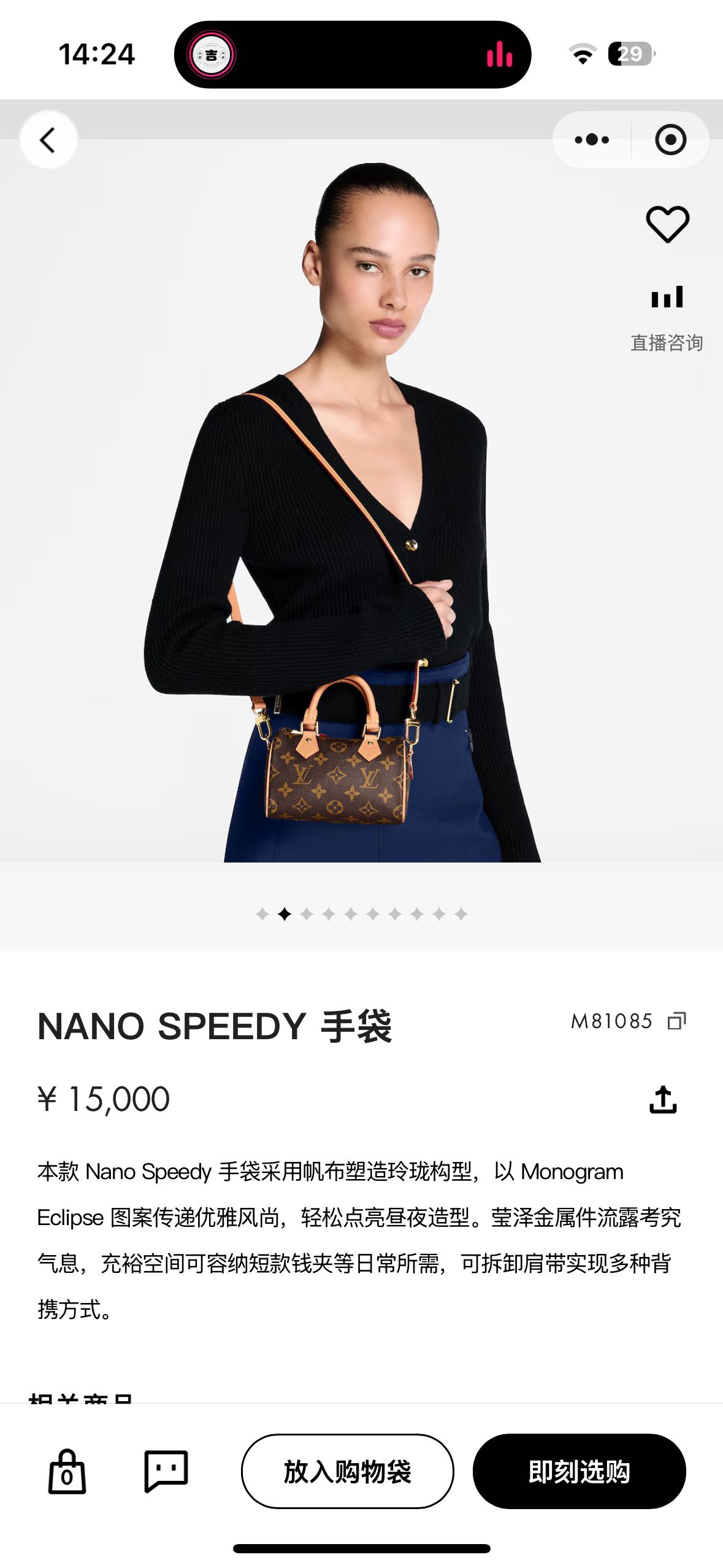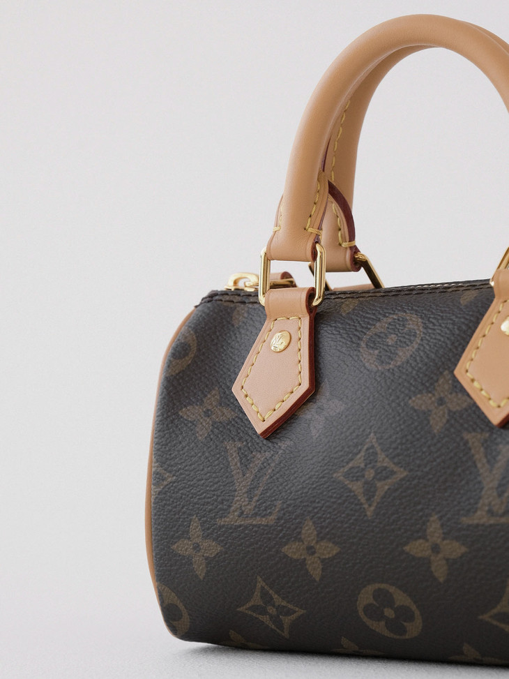 本款 Nano Speedy手袋采用帆布塑造玲珑构型,以MonogramEclipse 图案传递优雅风尚,轻松点亮昼夜造型。莹泽金属件流露考究气息,充裕空间可容纳短款钱夹等日常所需,可拆卸肩带实现多种背携方式。