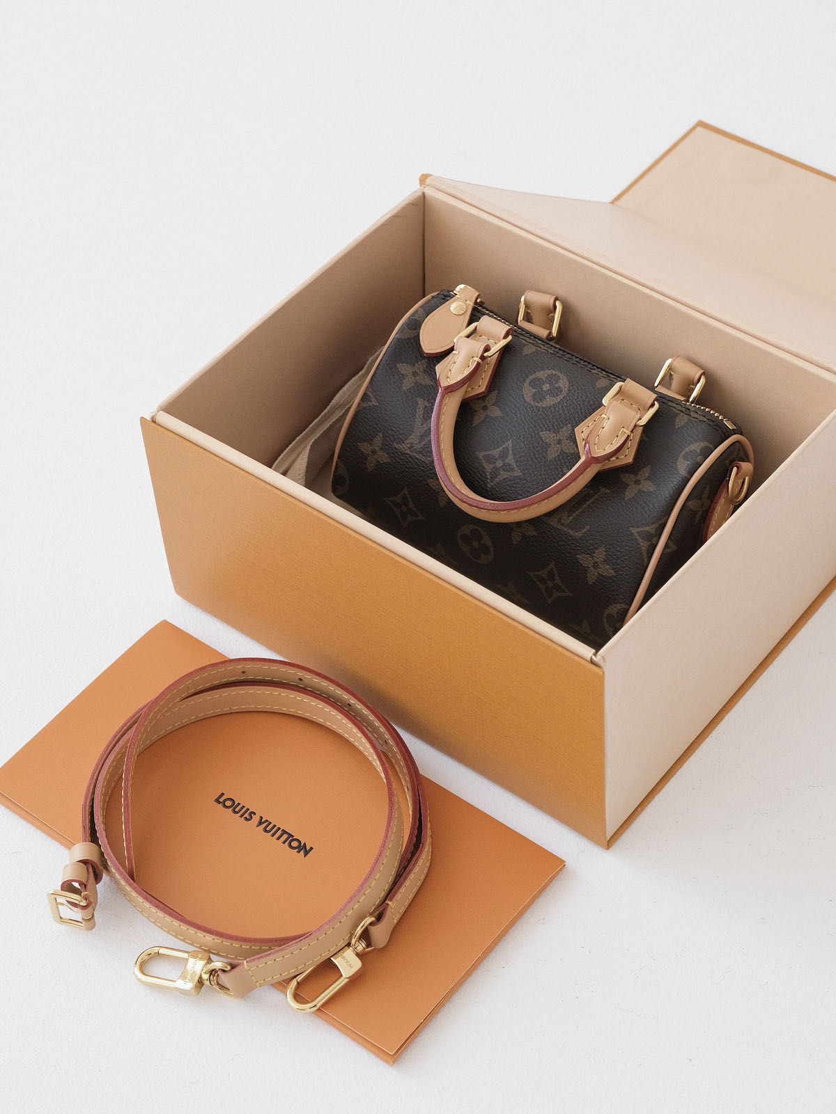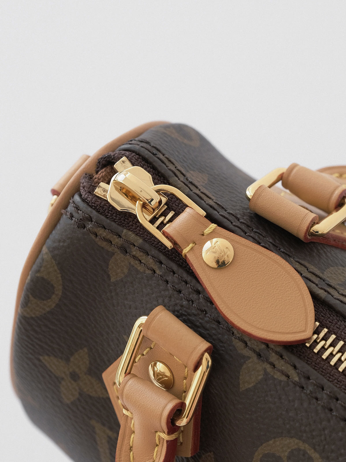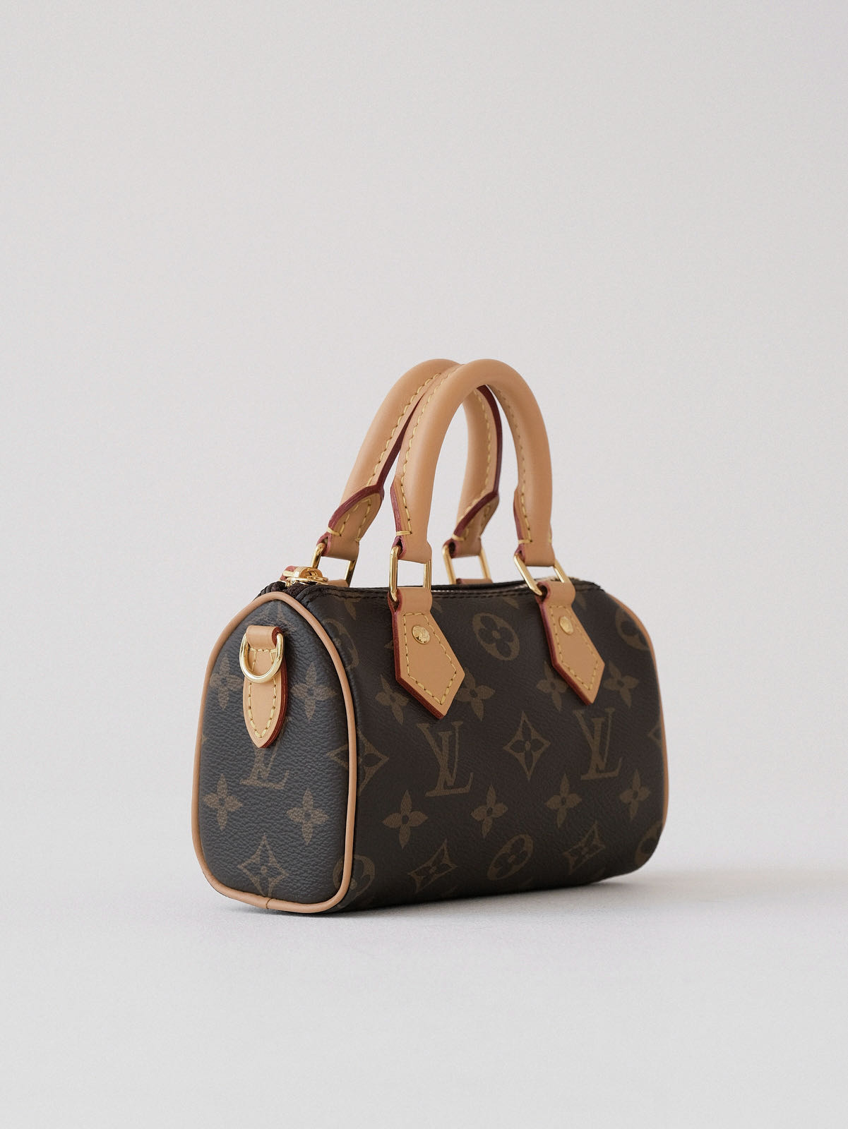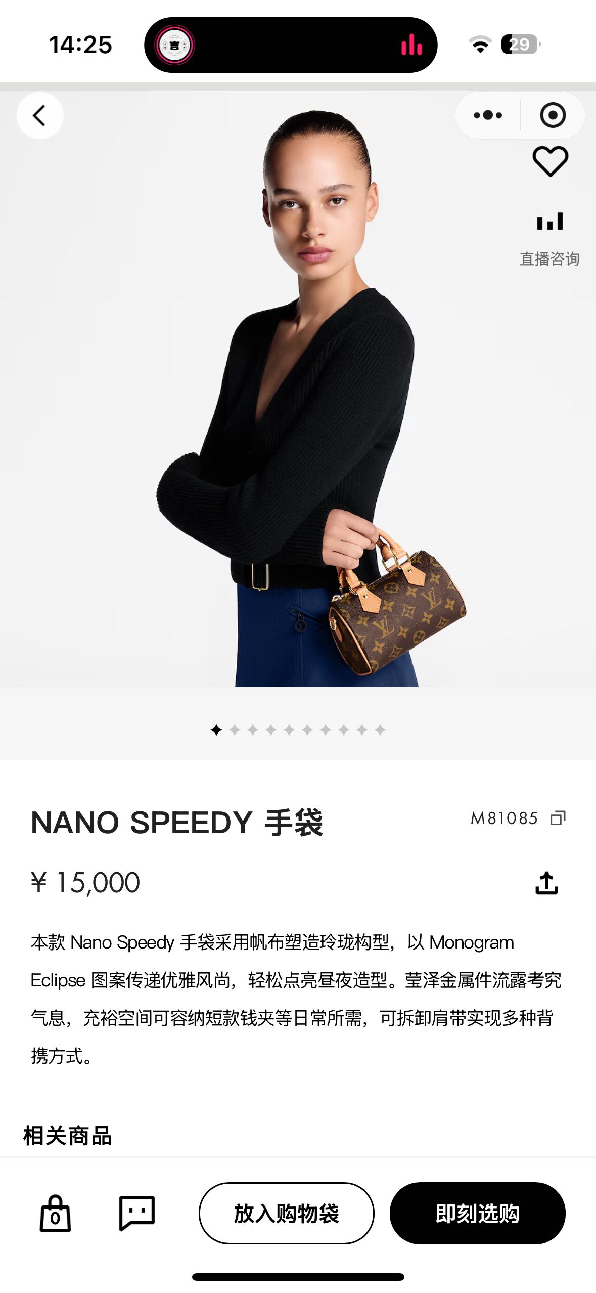 本款 Nano Speedy手袋采用帆布塑造玲珑构型,以MonogramEclipse 图案传递优雅风尚,轻松点亮昼夜造型。莹泽金属件流露考究气息,充裕空间可容纳短款钱夹等日常所需,可拆卸肩带实现多种背携方式。