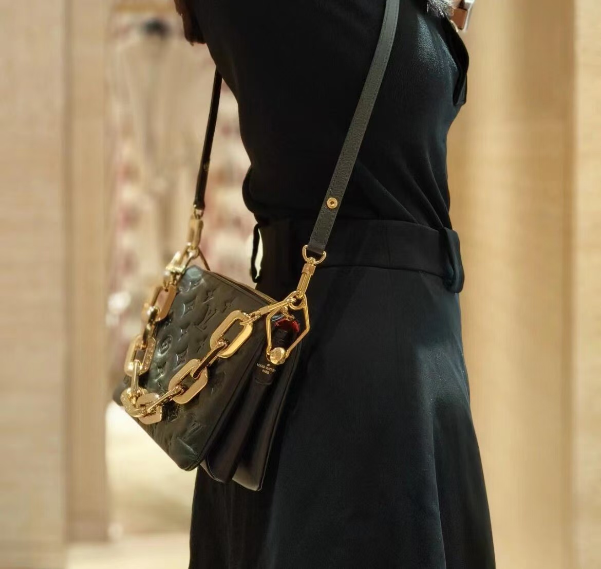 柔软加衬羊皮革压印 Monogram 图案,可拆卸链条嵌入缤纷色彩,可拆卸皮革肩带实现多种背携方式。