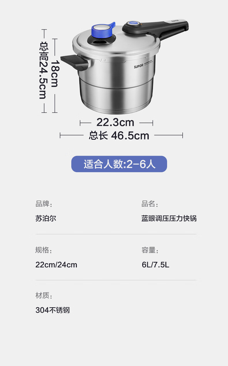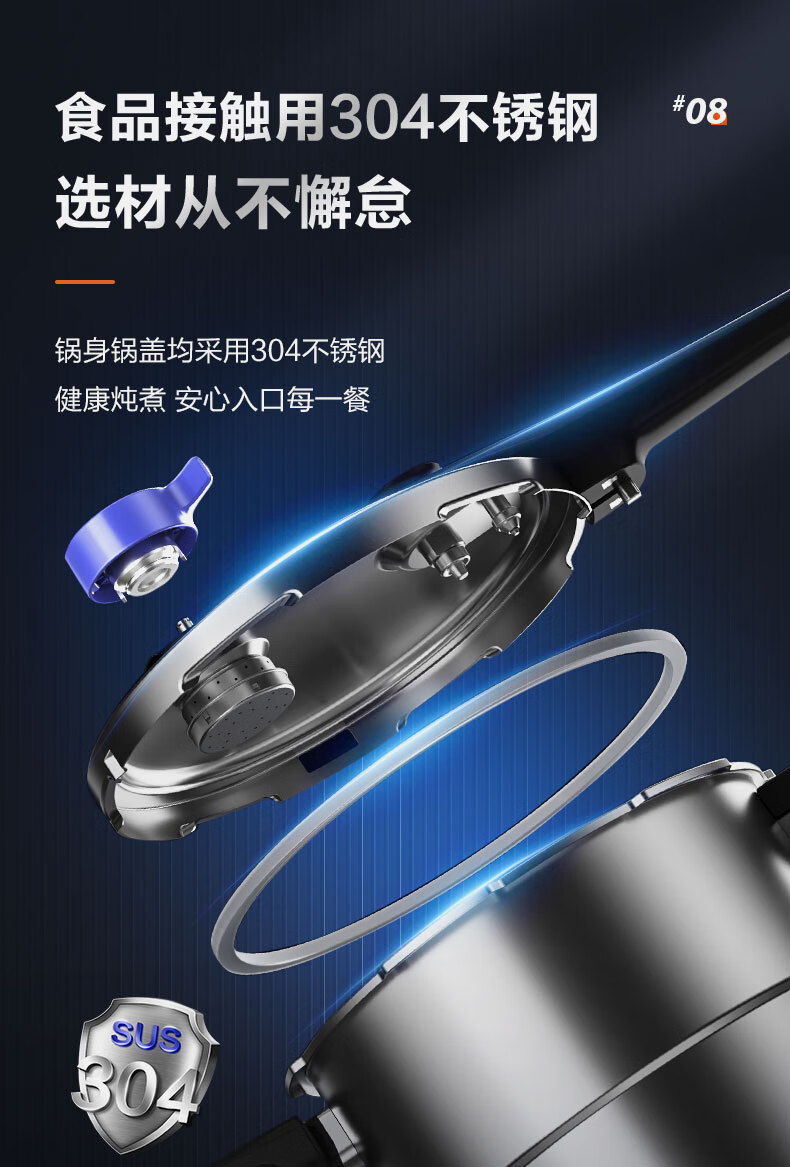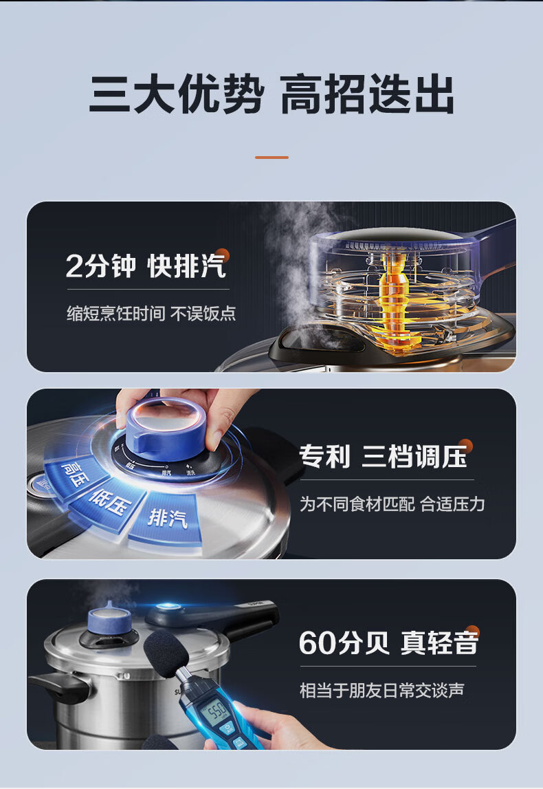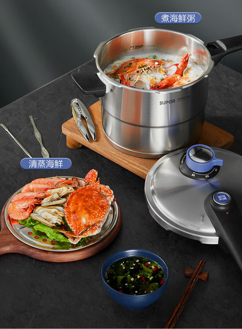 苏泊尔SUPOR304不锈钢家用快煮高压锅22cm复底加厚磁炉燃气通用YW22LT1低分贝三档