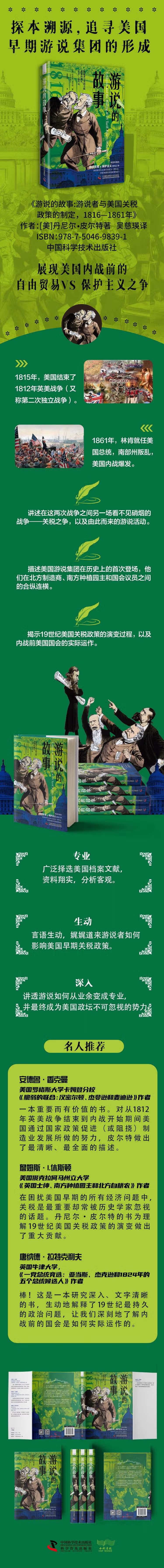 1815年,美国结束了1812年美英战争,外患已消。1861年,林肯当选美国总统,南部州叛乱,内战爆发。 而在这期间,美国的制造商、农场主和议员之间,则围绕着关税政策,发生了一场看不见硝烟的战争。对于这个当时关注度仅次于废奴的焦点话题,保护主义者和自由贸易者各执一端,奔走呼号,游说随之而生,并从业余走向专业,影响了关税政策的制定和落地。 本书依托翔实的资料,娓娓道来这一时期美国国会的内部运作,国会内外的立场表达与利益交互,各党派、各区域、各利益集团之间的勾连与妥协,公心与私利,阳谋与暗斗。内战的爆发为这场争议画下了休止符,但游说的故事仍在继续……