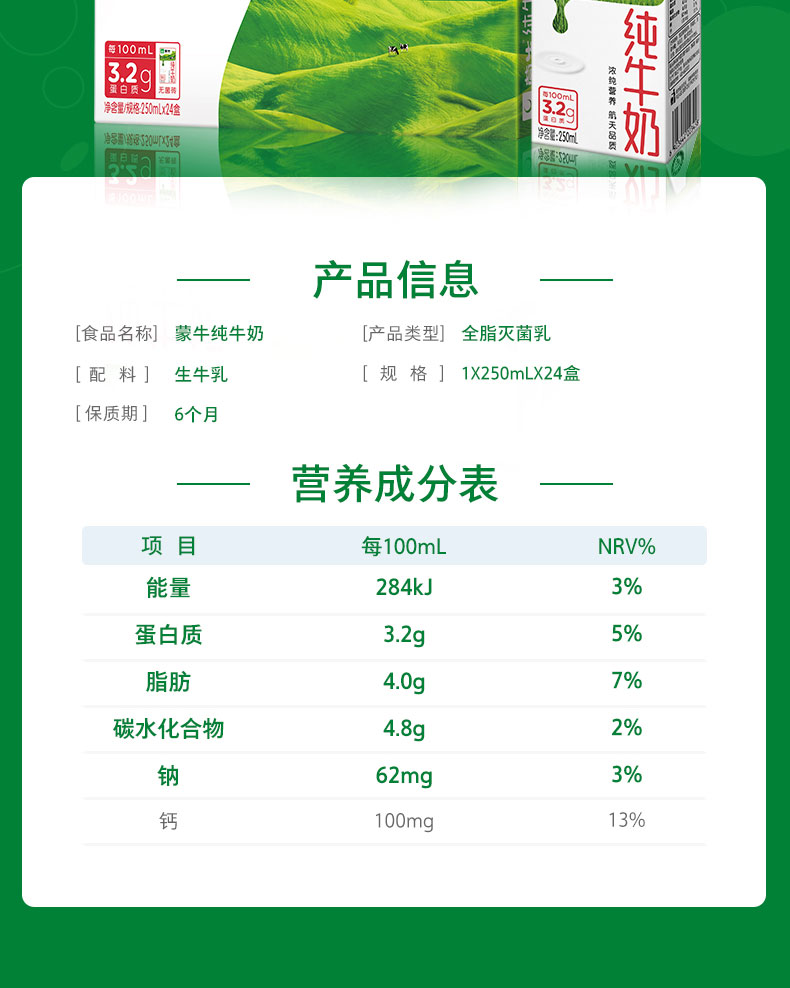 蒙牛纯牛奶3.2g蛋白质 浓纯营养 250ml*24瓶/提
