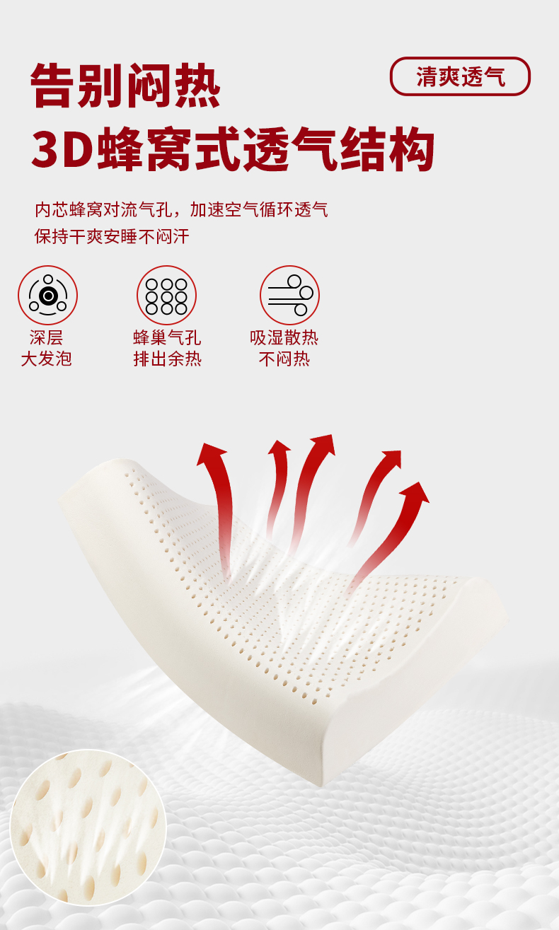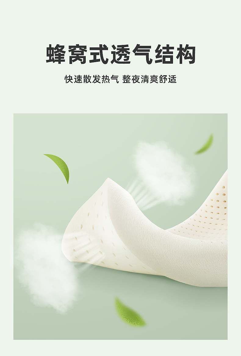 天然乳胶自然形成的细小蜂巢结构透气孔,打造空气微循环系统。快速散发人体的热量与湿气,吸湿透气,告别闷热烦躁,整夜干爽舒适深睡眠。