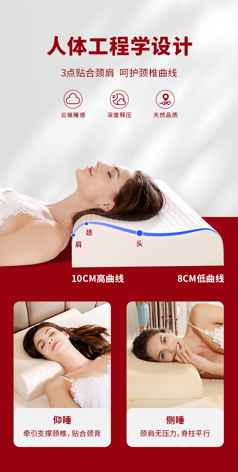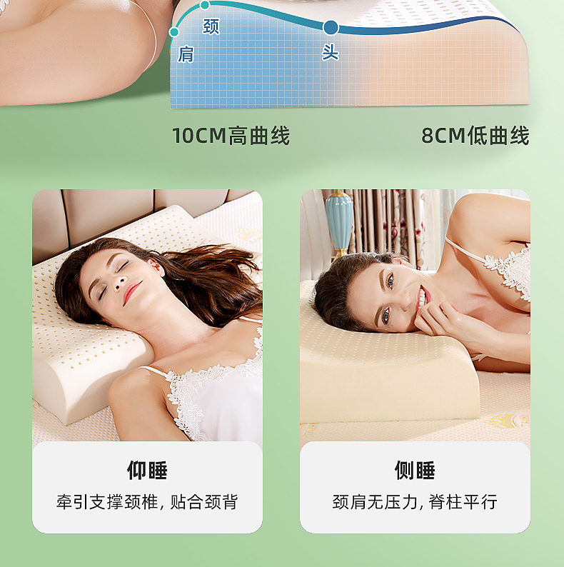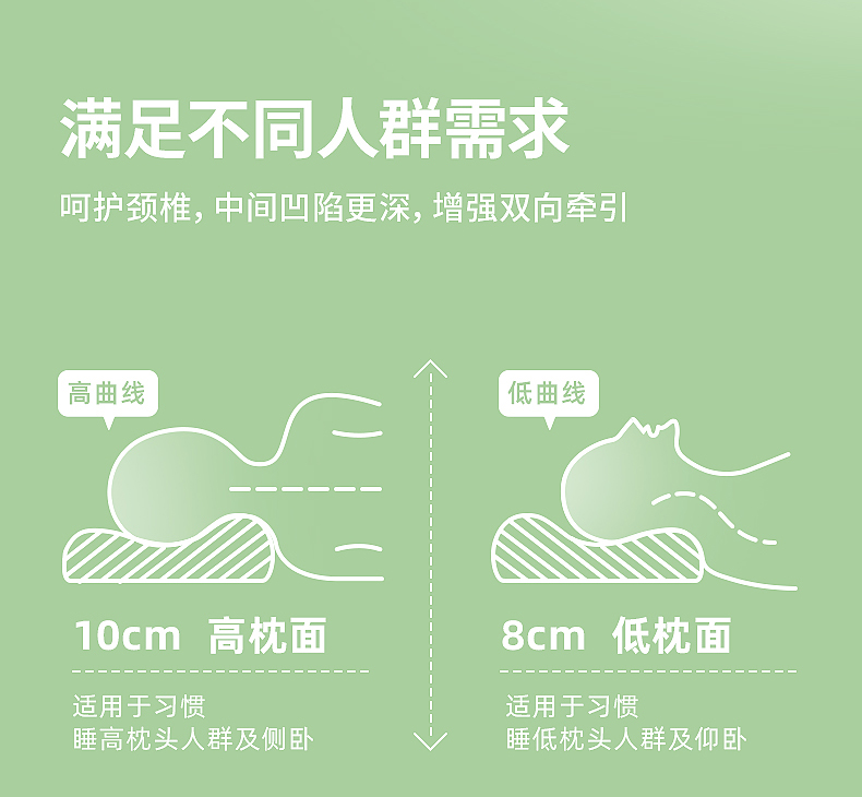 低曲线,10/8cm低枕面,适用于习惯睡低枕头人群及仰卧。