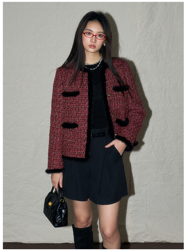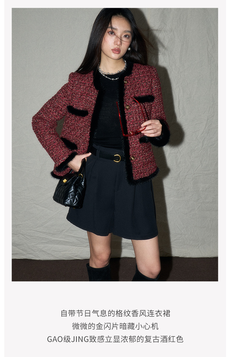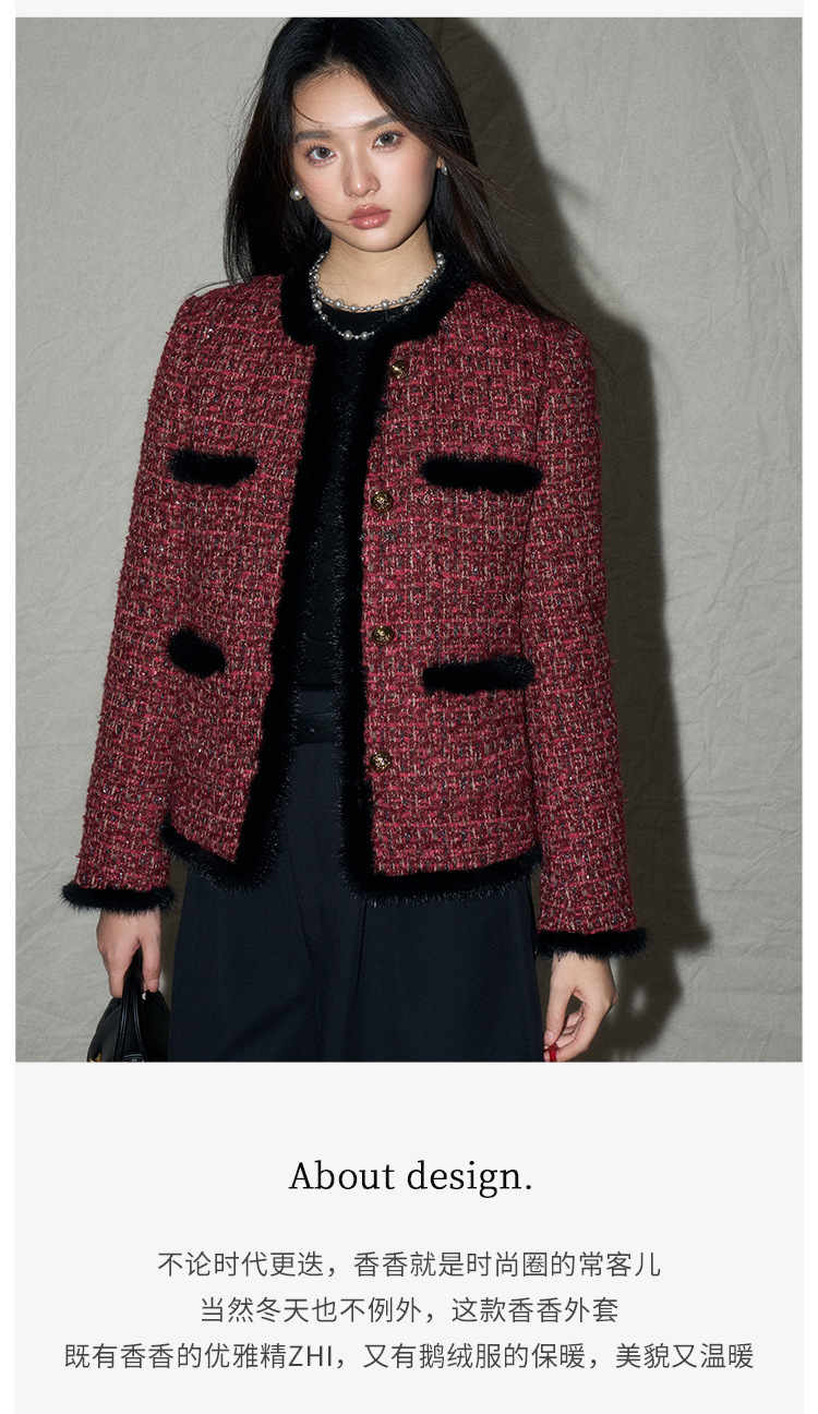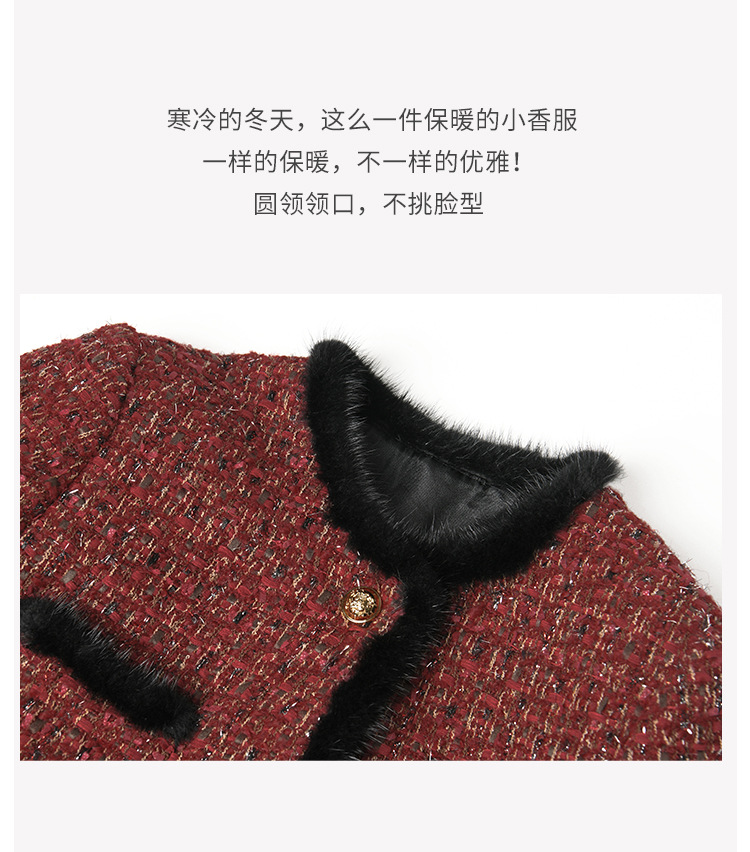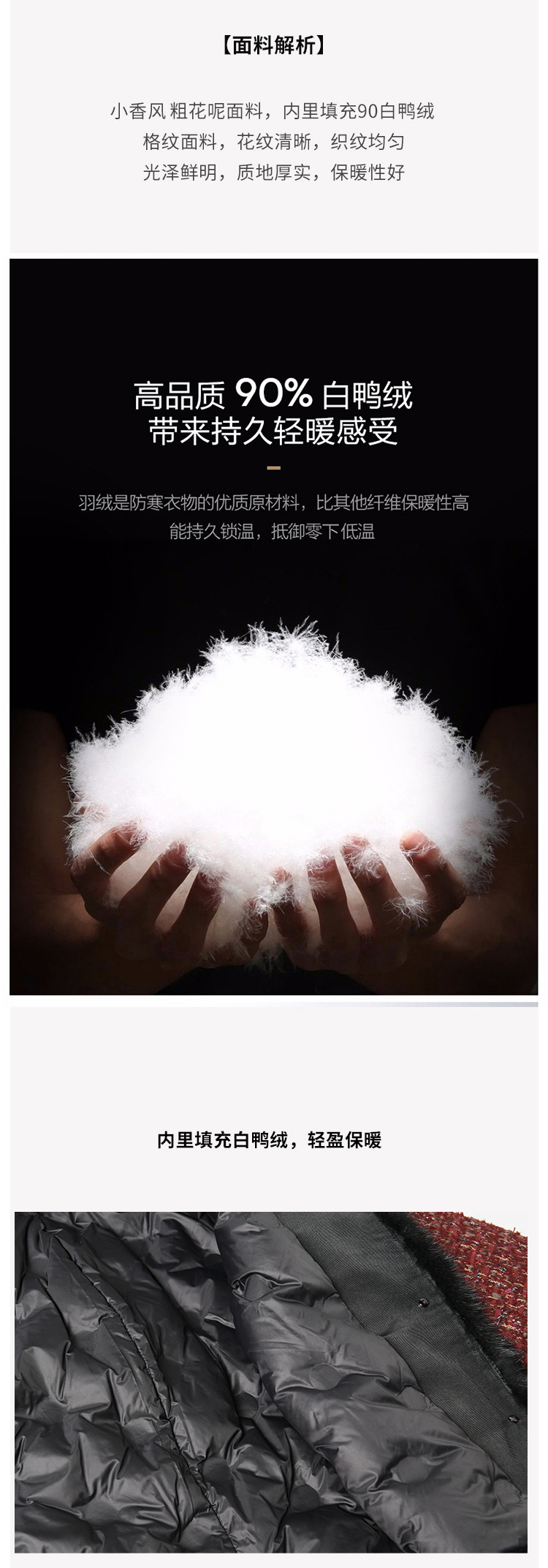 24冬新复古红羊毛小香粗花呢水貂拼接90白鸭绒羽绒服外套!