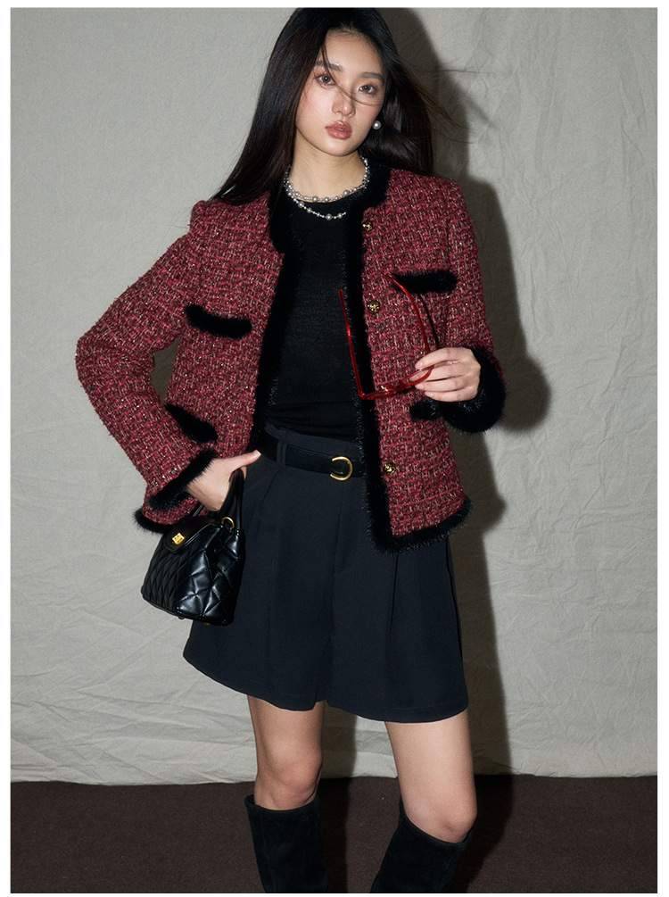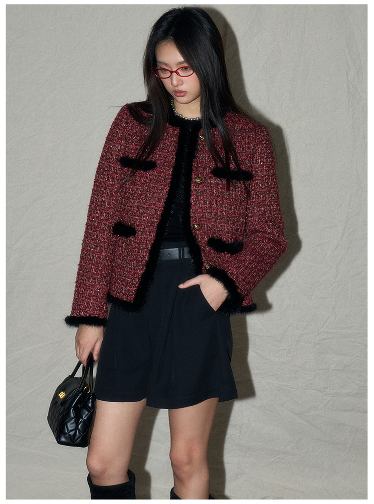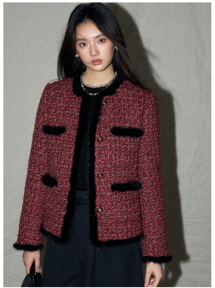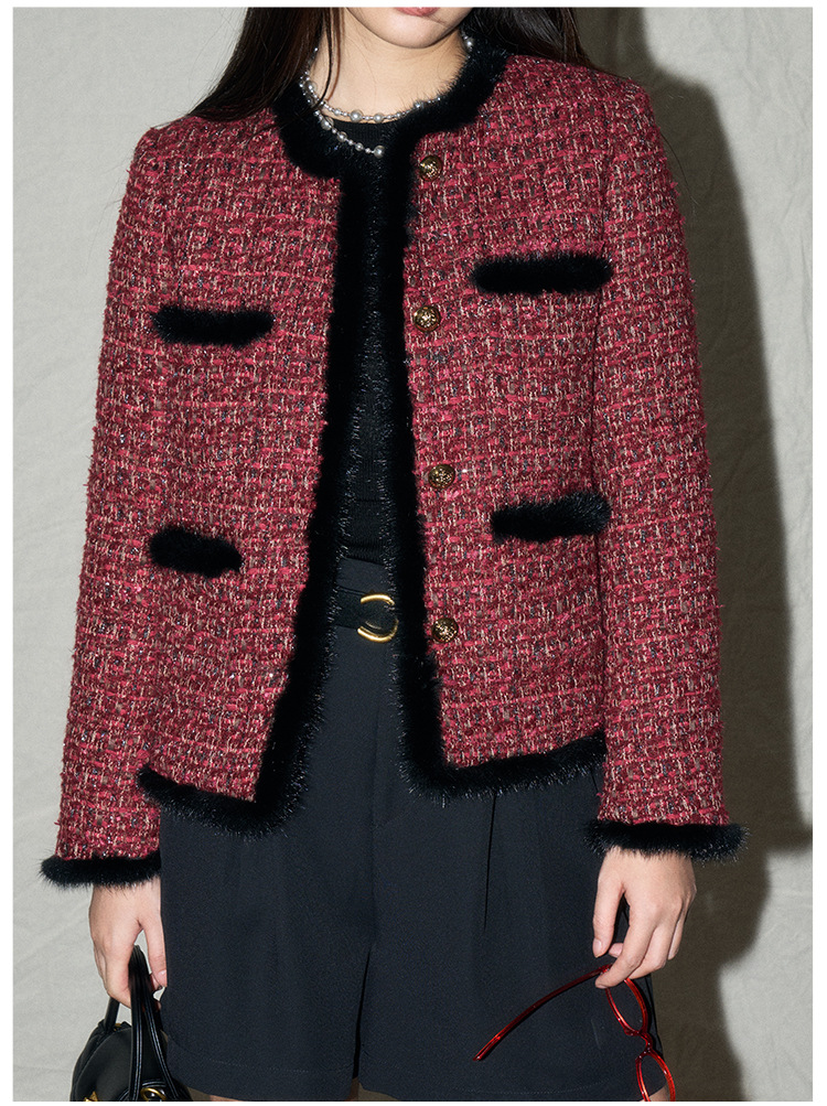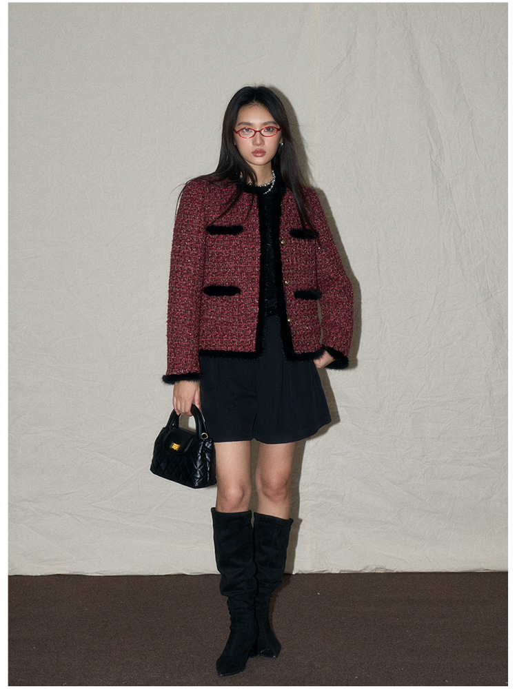 24冬新复古红羊毛小香粗花呢水貂拼接90白鸭绒羽绒服外套!
