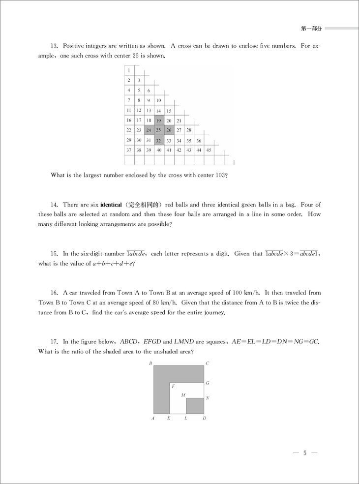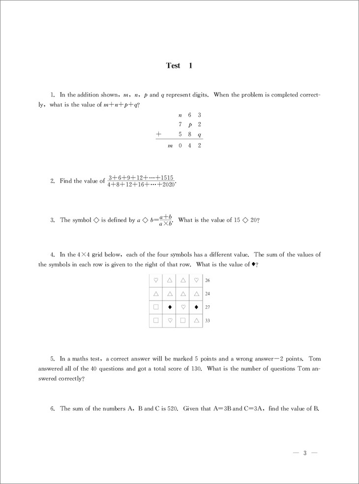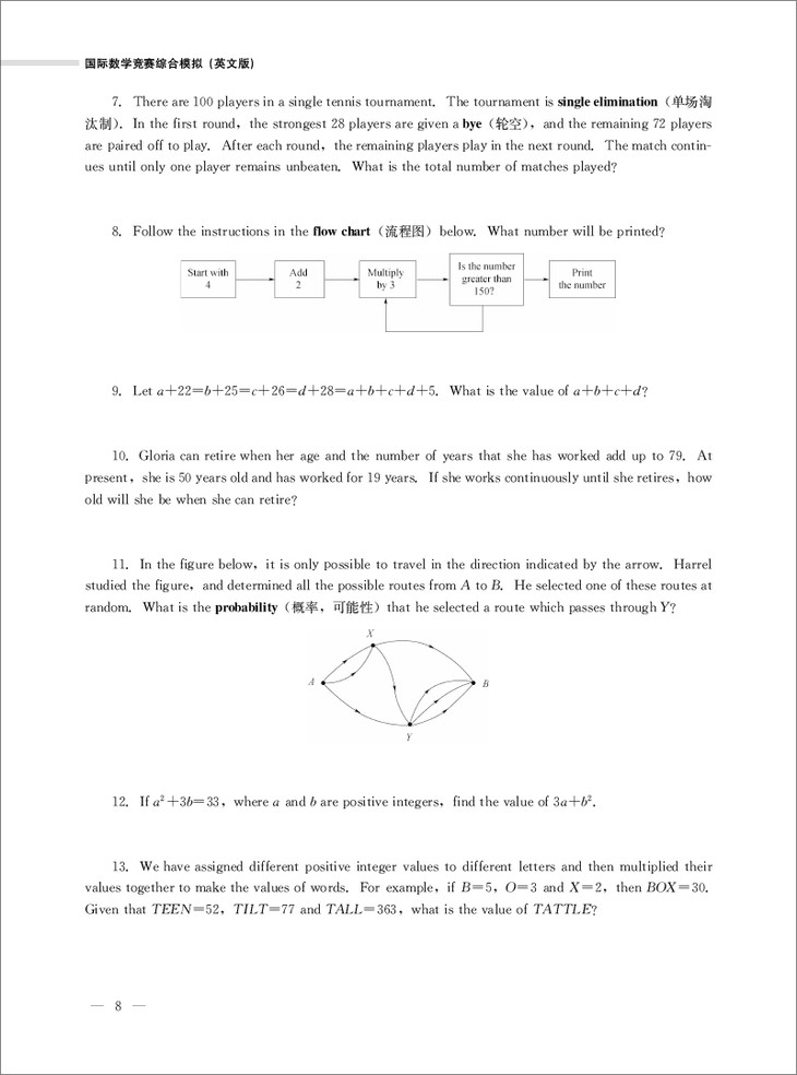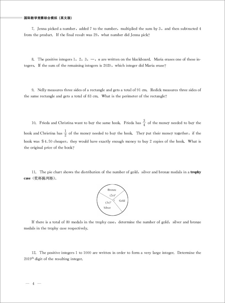 本书的习题为英文表述,为孩子提供了按国际标准检测自己数学水平的机会,也为家长打开了一扇了解国际数学竞赛的窗口。书后附的详细解答为中文表述,以便于家长对孩子的辅导。限于时间和学识,本书难免存在疏漏之处,欢迎广大读者提出意见和建议,以便我社再版时加以修正,真诚感谢您的帮助!