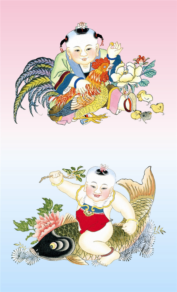 《吉娃》:版画 天津杨柳青 胖娃手抚公鸡,小鸡一旁嬉玩。杨柳青版画兼有刻版和上彩特点,别具手绘浓淡之趣。