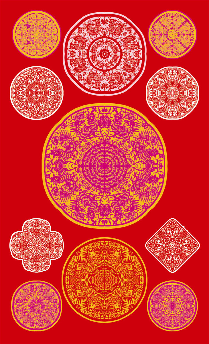 团花又称顶花,由两次或多次对角折叠剪出,产生具有中心点、向周围放射状呈现的对称图形。北方人贴团花于天花板上,以其通天辟邪,具有护佑家宅之意。此张十一幅团花皆以鸡为主题,搭配花草鱼鸟来传达福寿喜财种种吉祥美意,祝福鸡年家家户户大吉大利、吉星高照。