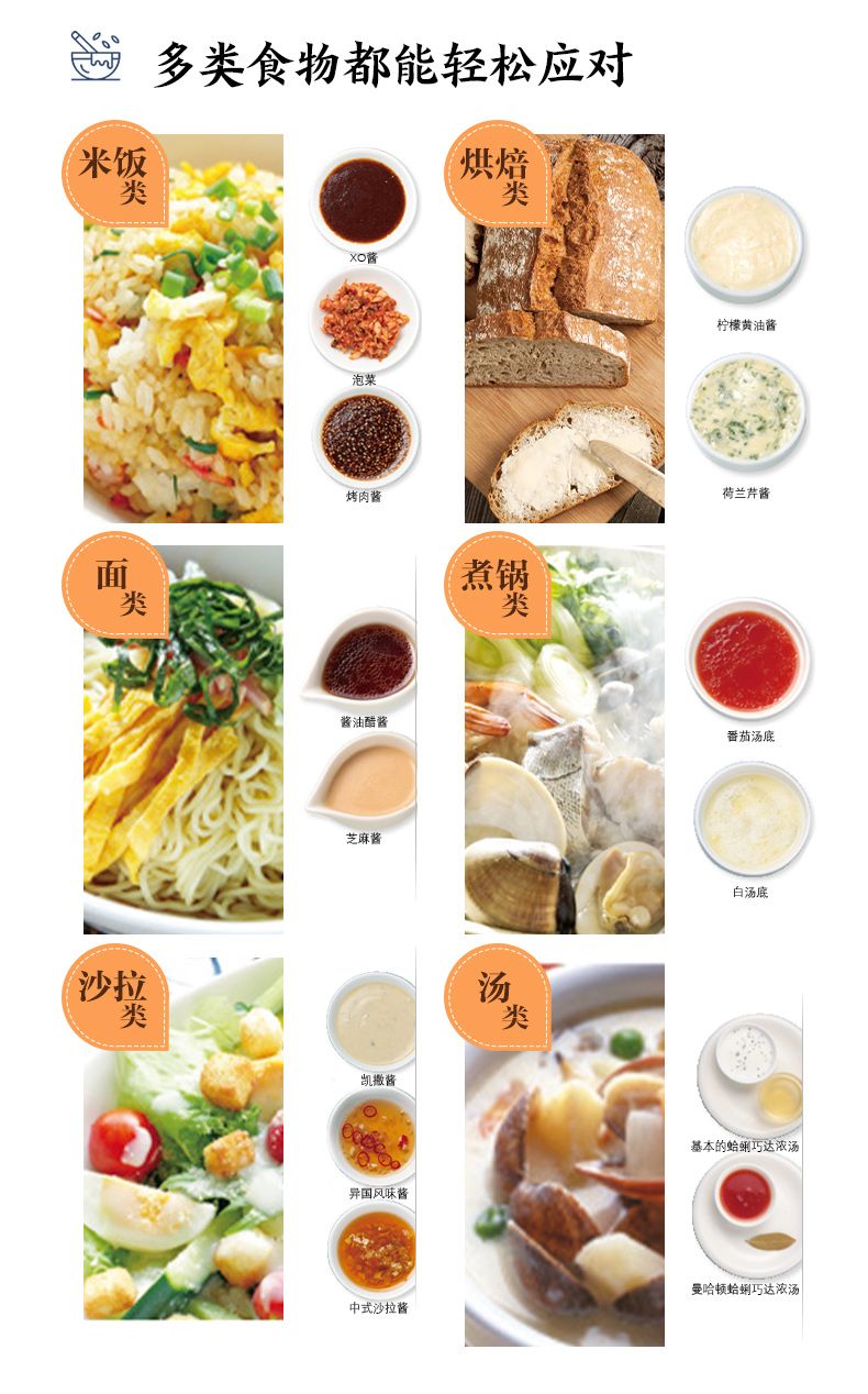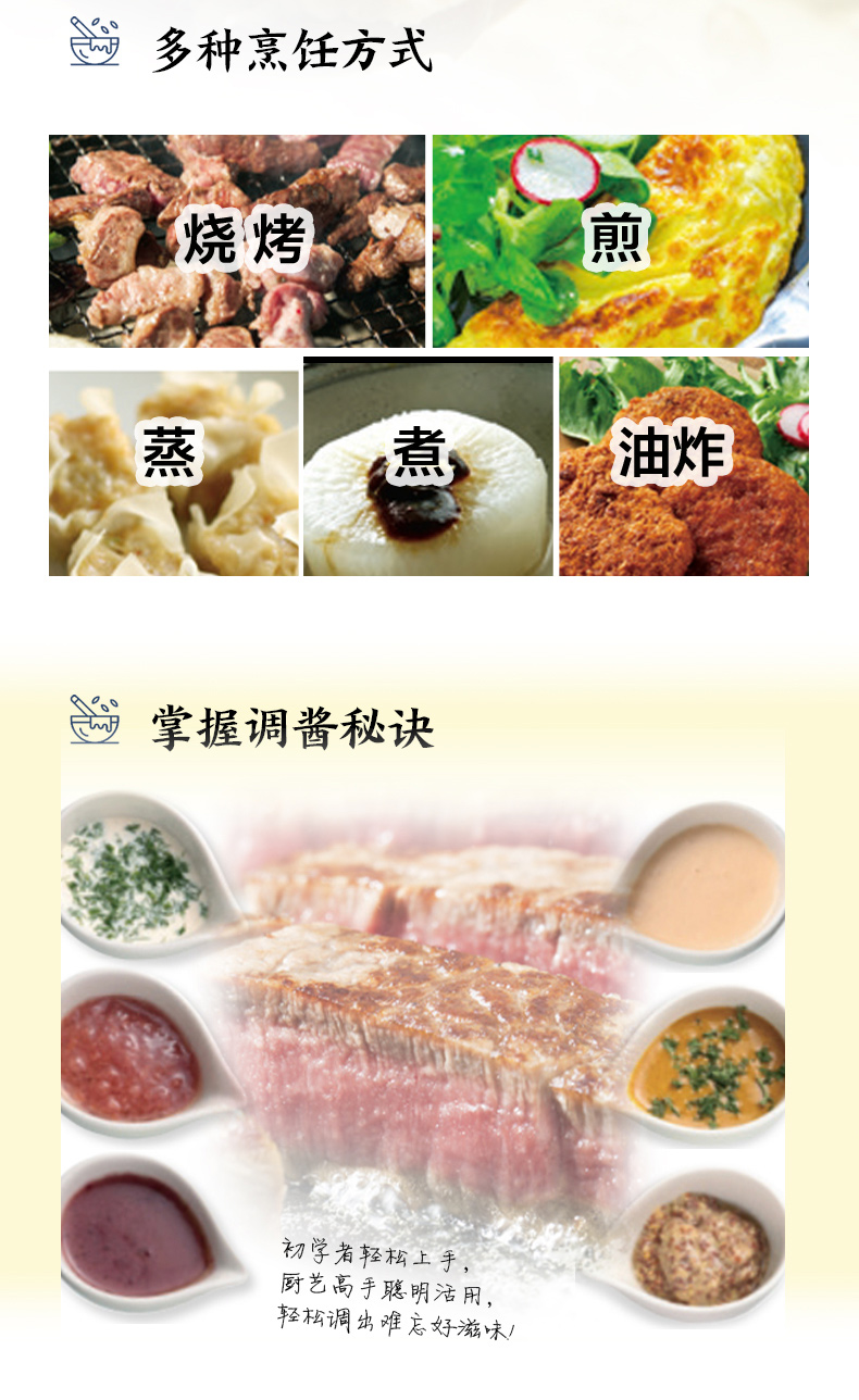 掌握调酱秘诀,烧烤、煎、蒸、煮、油炸等各种烹饪方式,饭类、烘焙类、面类、煮锅类、沙拉类等各类食物,都能轻松应对