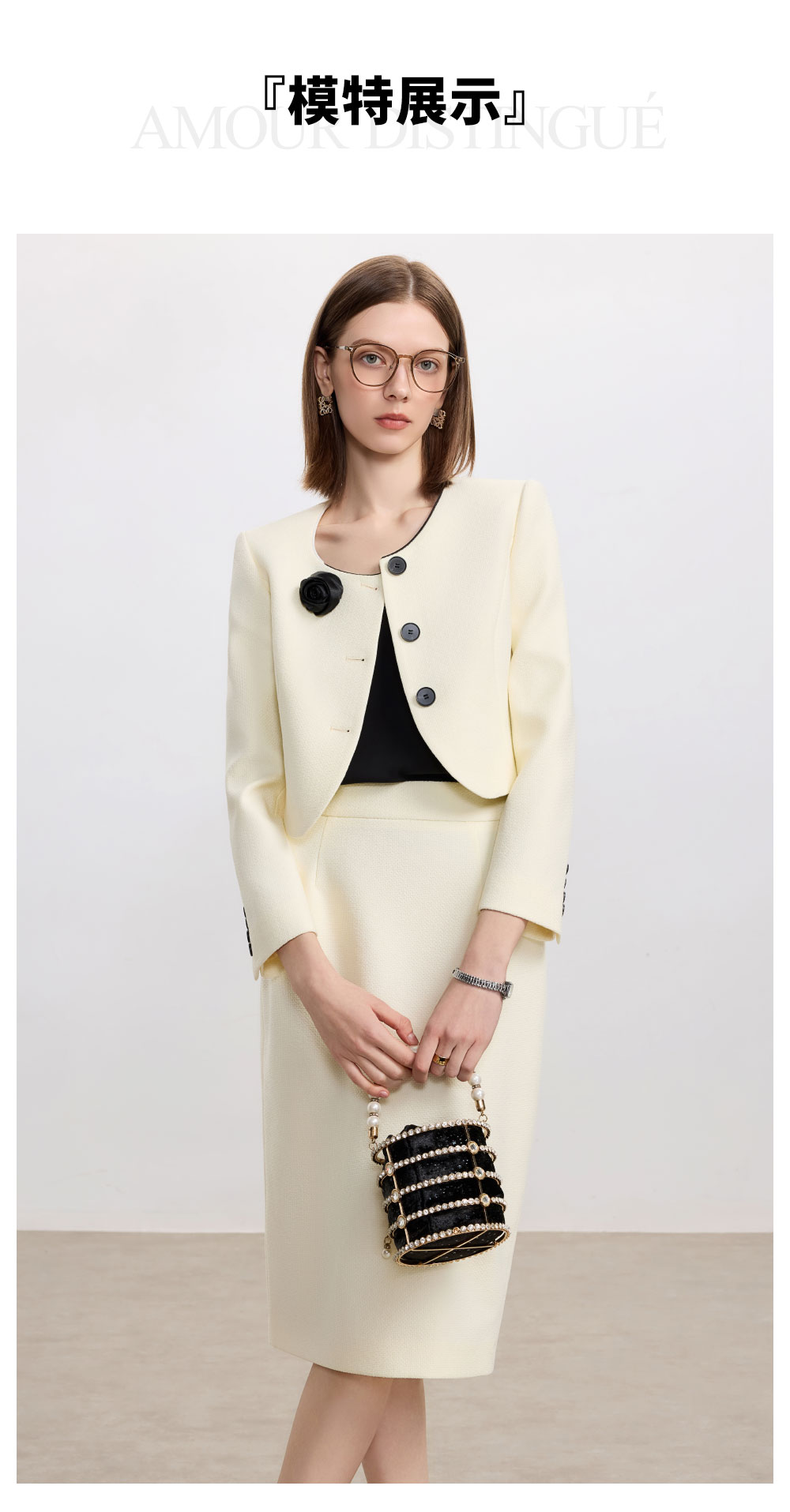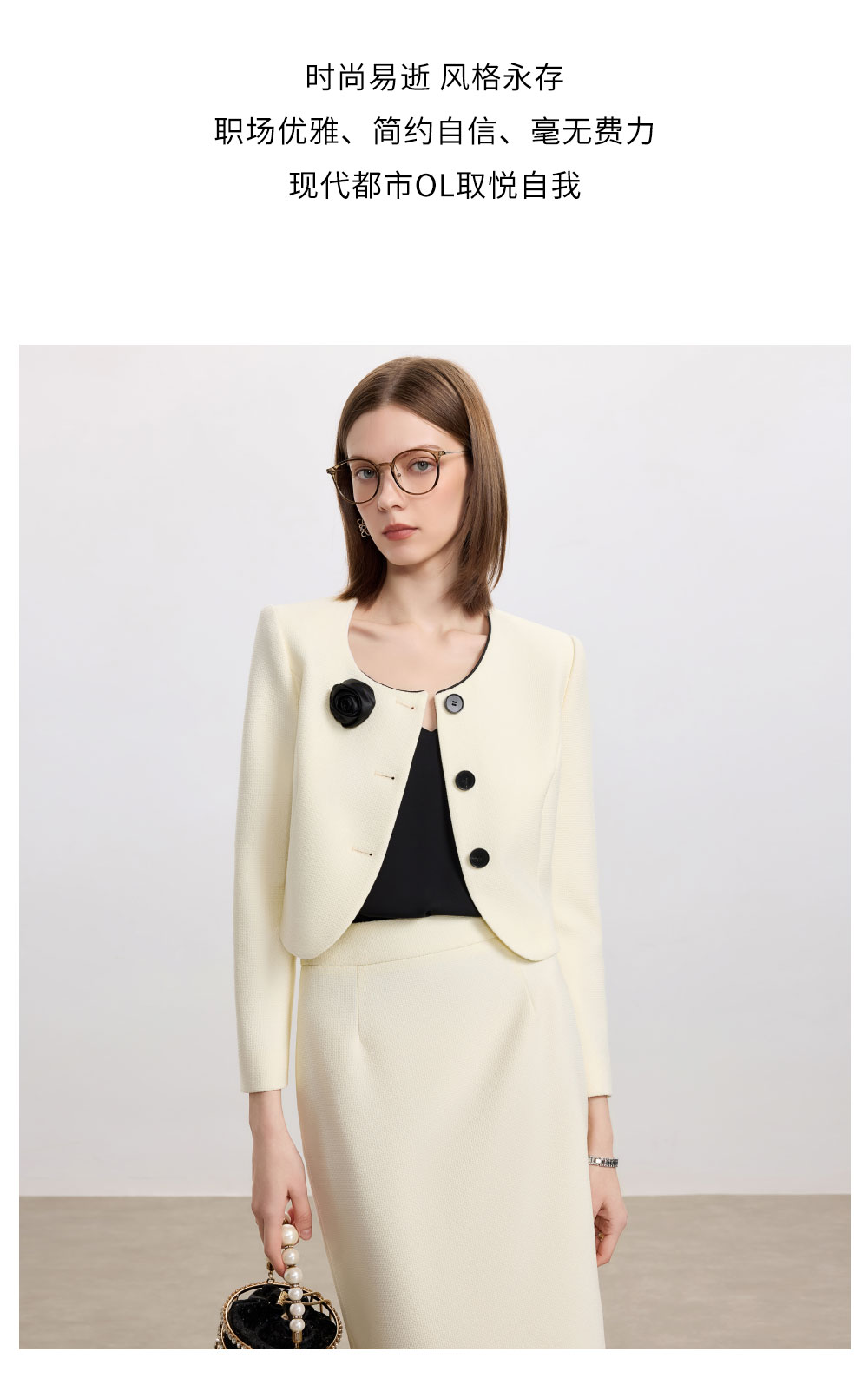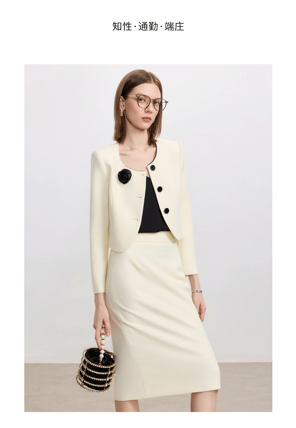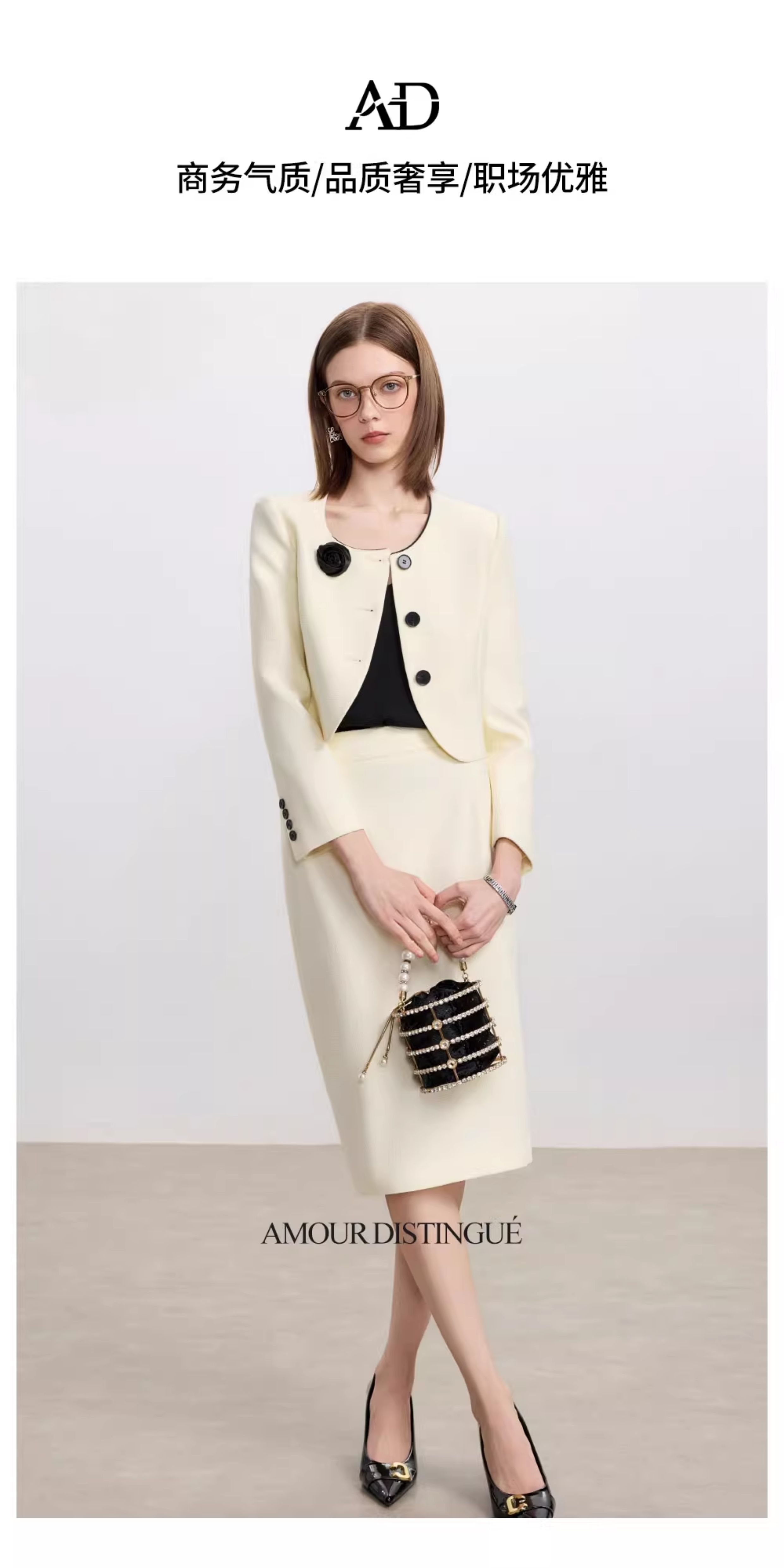 AD米白色名媛范两件套女高腰半身裙秋冬新款职场通勤圆领短外套