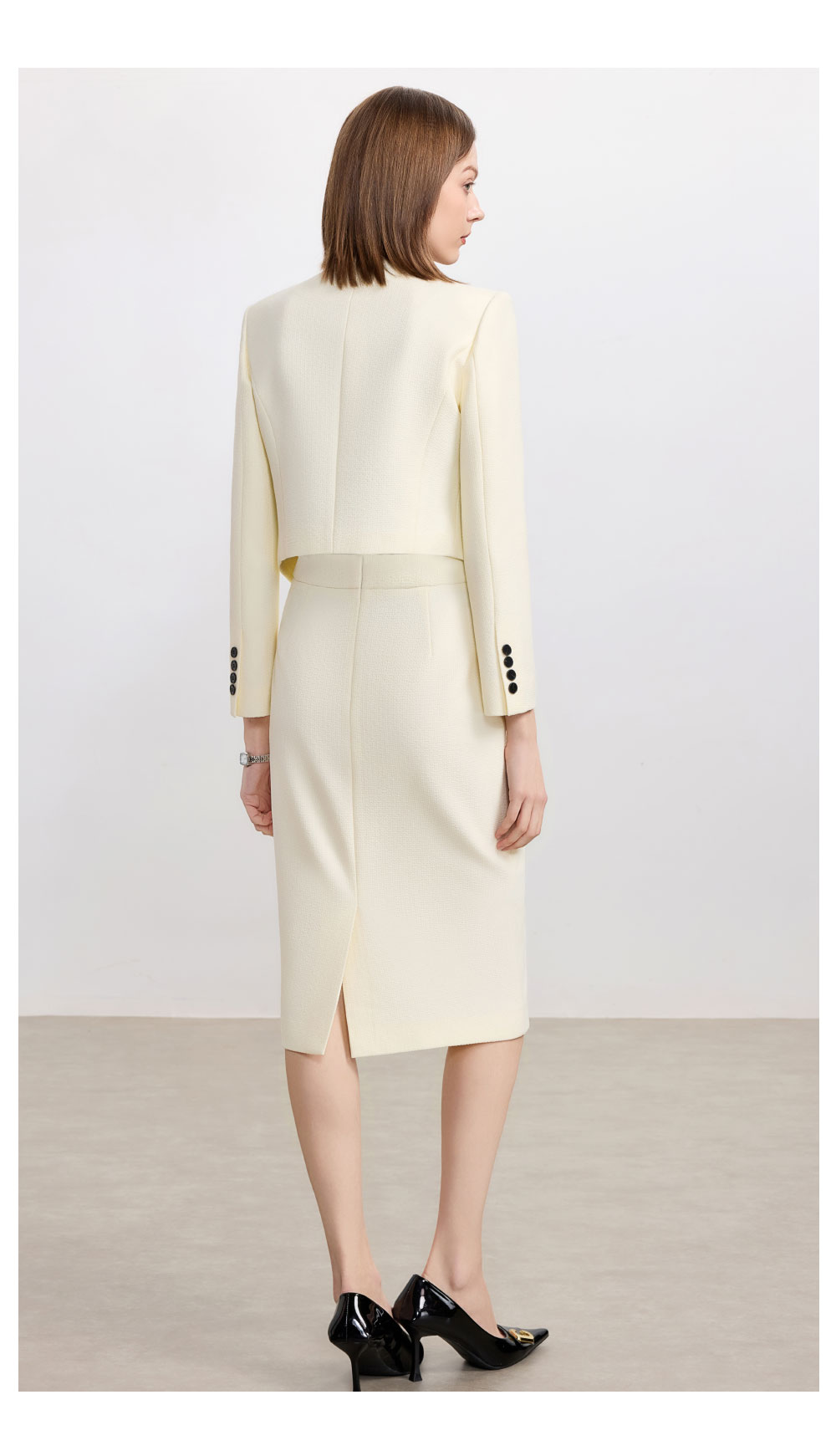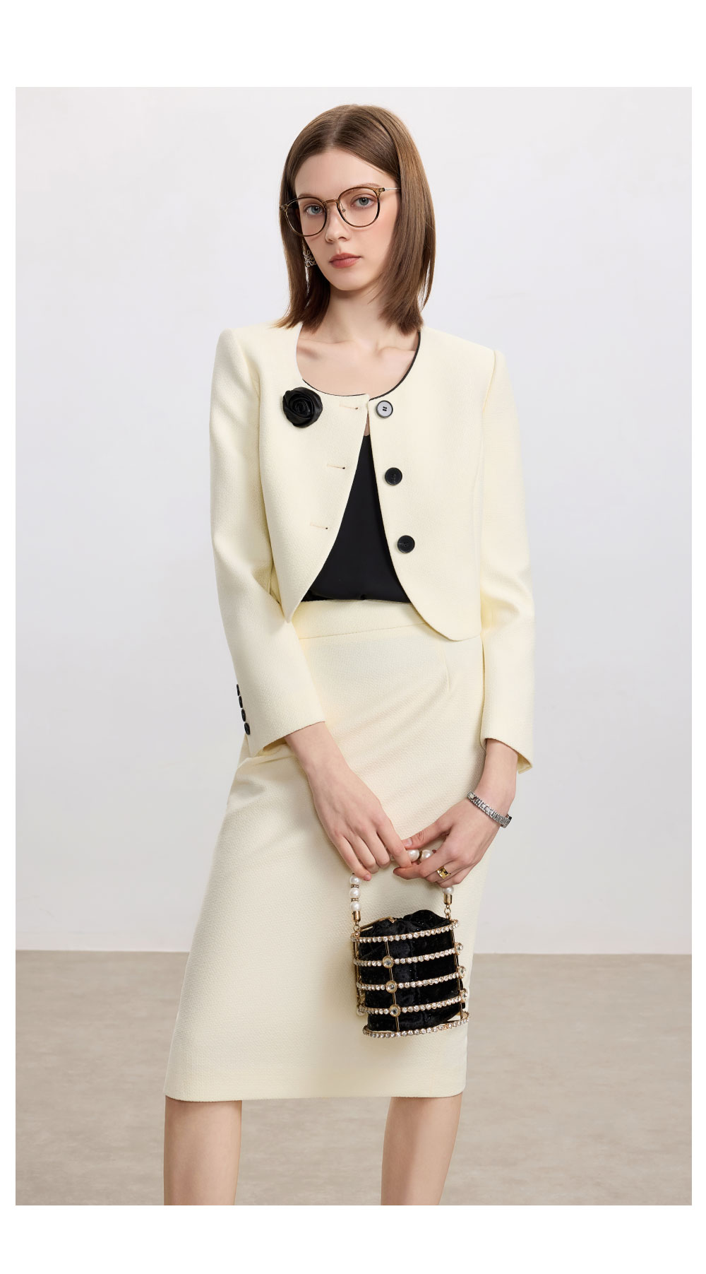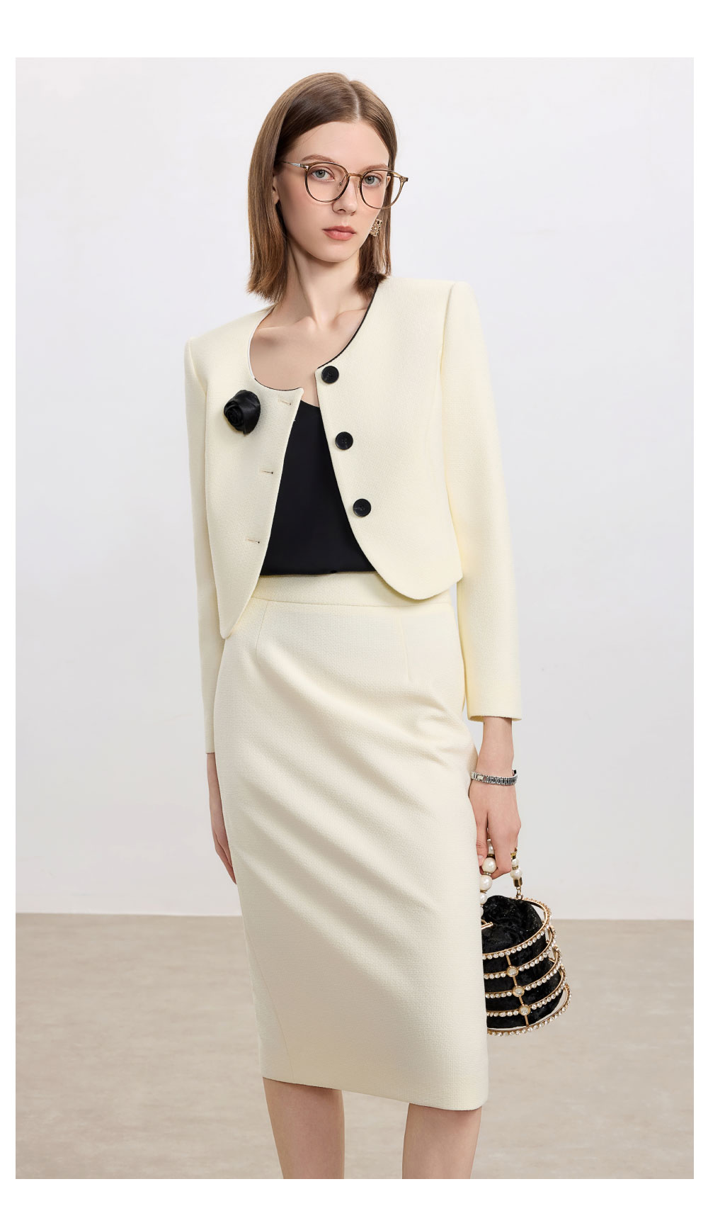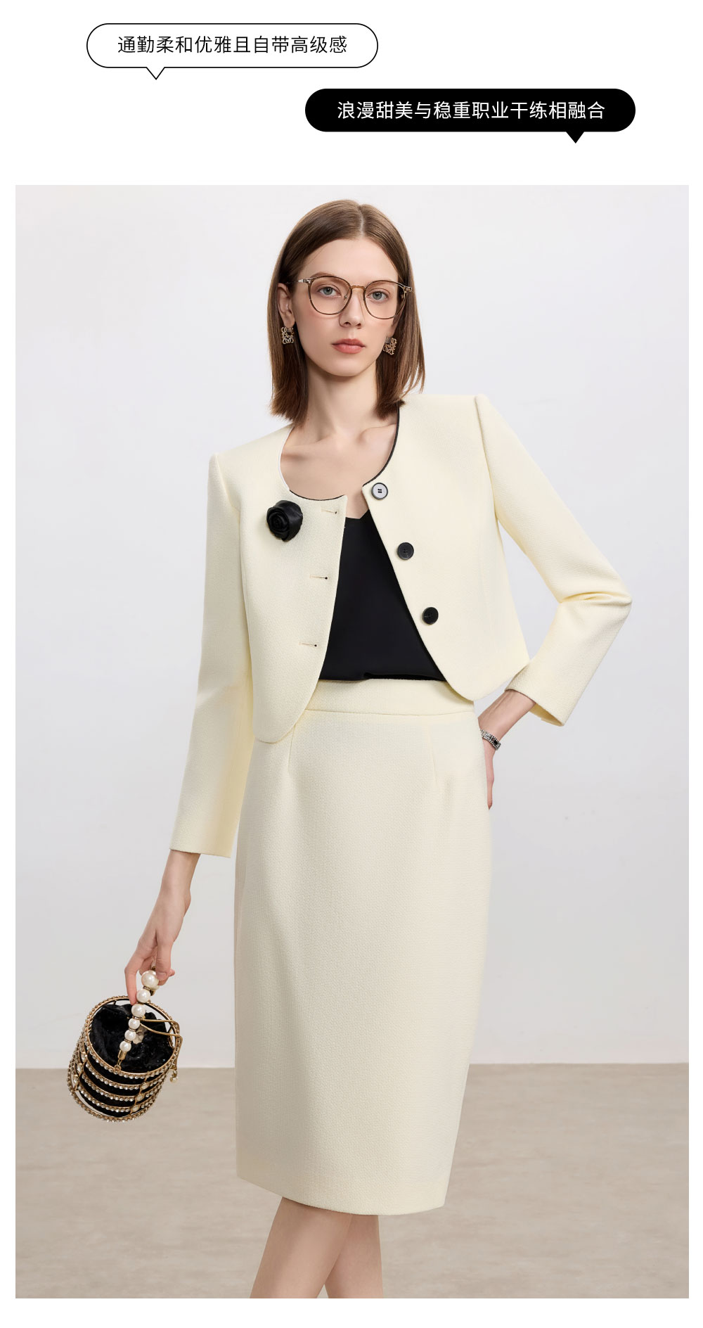 AD米白色名媛范两件套女高腰半身裙秋冬新款职场通勤圆领短外套