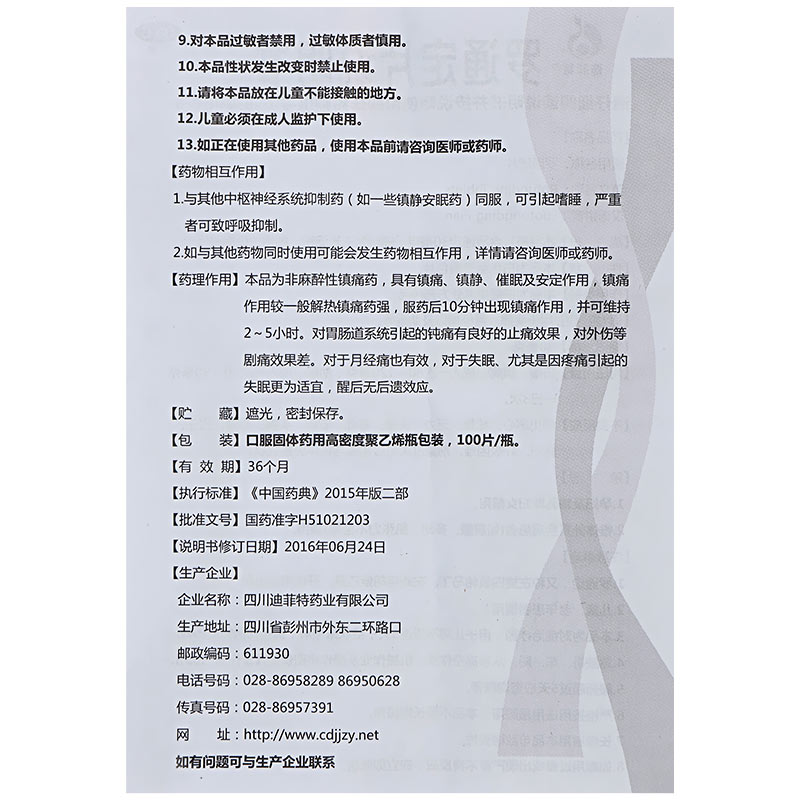 迪菲特 罗通定片100片失眠 用于头痛疼痛 月经痛止痛 助睡眠