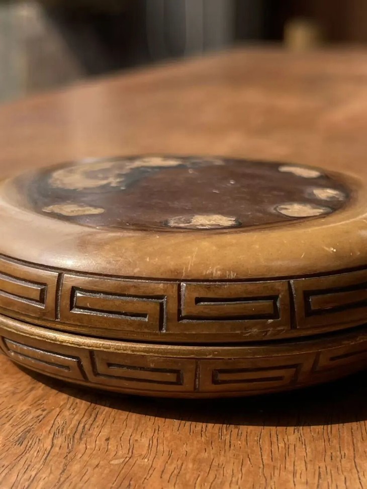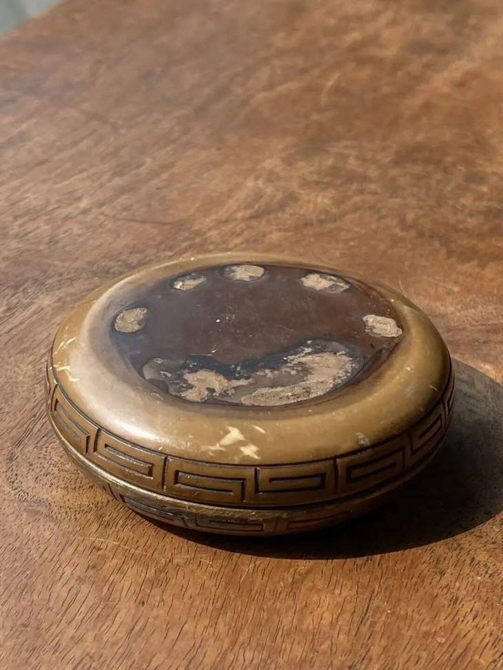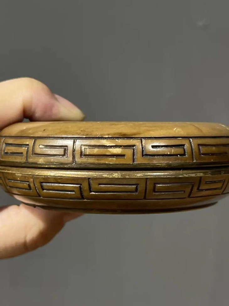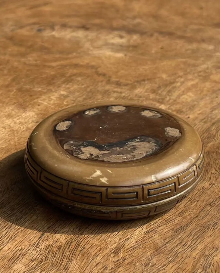 这是一件以天然寿山石镶嵌青銅胆的盖盒,是民国时期文人的高端书房用具,此印泥盒圆饼造型优雅,青銅盖盒,口沿雕回纹,盒盖上方镶嵌寿山石,盒内保留油形朱砂印泥。