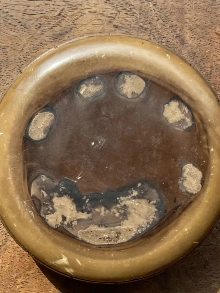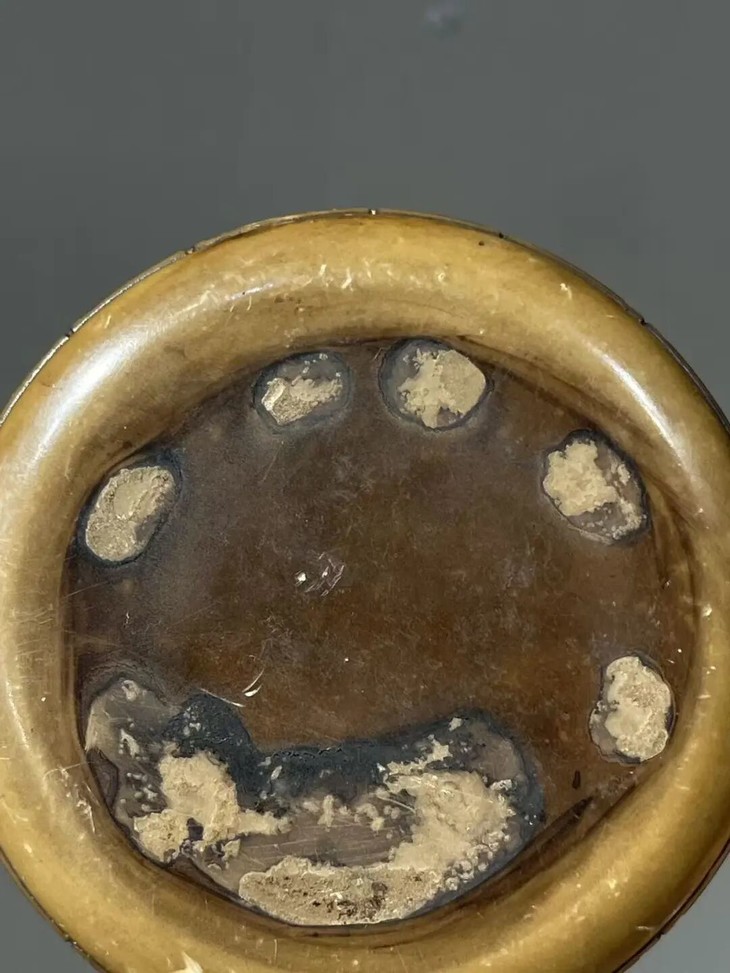 此圆饼形镶寿山石青銅印泥盒,如图所示除长年使用,边沿有数处小嗑碰与刮痕、寿山石面磨损痕,除此以外,无其他明显损伤,印泥盒内保留原装老印泥。