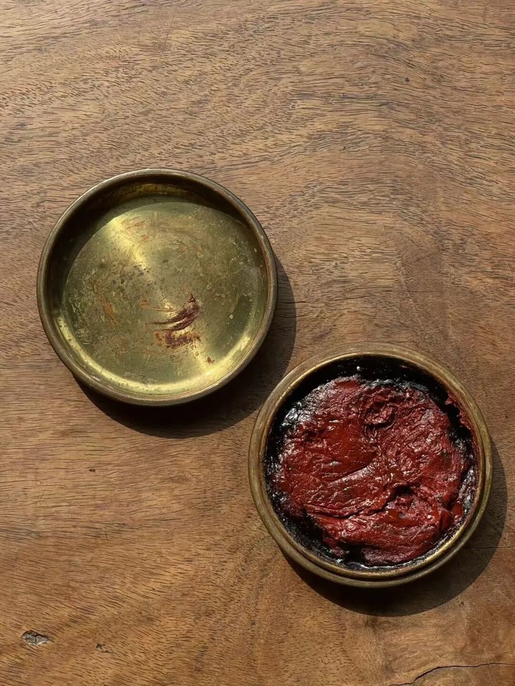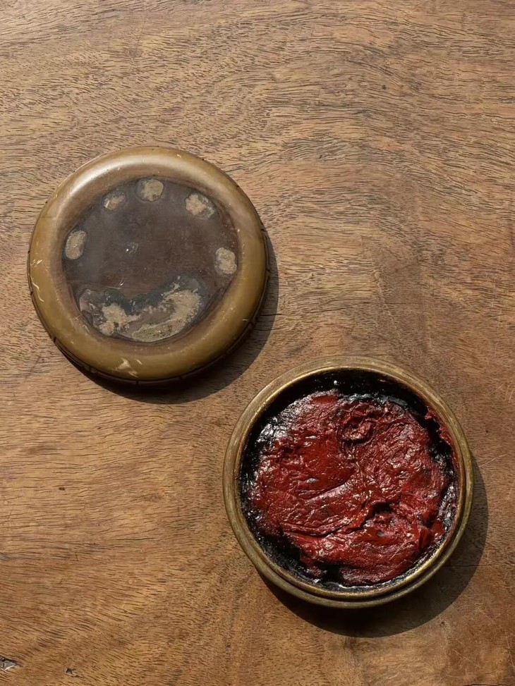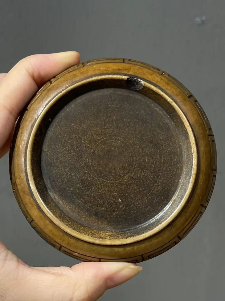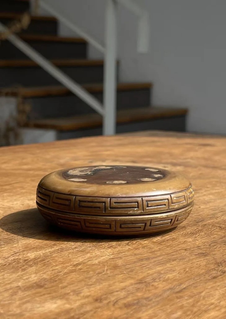 有别于近代许多雕刻着繁复且俗气纹饰,这件器形简约朴实的圆饼形印泥盒,整体设计干净利落、精致典雅,青銅雕琢与寿山石琢磨工艺与细节之处理一丝不苟,器身线条与弧面精准完美,细节处处精致绝美,无一例外。是至少有八十年历史之老印泥盒。