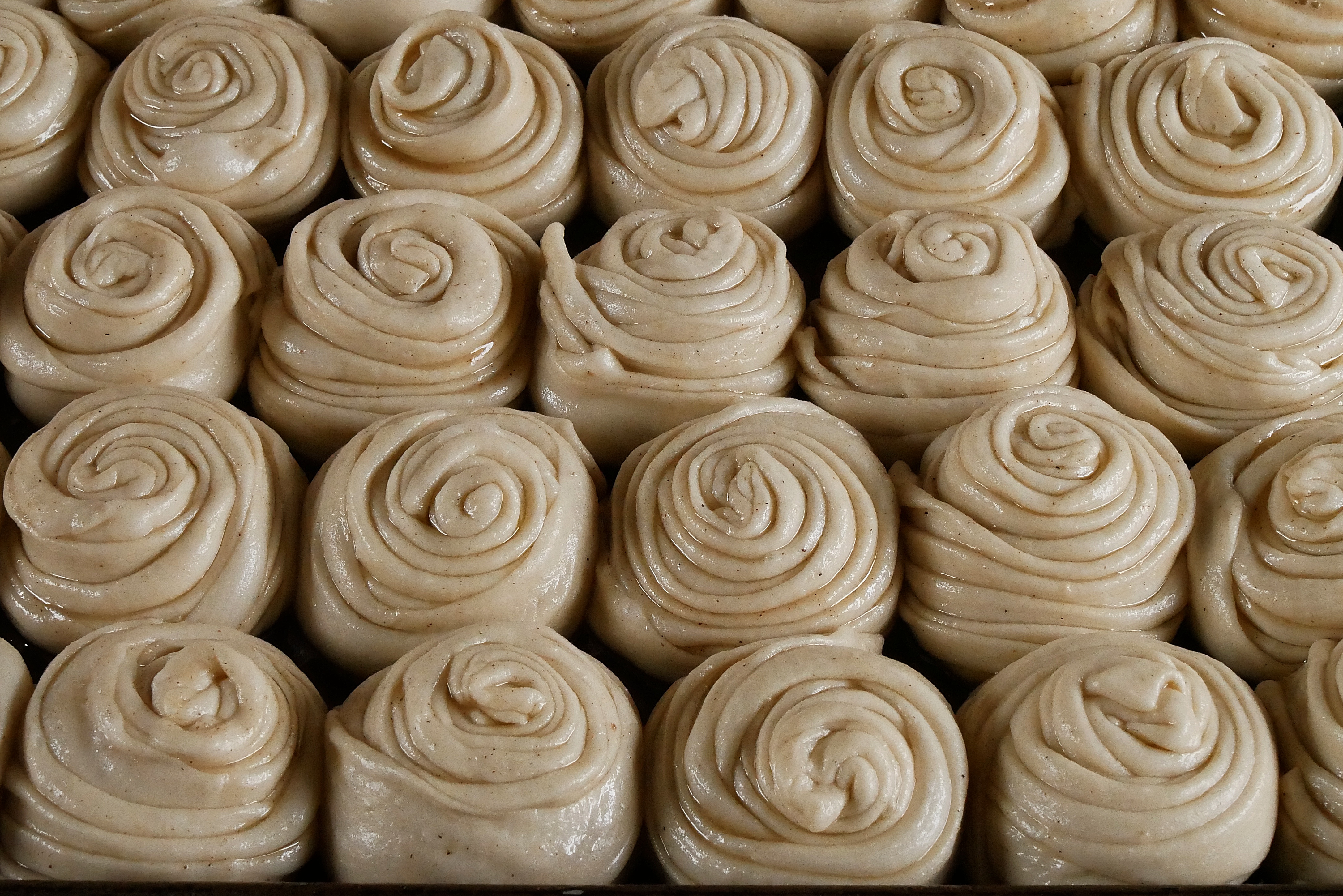 每一张手抓饼均为手工一个个将面团切割称重,再经过醒面,涂上油酥,擀卷等工序,很费时间,阿姨制作一天也就只能做出10份左右,也就是100来张。