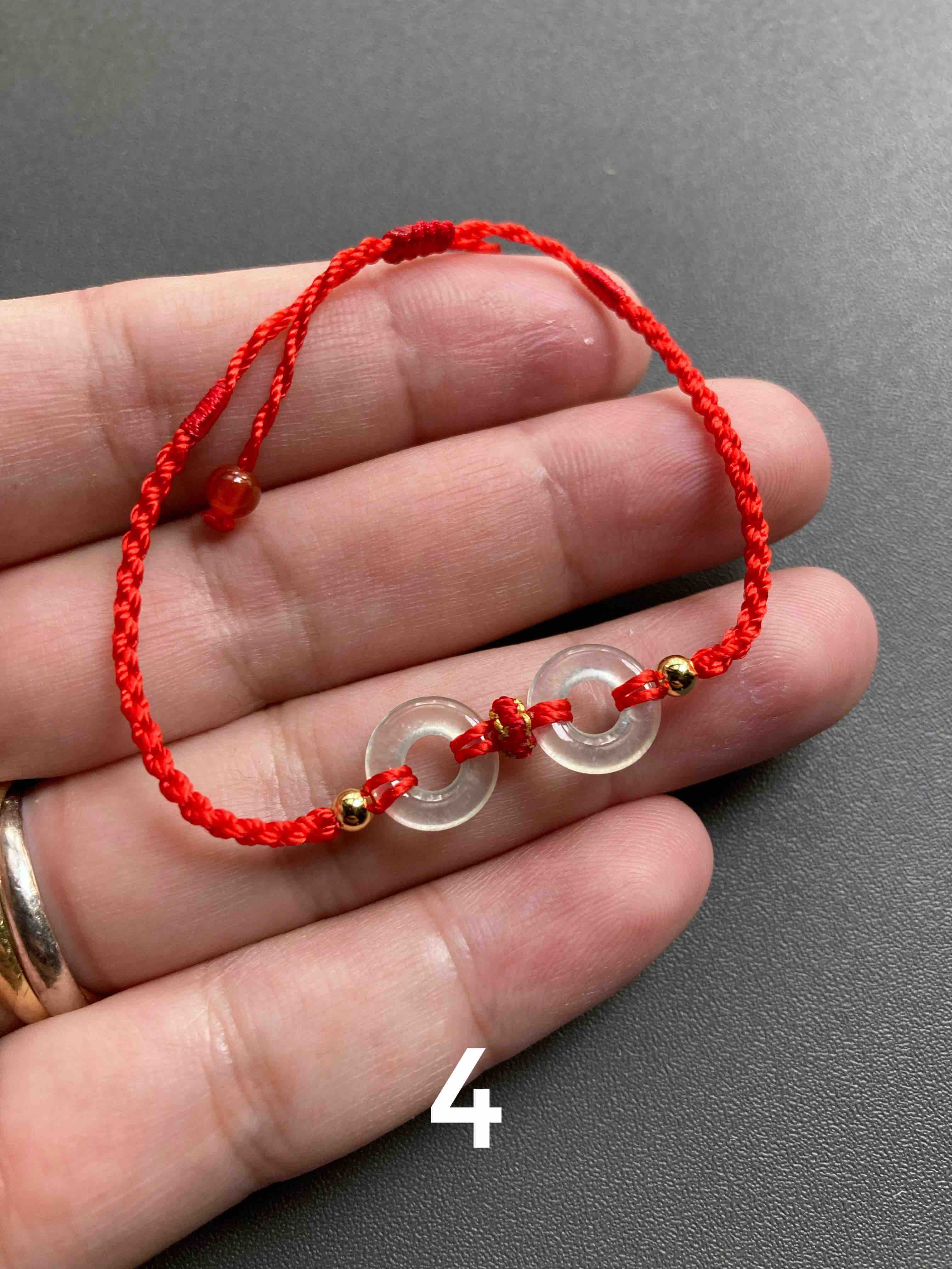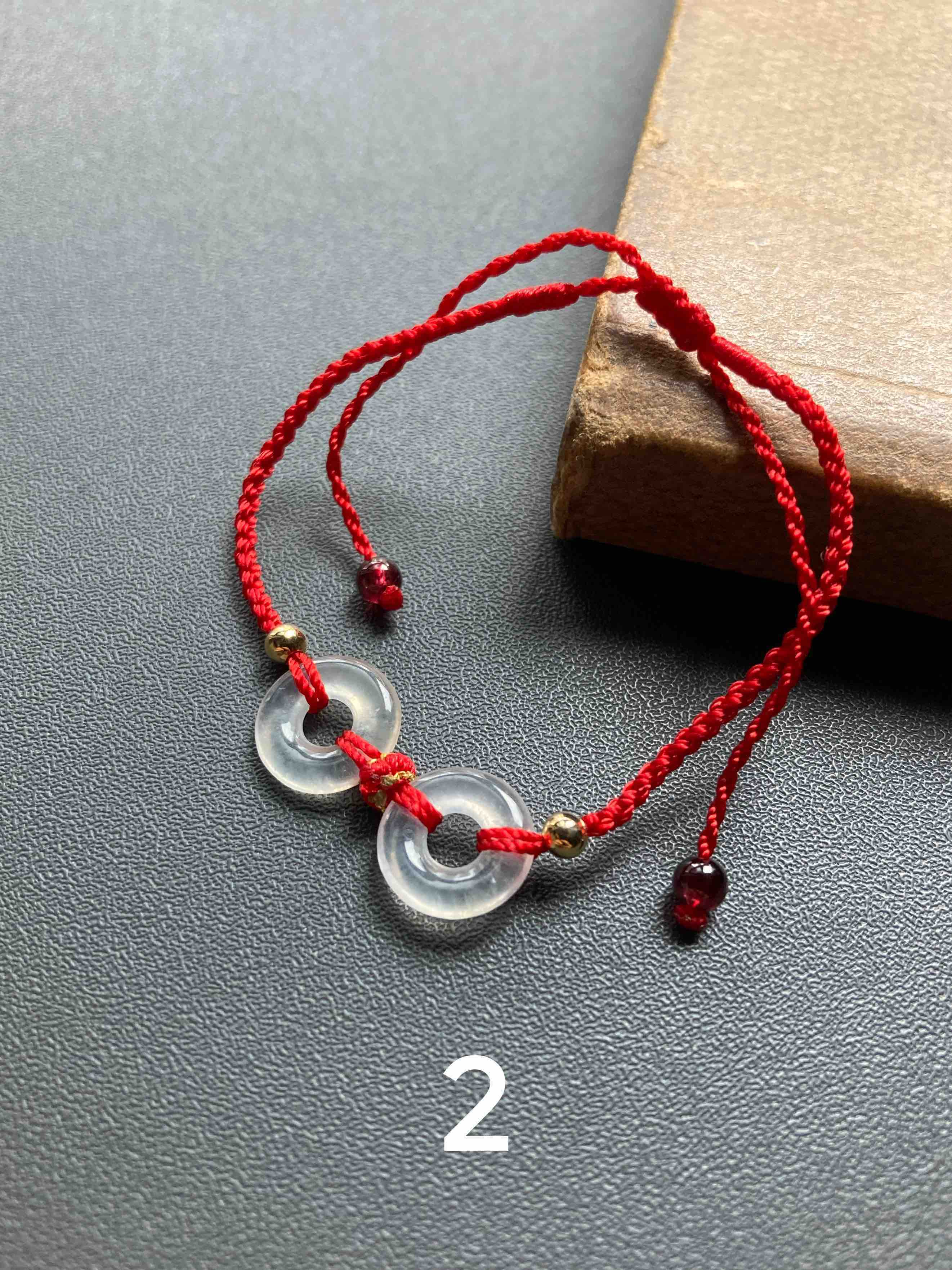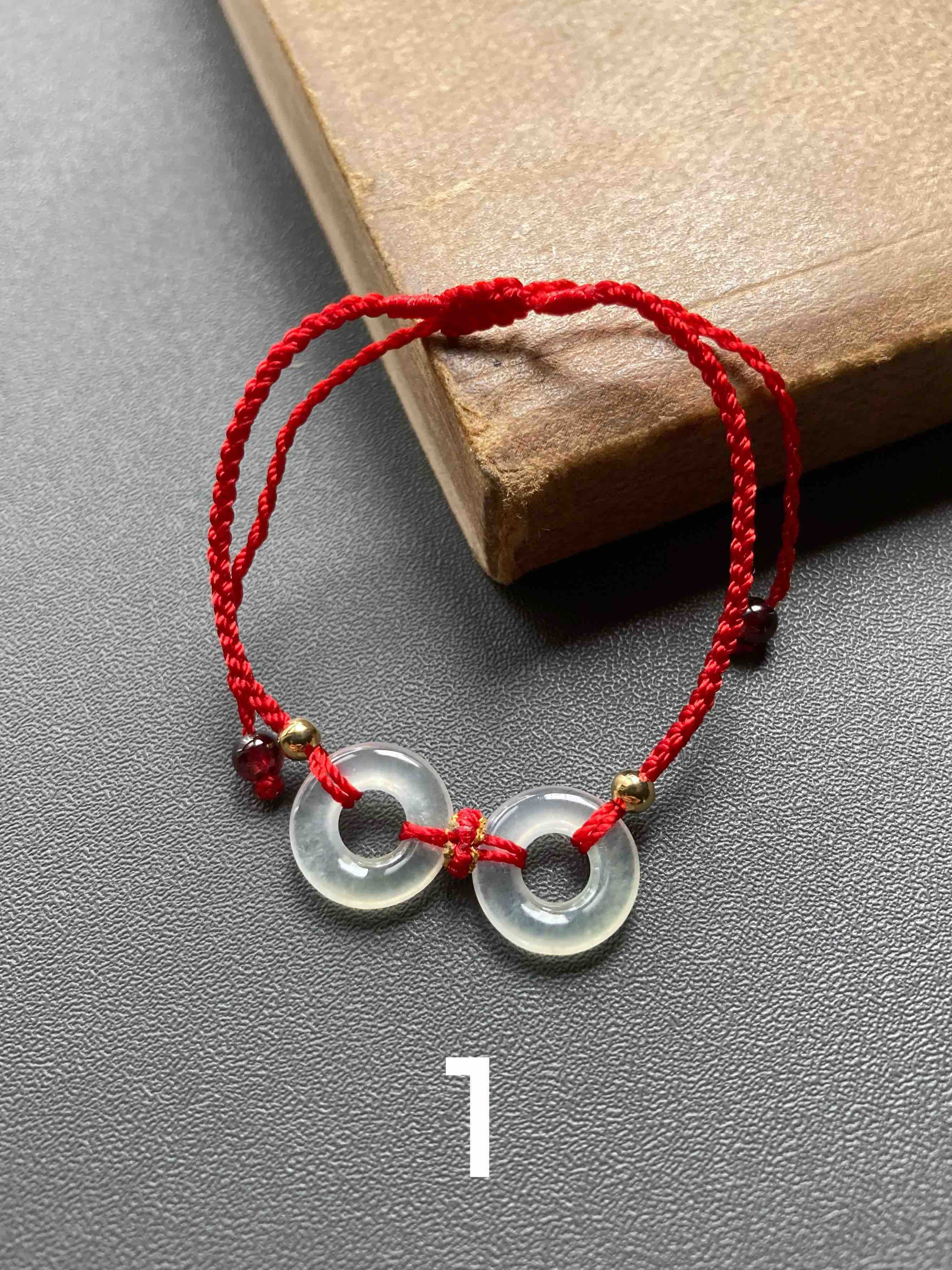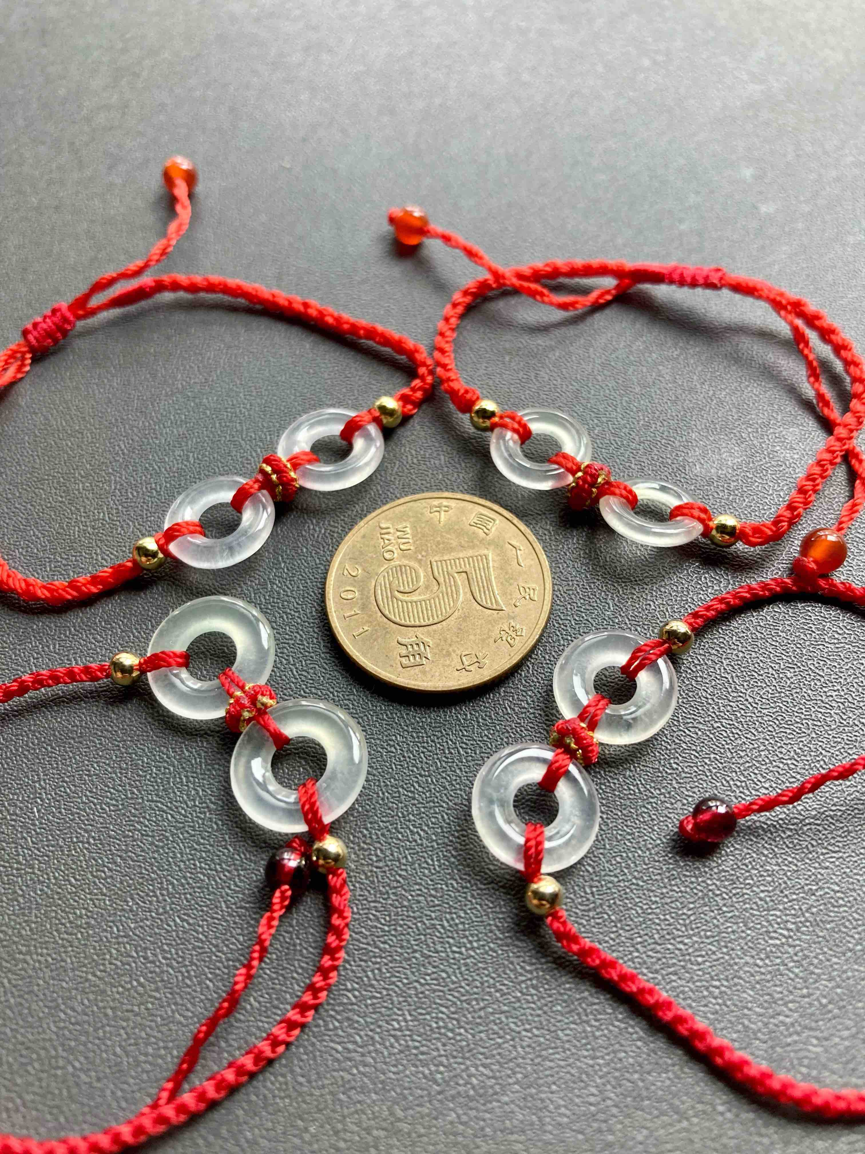 新年保平安之物,翡翠平安扣手绳,一共四条,稀有玻璃种,荧光四射,品质吊打网上的普通货色,寓意平安喜乐,好事成双。本命年戴一条,或者给家里的孩子戴上,那都是极好的,物美价廉,上次没抢到的这次手要快,目前手绳长度是按孩子的手编的,成人戴不进,如果需要成人佩戴请联系客服改长度。1号平安扣10.9mm,2号9.9mm,3号10.3mm,4号9.6mm。