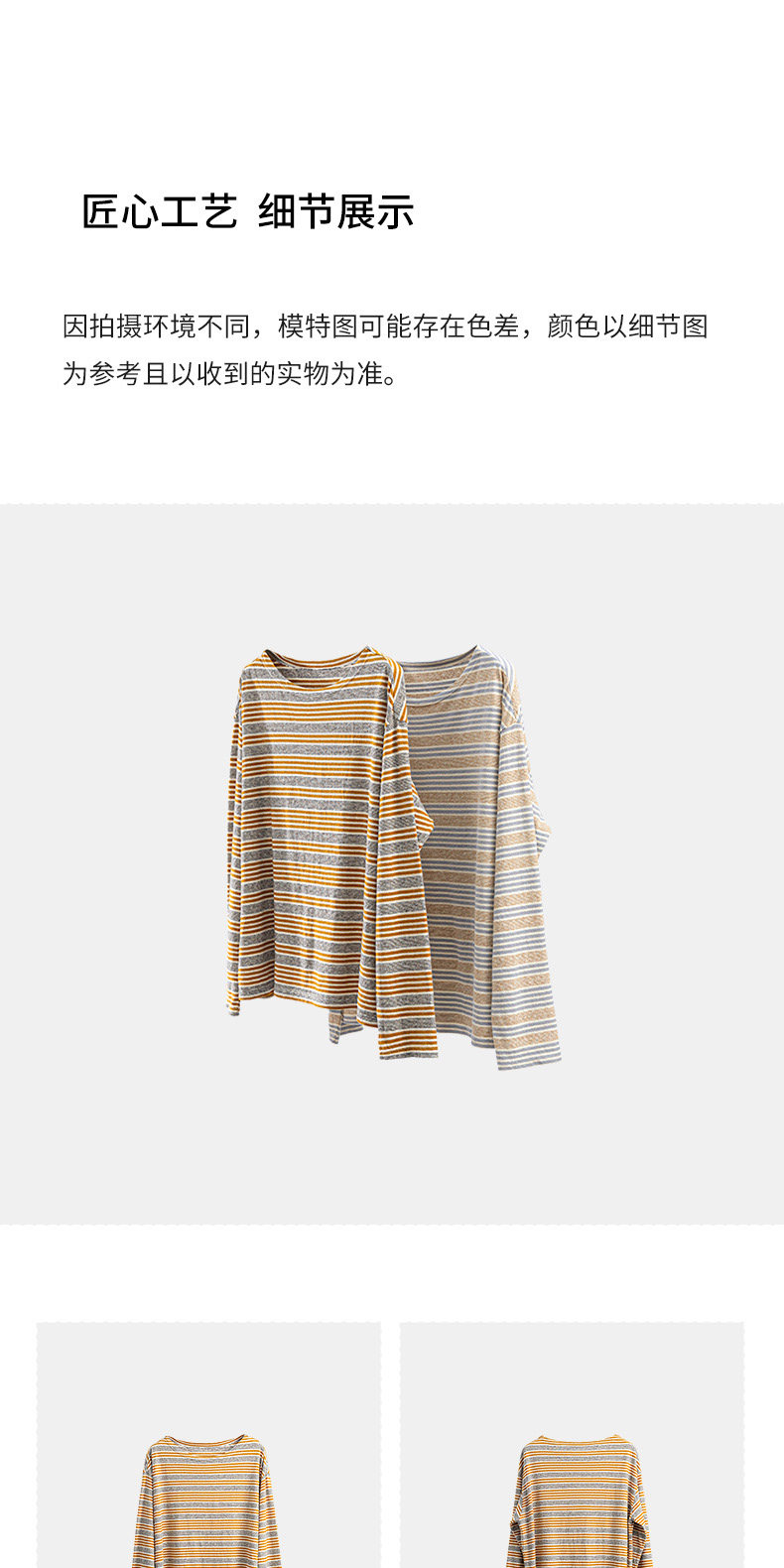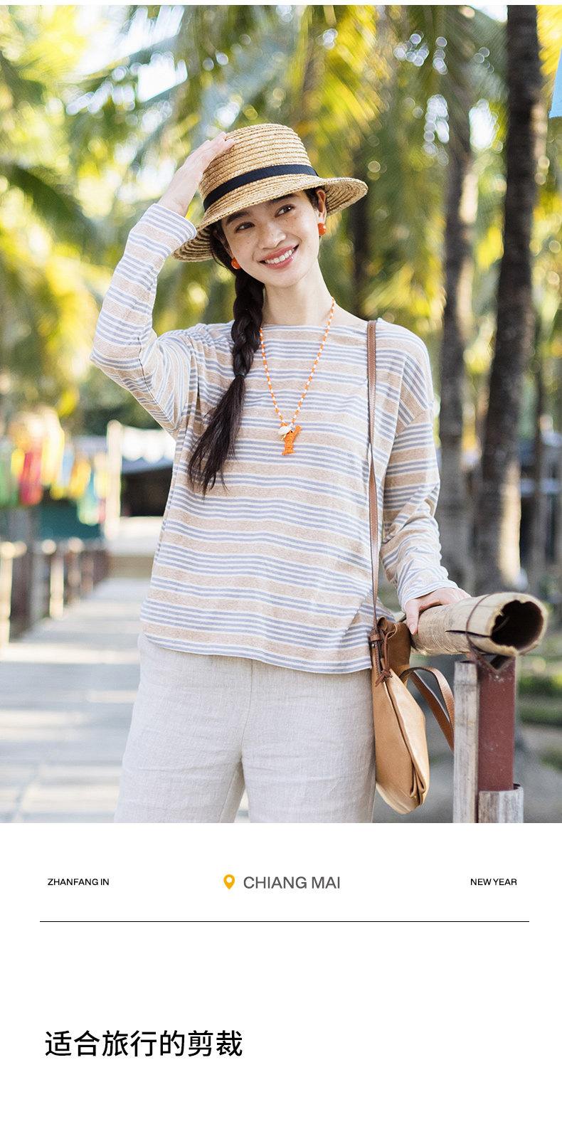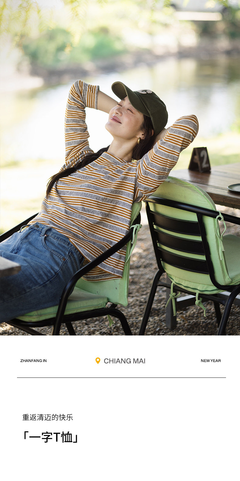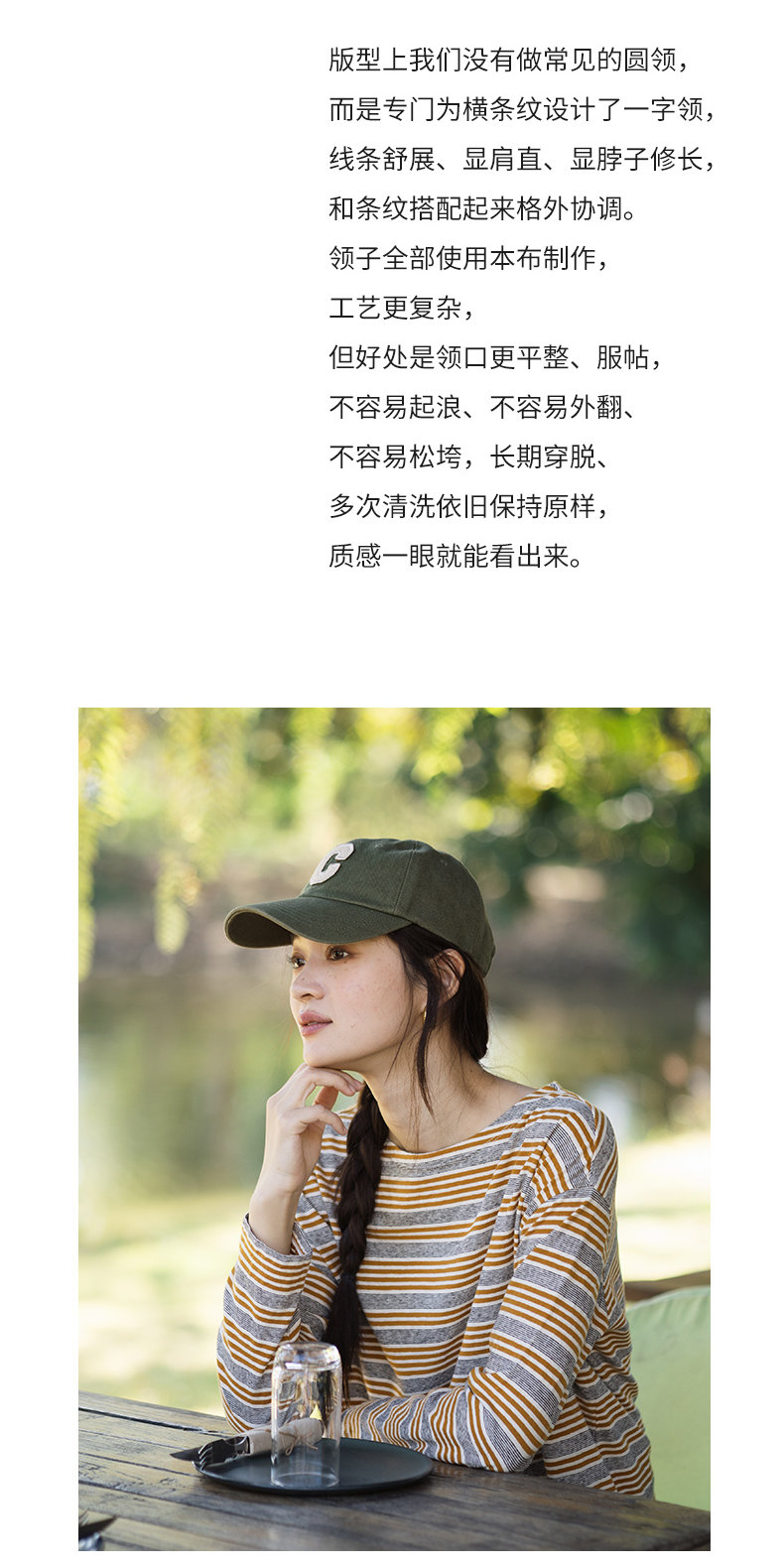 特绽放140朵/一字T*汉麻棉一字肩条纹长袖打底T恤女新款宽松上衣