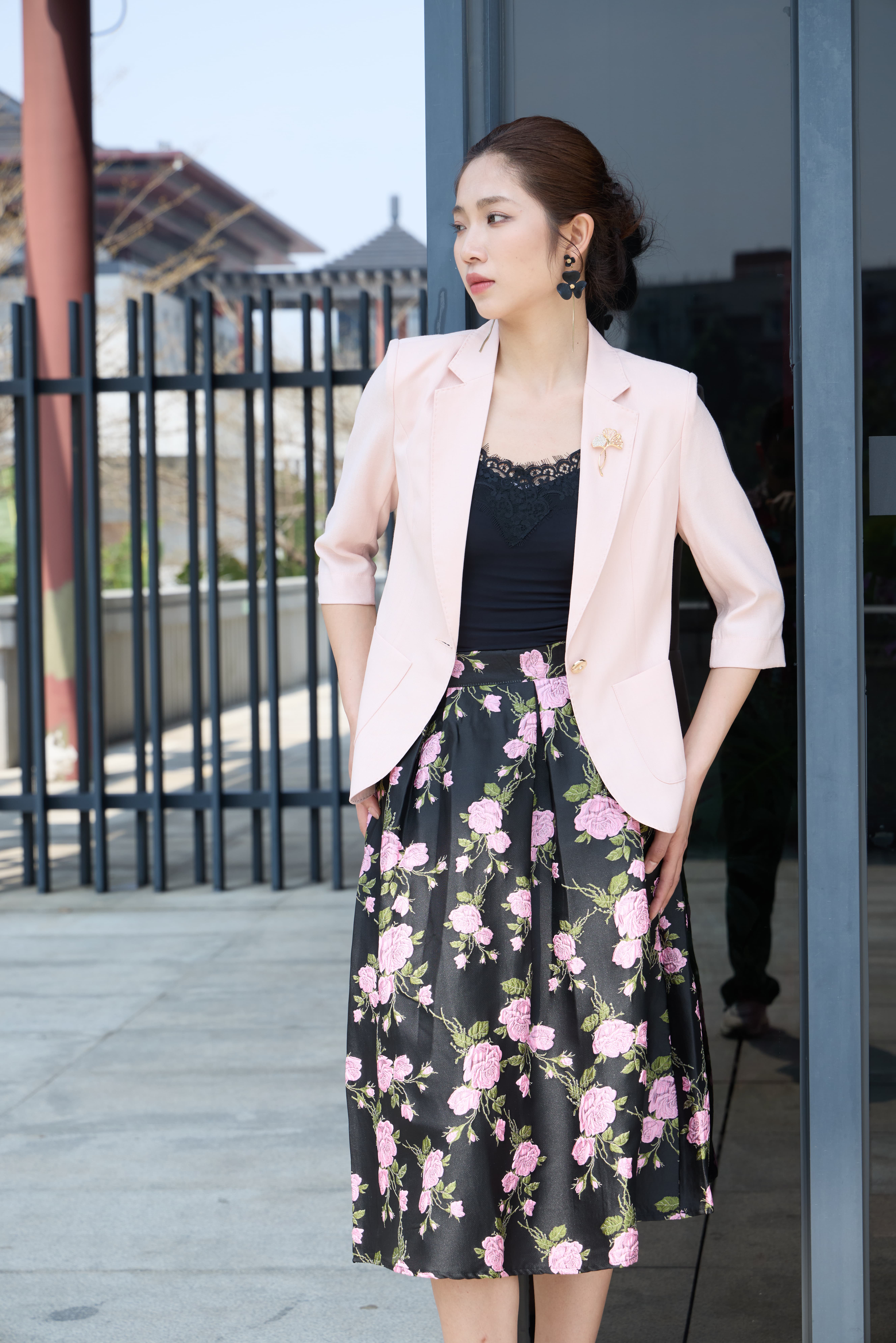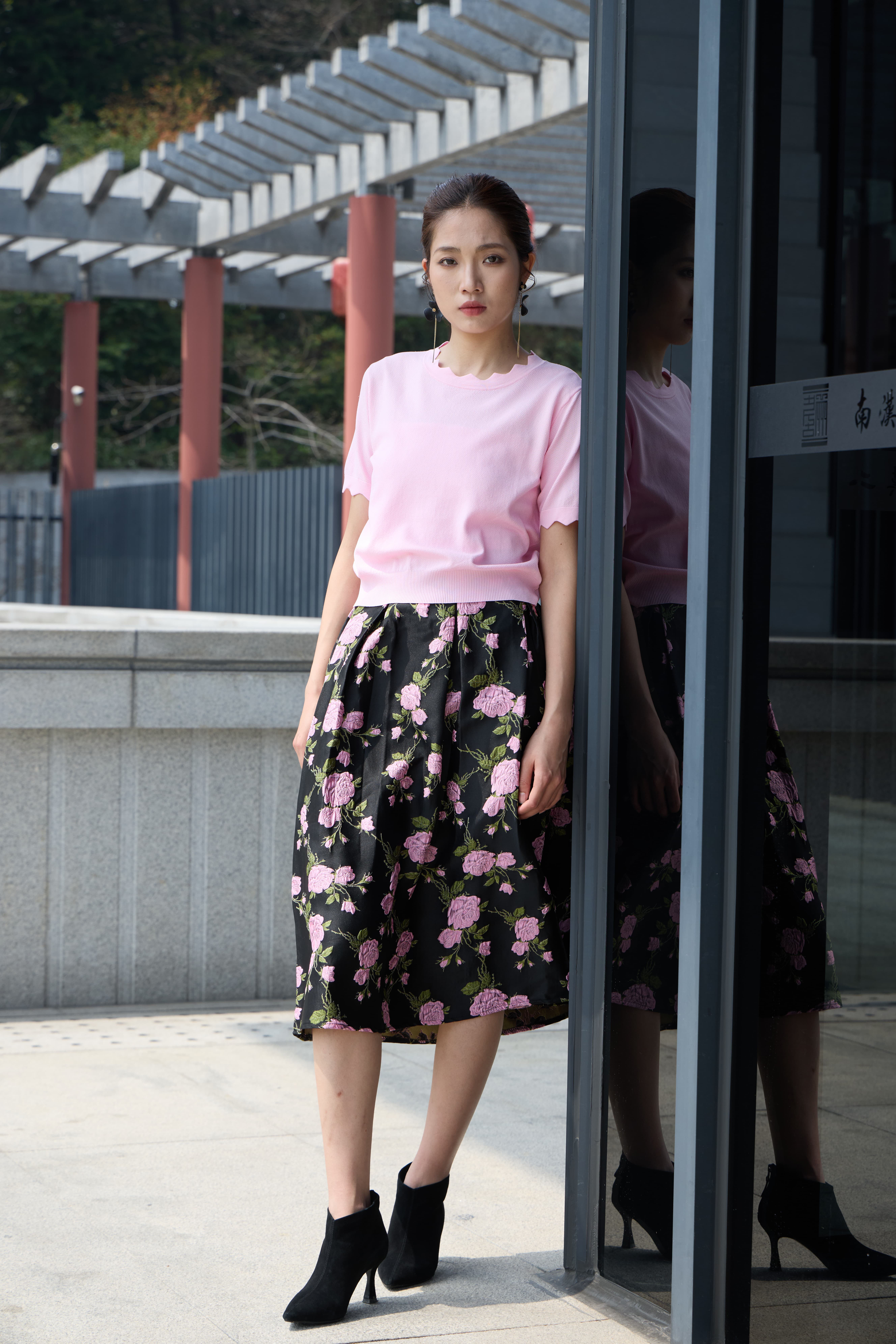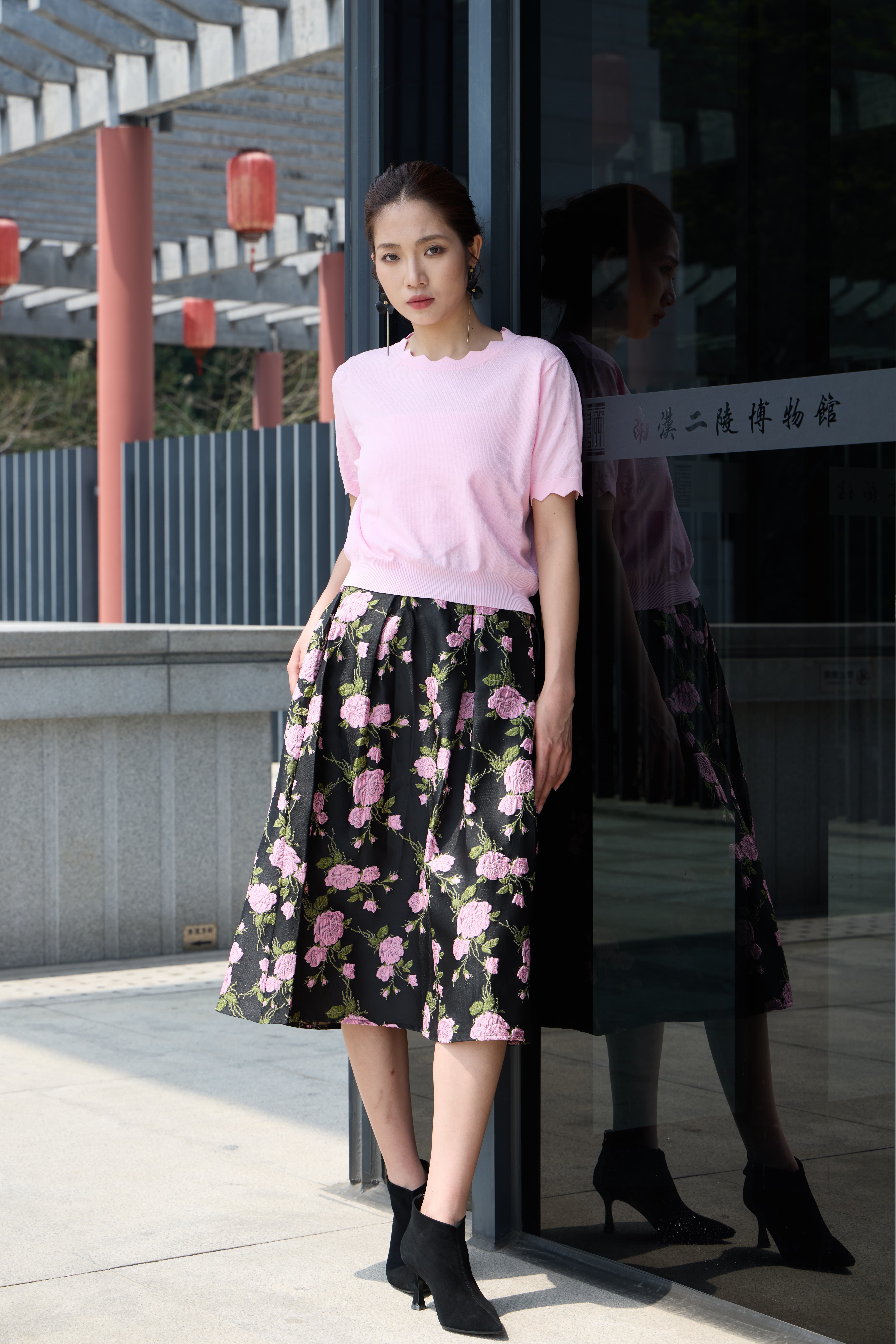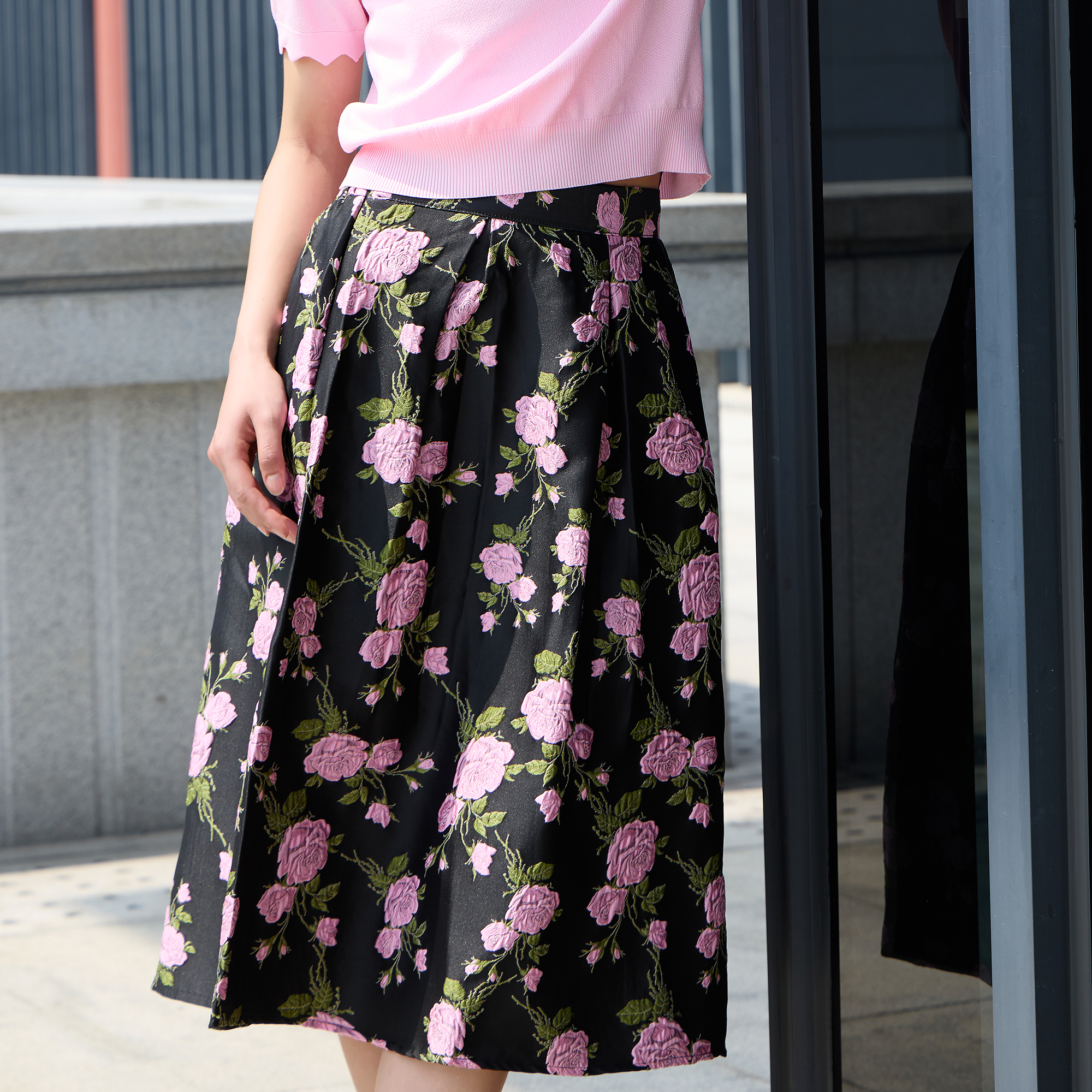 提花半裙暗藏心机,黑底衬出粉樱的灵动