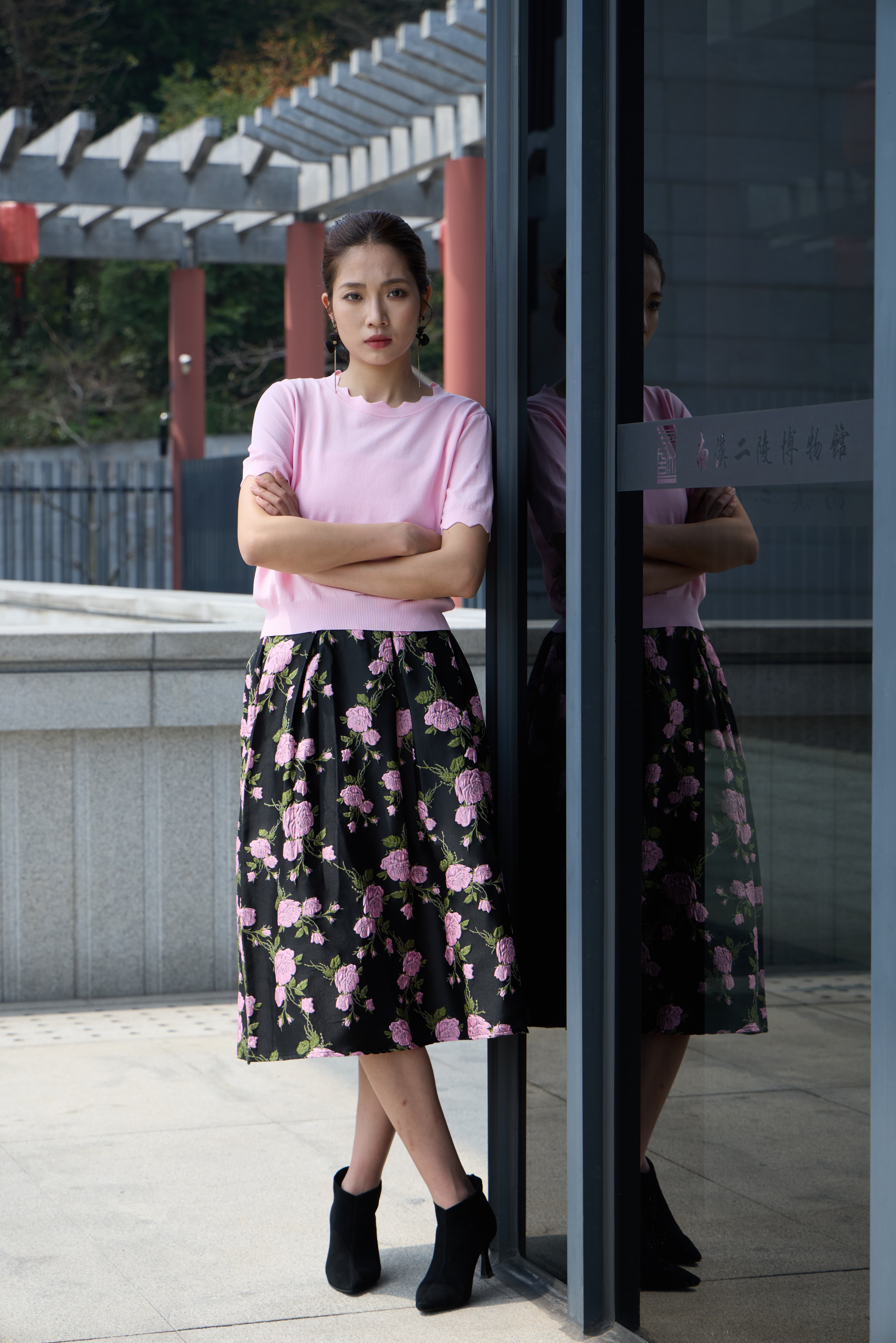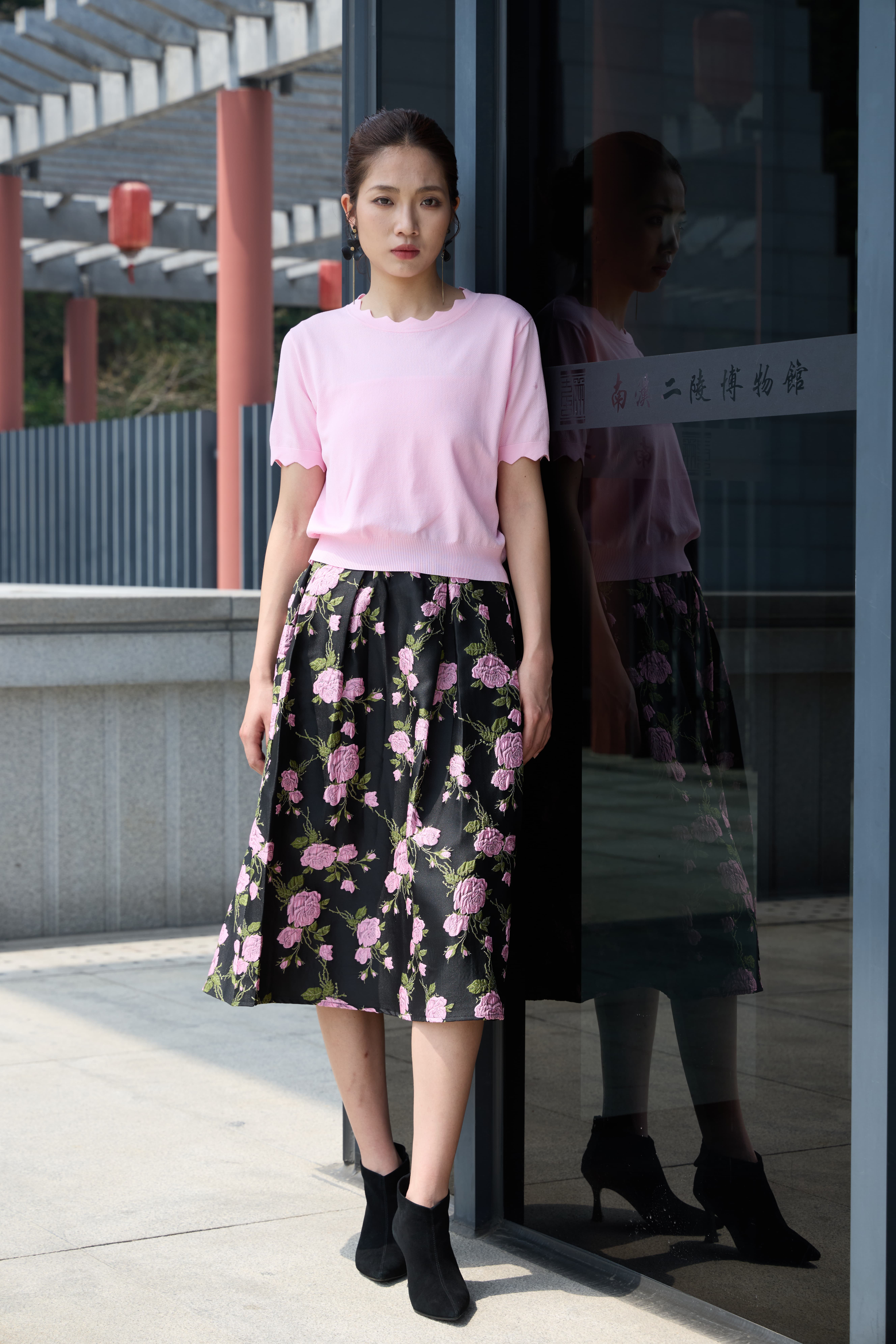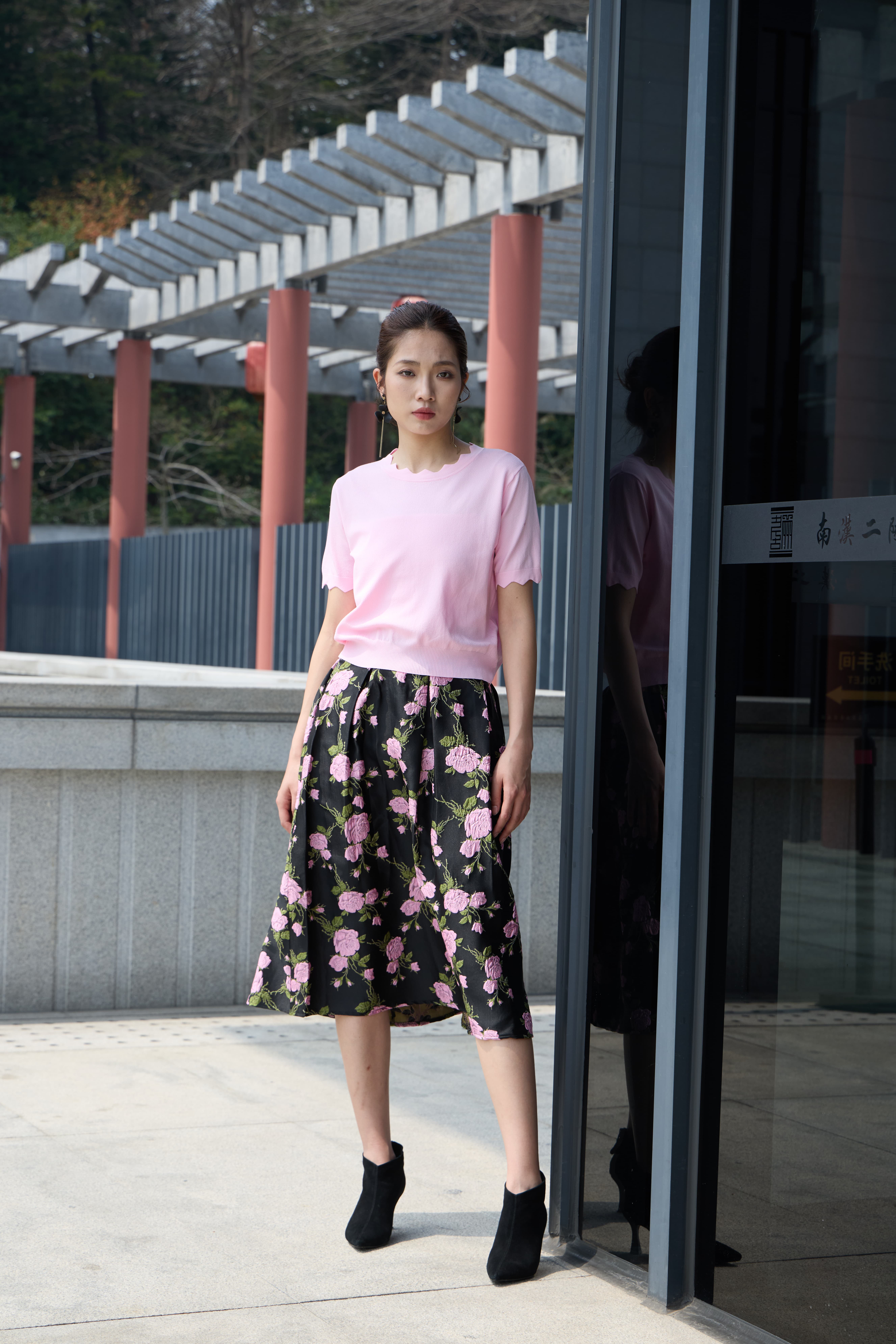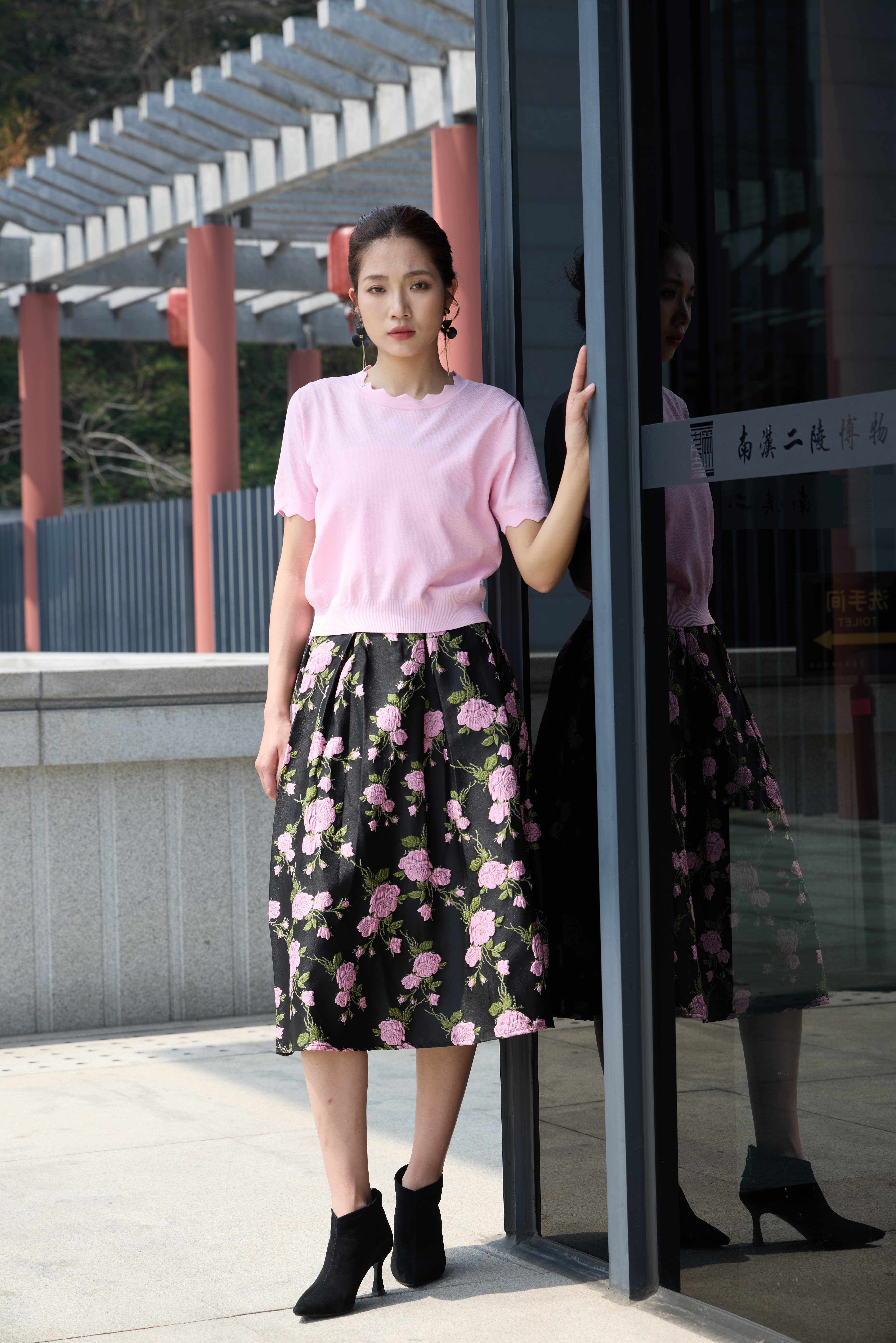 提花半裙暗藏心机,黑底衬出粉樱的灵动