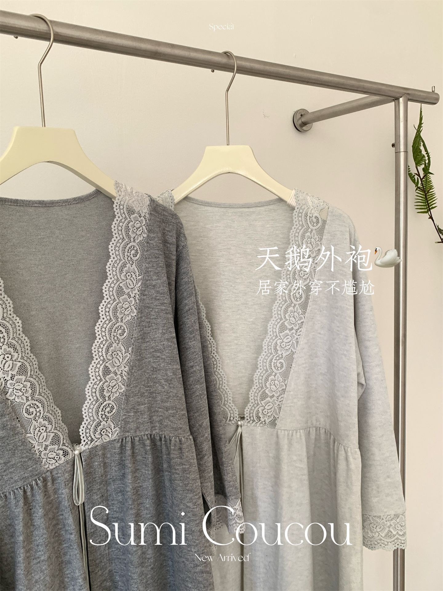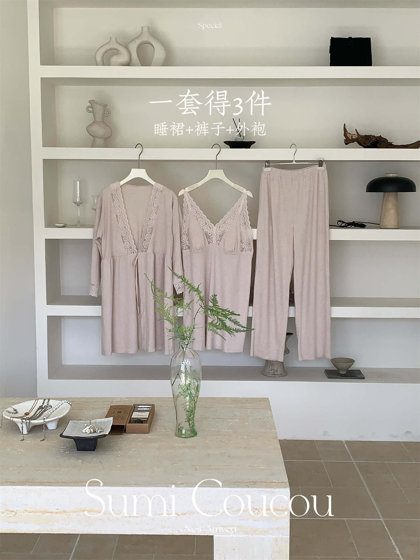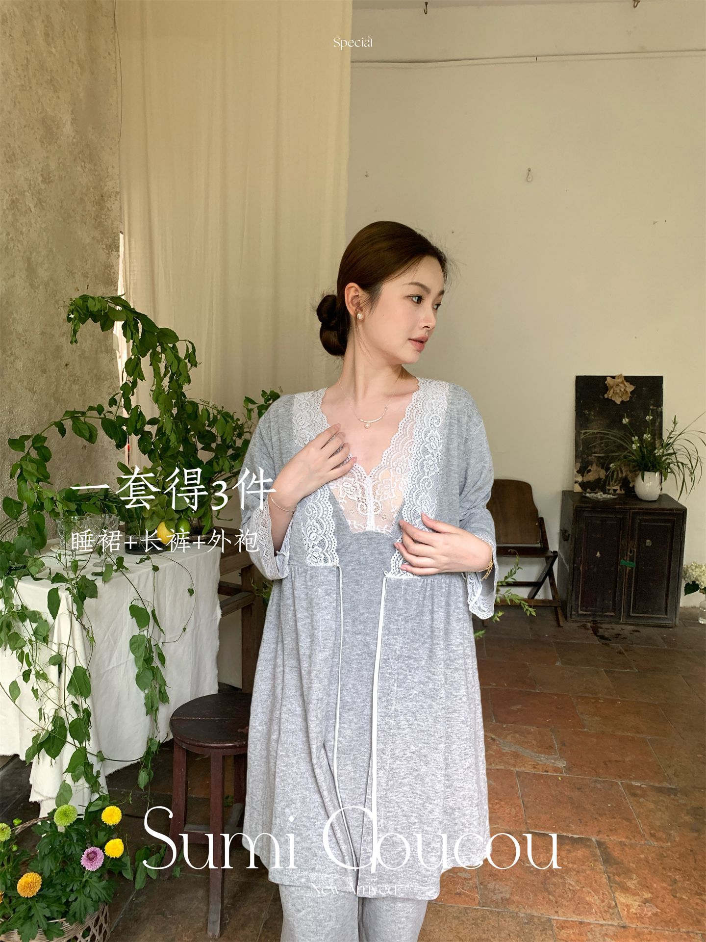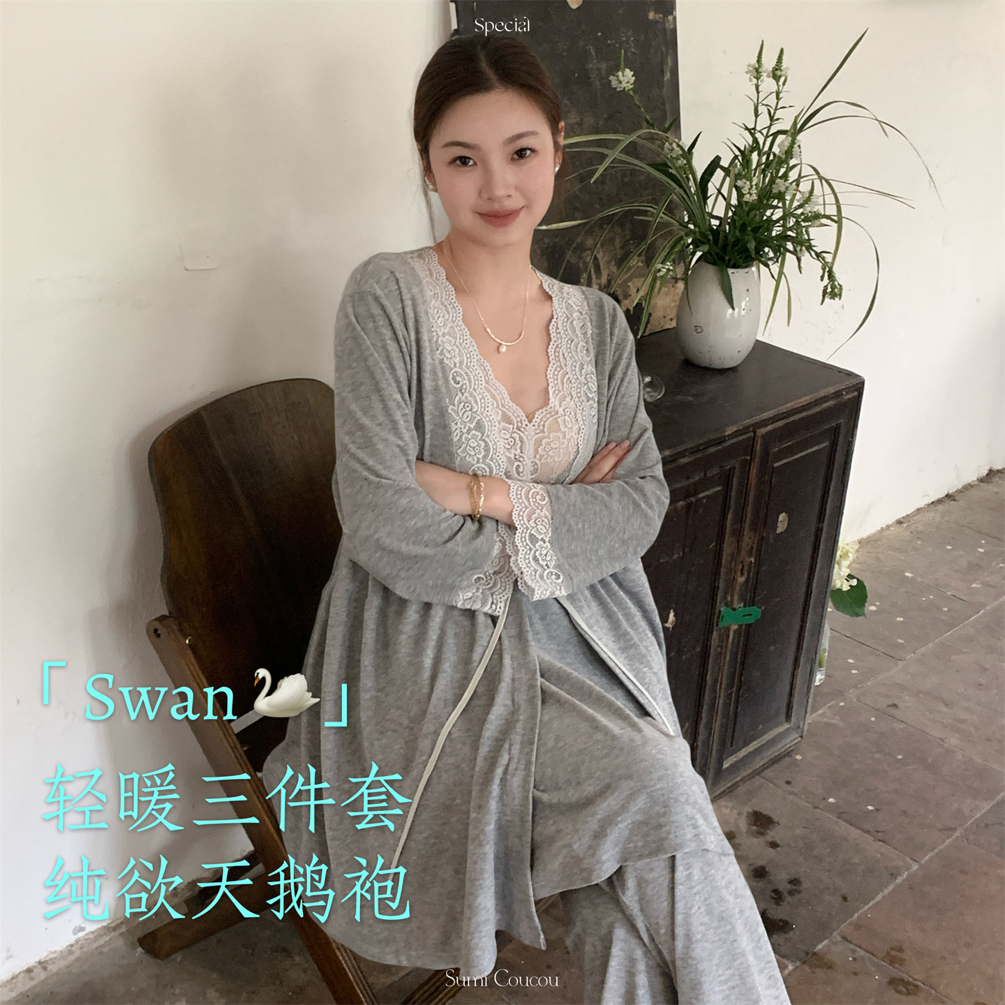 轻暖三件套!秋冬天鹅袍睡衣三件套 睡裙+裤子+外袍性感带胸垫睡袍家居服法式蕾丝秋冬季